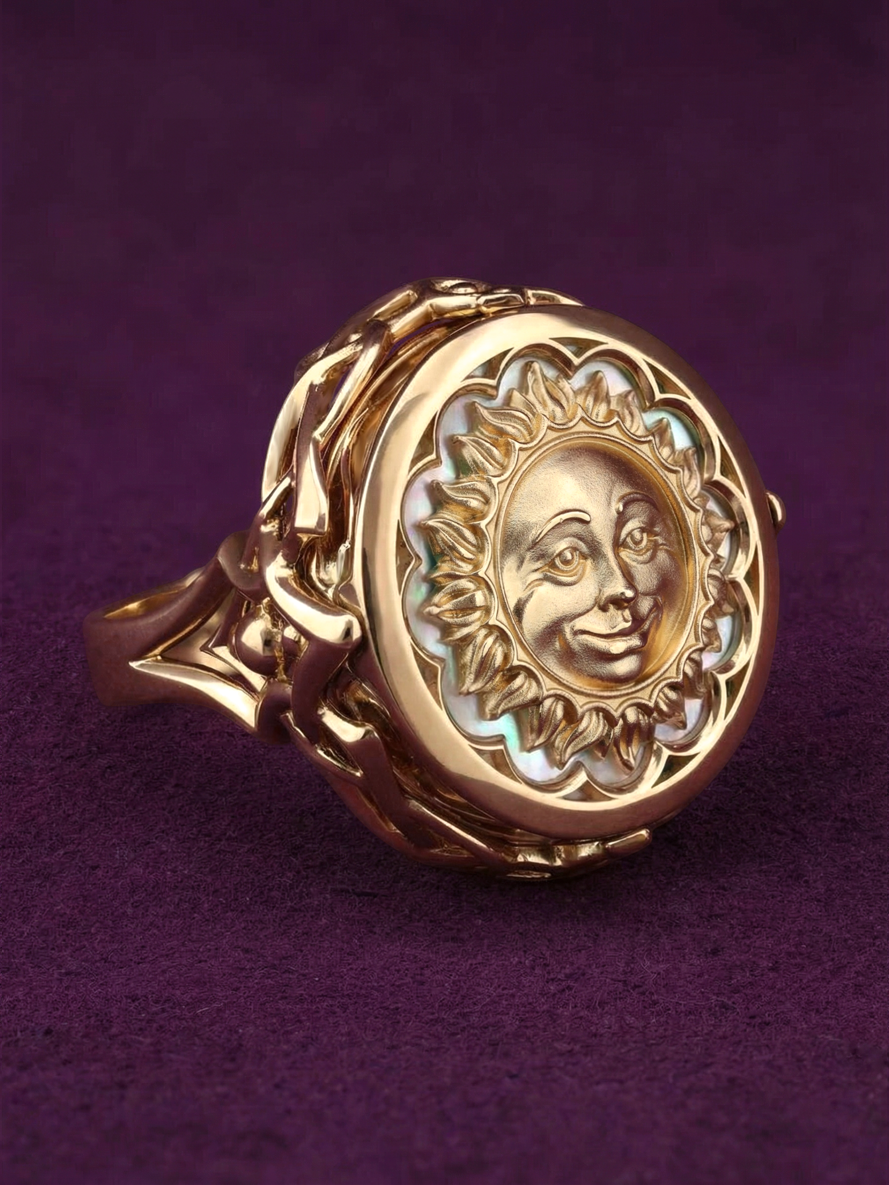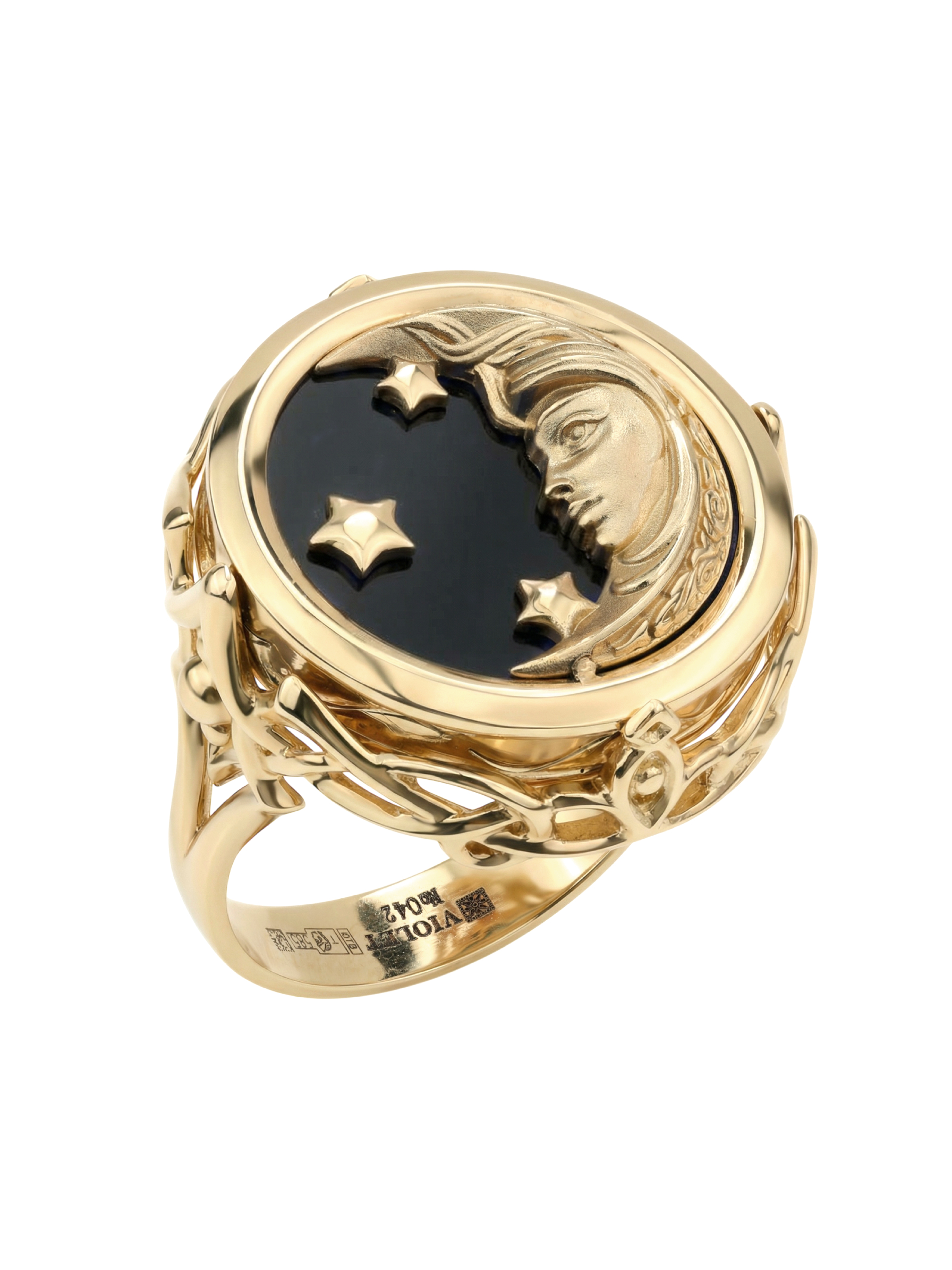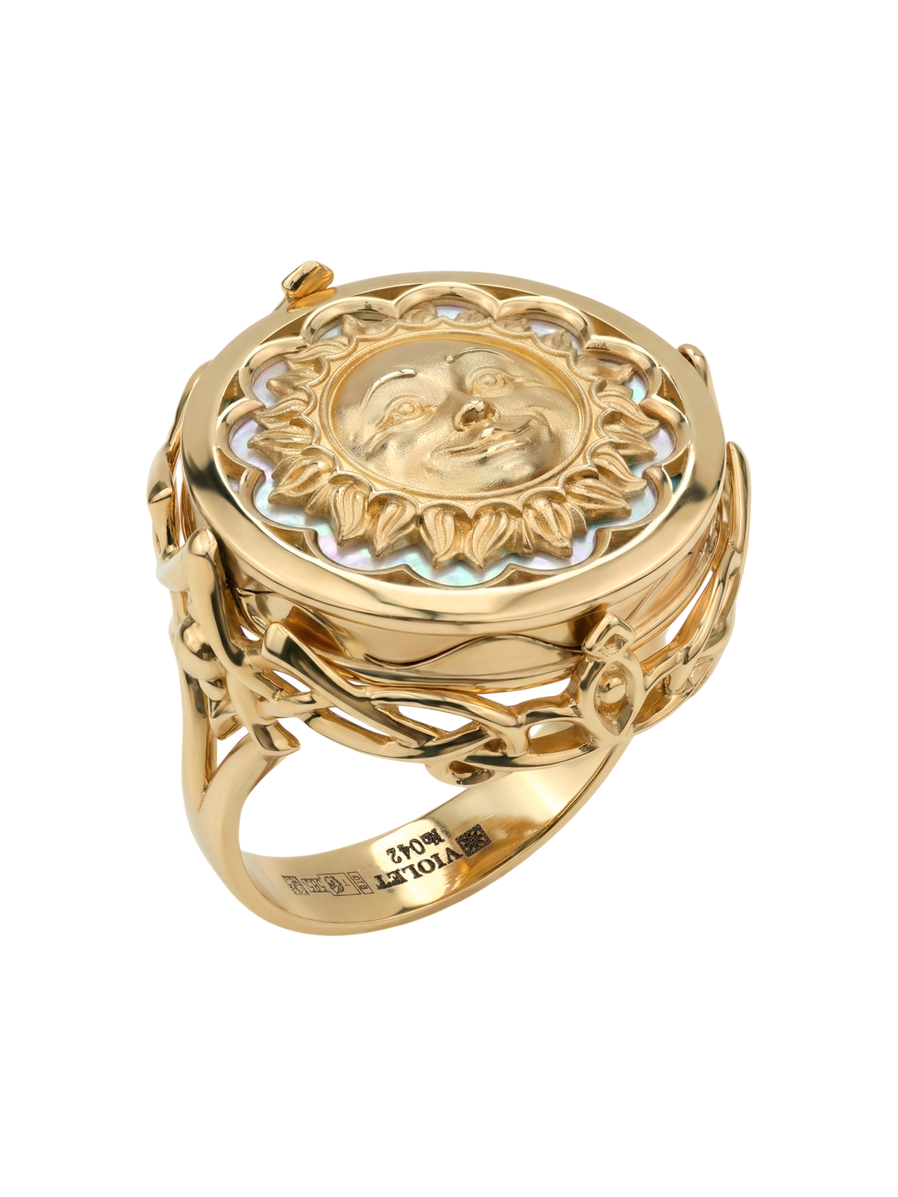 Кольцо из красного золота 585 пробы из коллекции De luxe Premium — День и ночь — это ювелирное произведение искусства, воплощающее мистическую гармонию ночи. Дизайн украшения, выполненный в тематике солнце/луна, притягивает взгляд своей глубокой символикой и филигранной детализацией. Центральным элементом композиции является вставка круглой формы, сочетающая в себе магический черный оникс и нежное сияние перламутра.