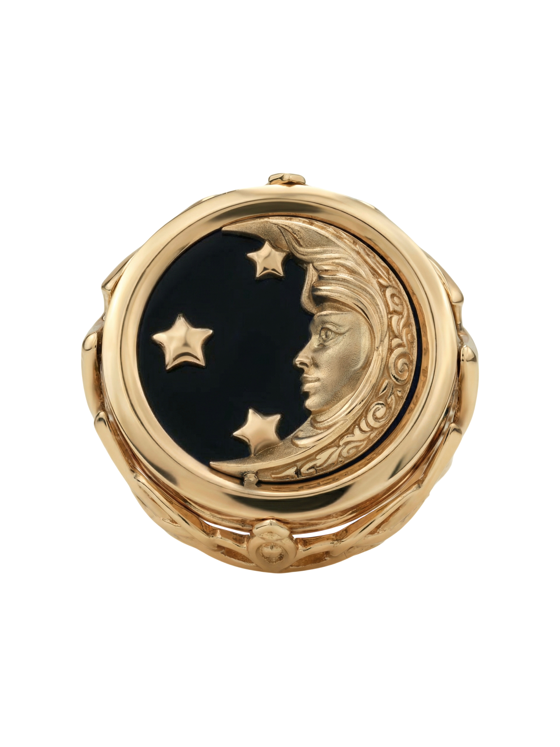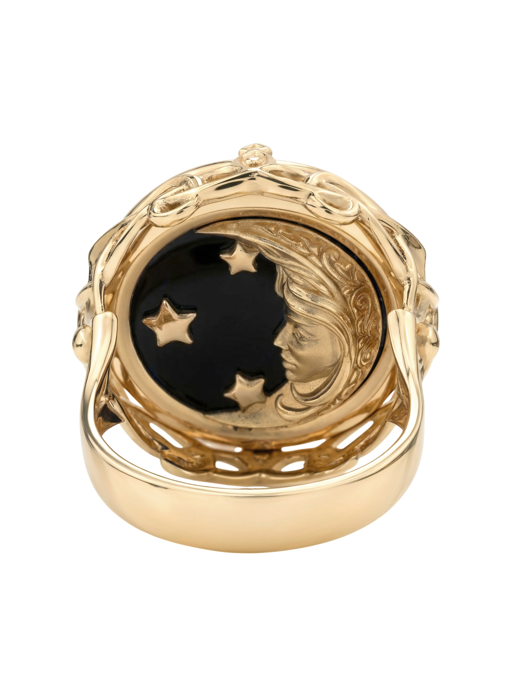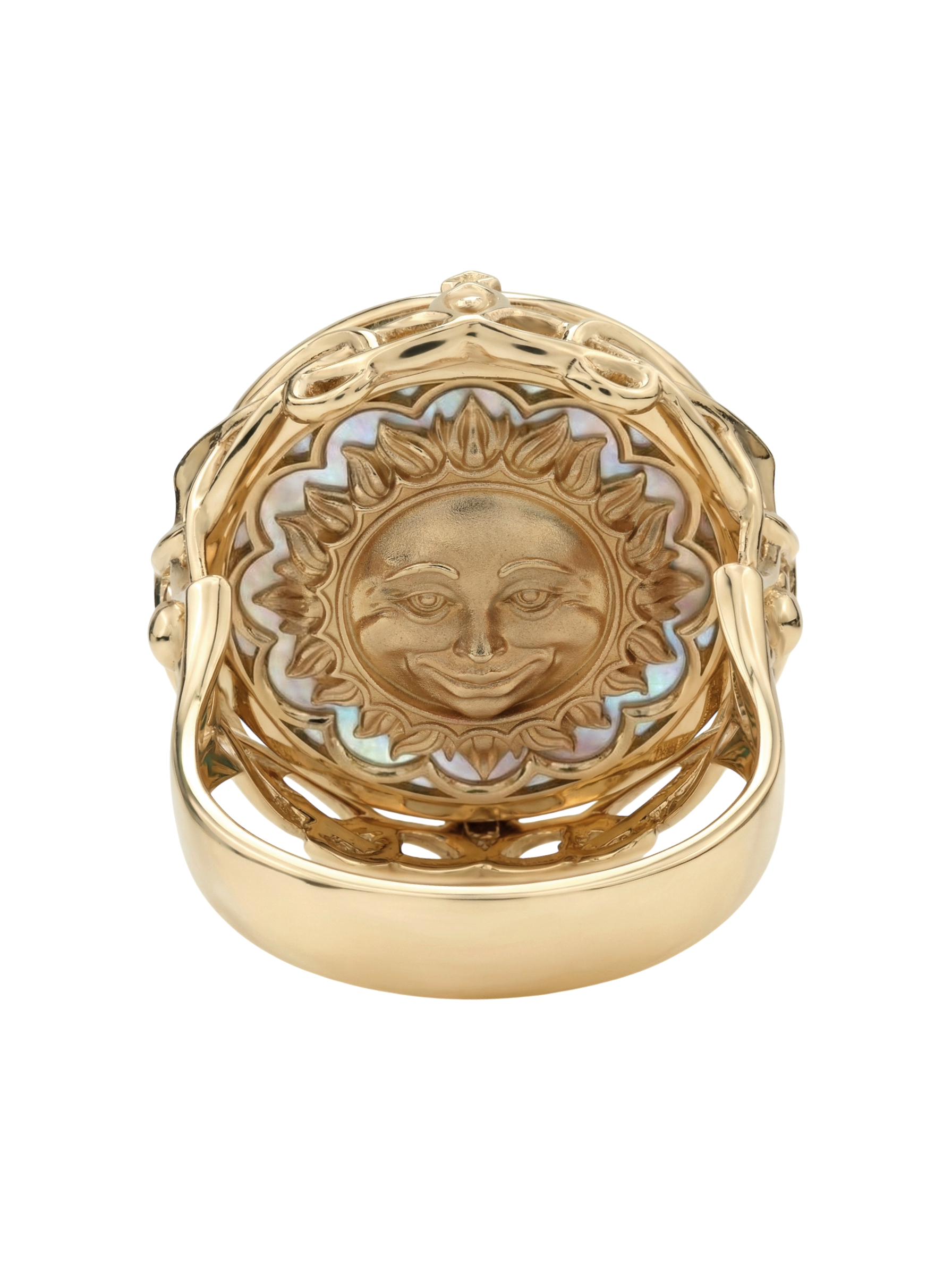 Кольцо из красного золота 585 пробы из коллекции De luxe Premium — День и ночь — это ювелирное произведение искусства, воплощающее мистическую гармонию ночи. Дизайн украшения, выполненный в тематике солнце/луна, притягивает взгляд своей глубокой символикой и филигранной детализацией. Центральным элементом композиции является вставка круглой формы, сочетающая в себе магический черный оникс и нежное сияние перламутра.