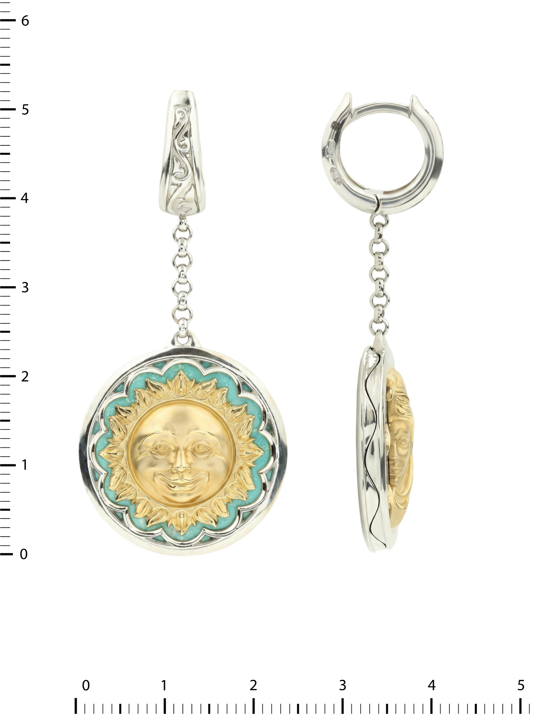 Центральная композиция изделия представляет собой символичный дизайн солнце и луна. В одной серьге яркое солнце обрамлено бирюзой, чей бирюзовый оттенок подчеркивает тепло и сияние золотого рельефа. Вторая серьга воплощает ночную эстетику: здесь глубокий синий лазурит становится фоном для изящного полумесяца и звезд. Каждая вставка имеет круглую форму, что придает украшению гармоничный и завершенный вид. Всего в изделии использовано 2 вставки, акцентирующие внимание на мастерстве исполнения.