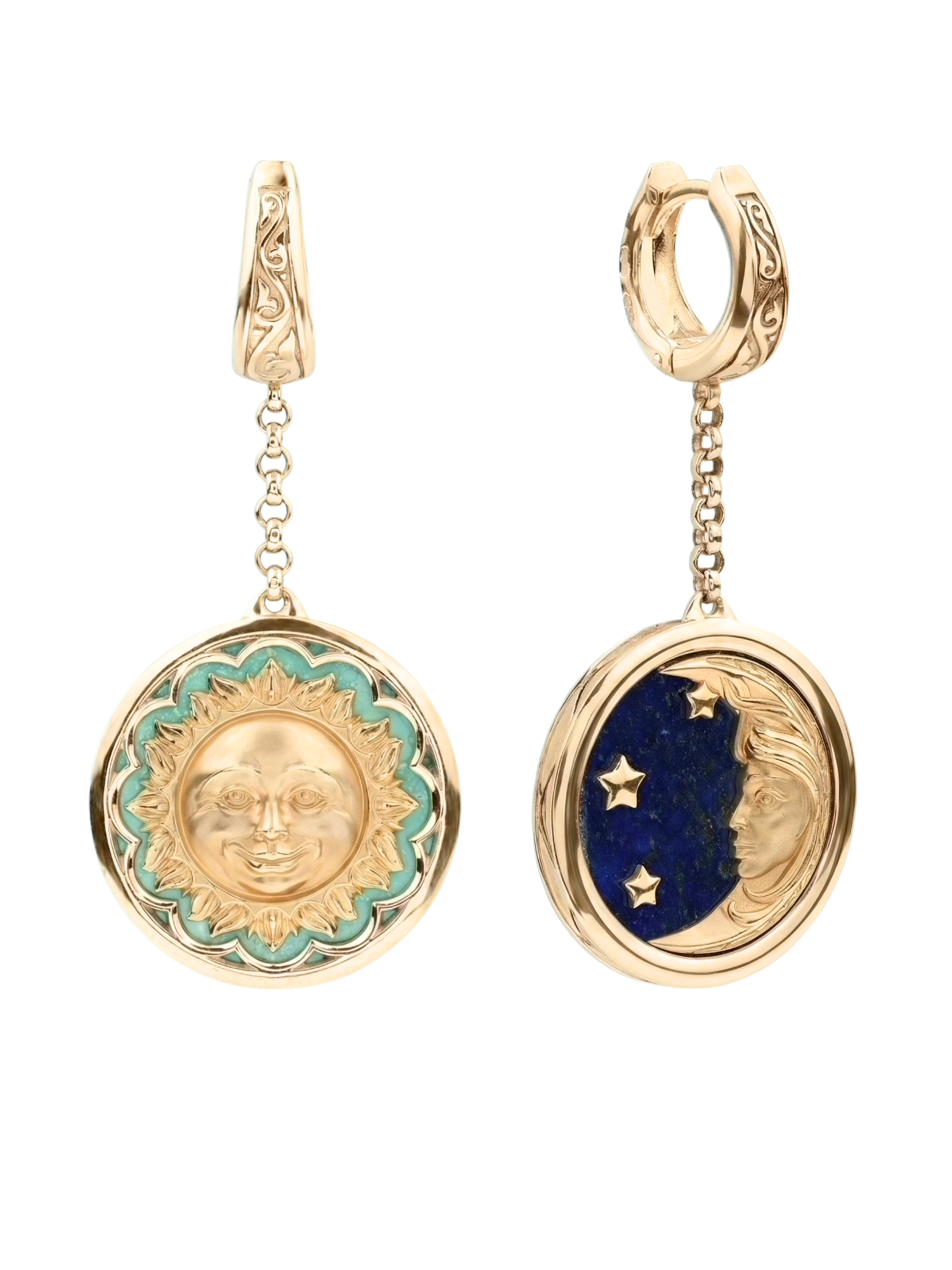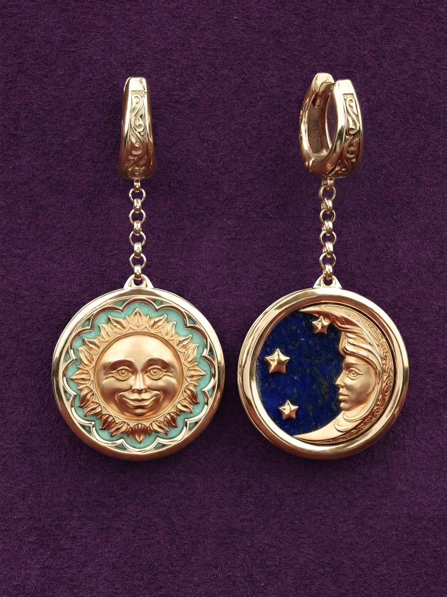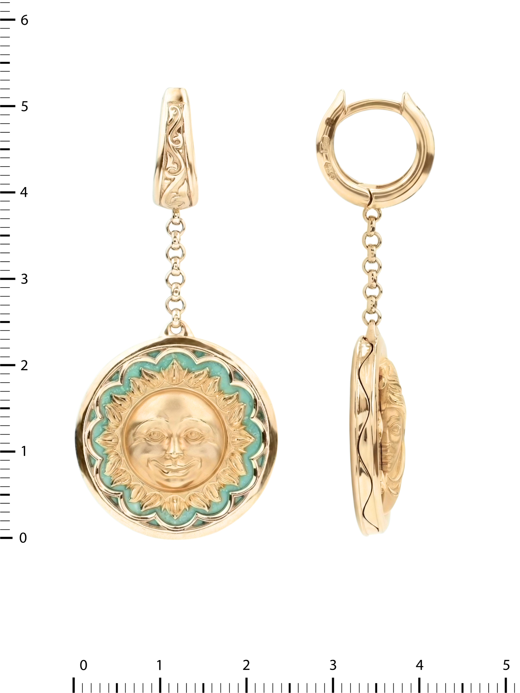 Эти уникальные серьги из красного золота 585 пробы станут воплощением стиля и утонченного вкуса. Изделие входит в коллекцию De luxe Premium — День и ночь, дизайн которой вдохновлен вечной гармонией солнца и луны. Каждая серьга в паре выполнена с особым вниманием к деталям: одна сторона представляет собой сияющее солнце на фоне нежной бирюзы, а другая — таинственный полумесяц на глубоком лазурите.