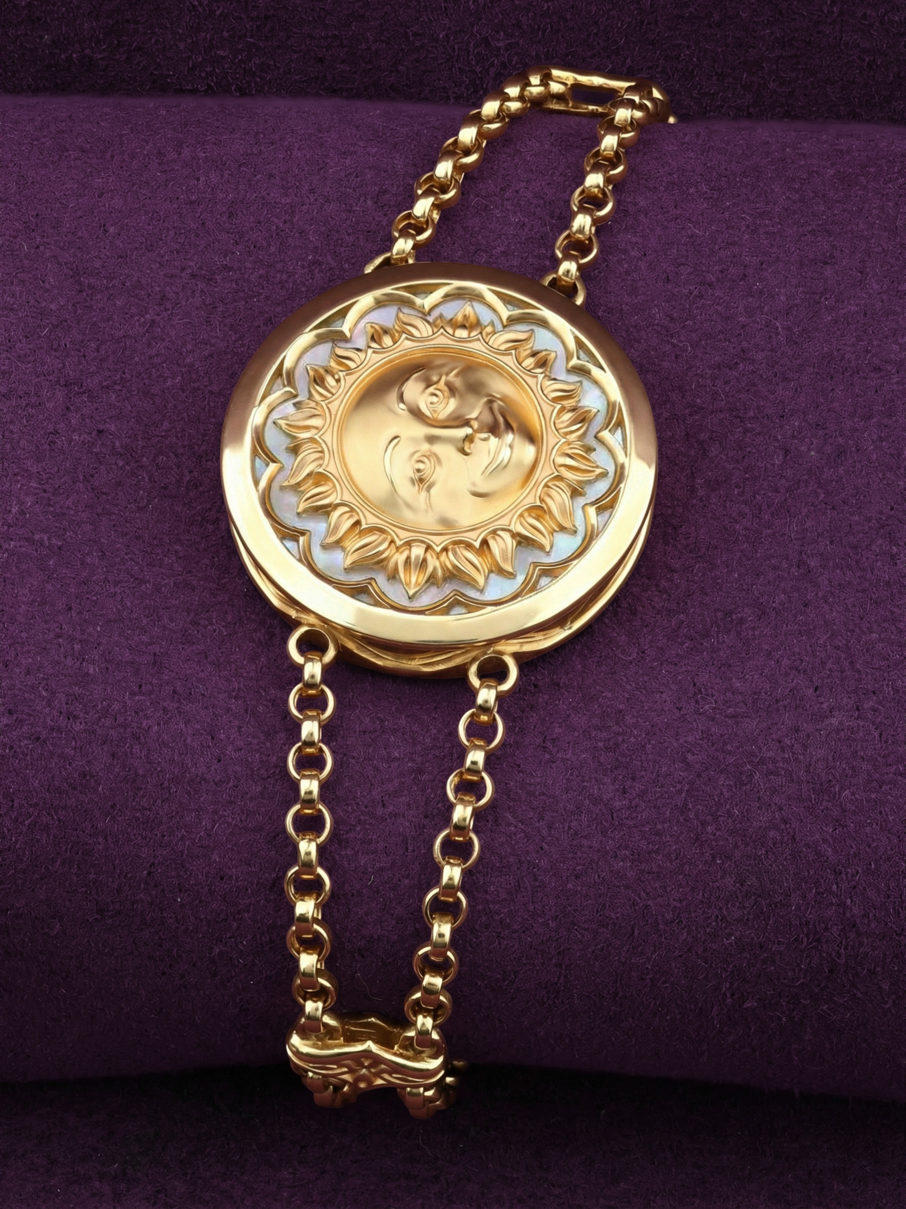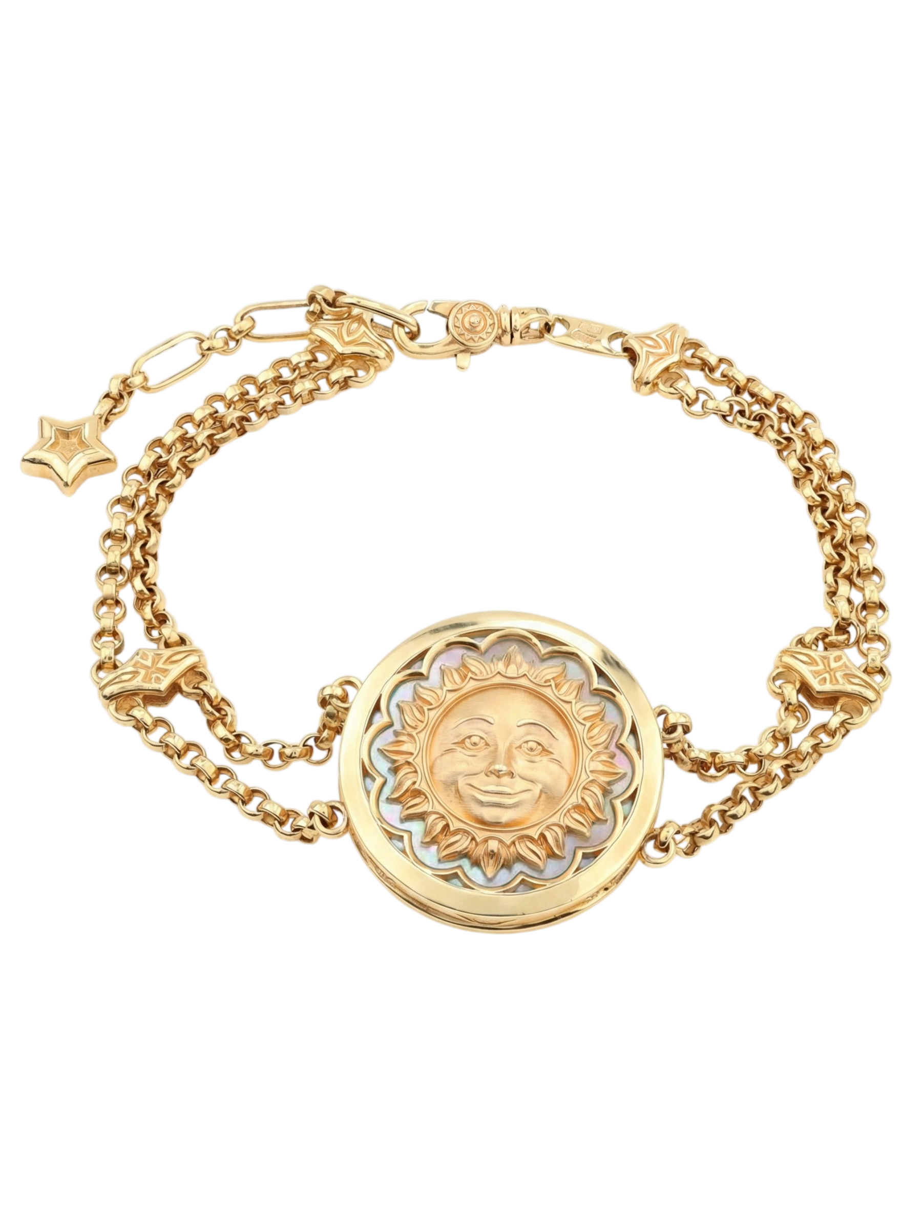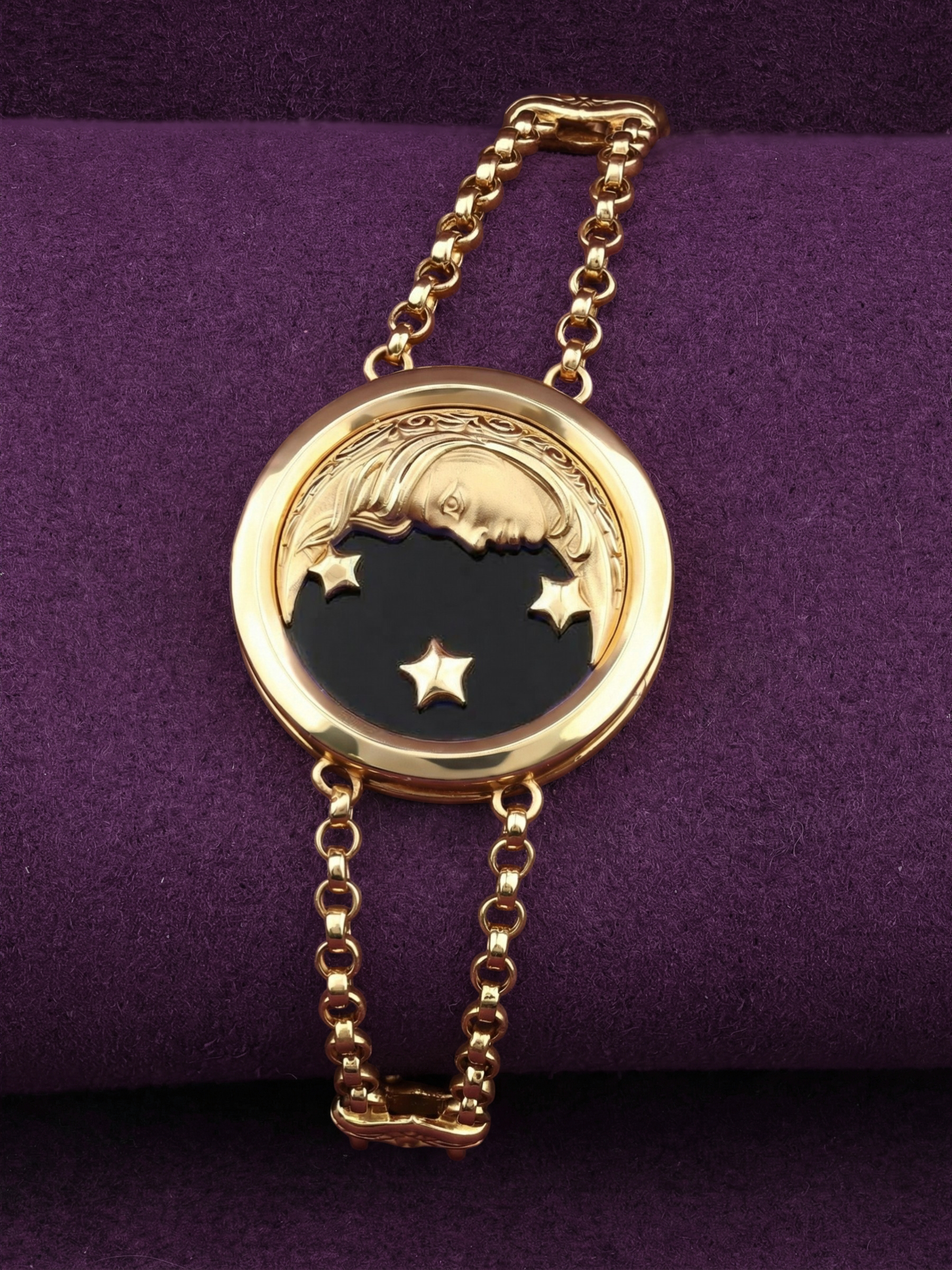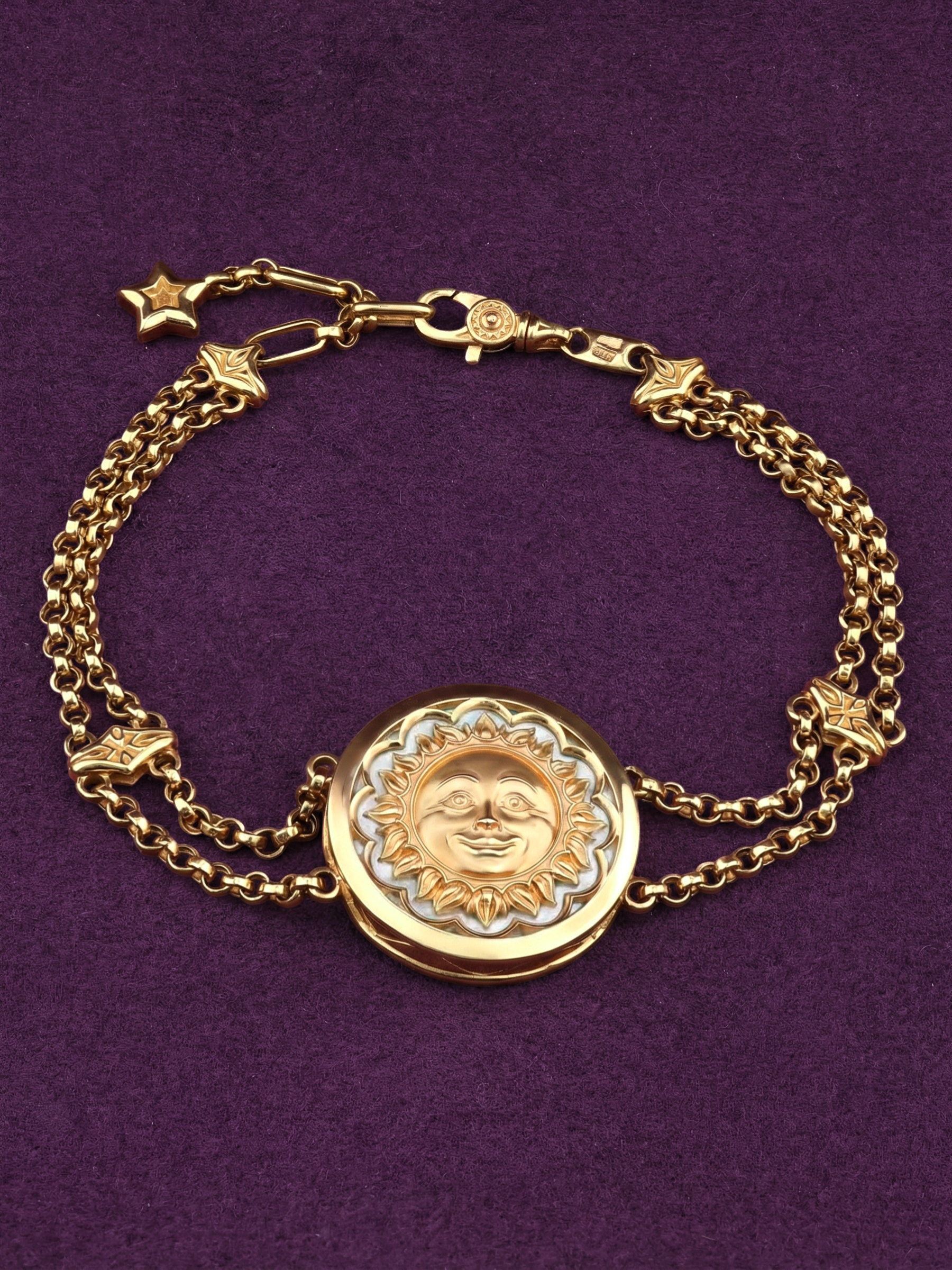 Элегантный и символичный браслет из коллекции De luxe Premium — День и ночь станет изысканным акцентом в любом образе. Ювелирное изделие выполнено из лимонного золота 585 пробы, которое благородно сияет и подчеркивает статус владельца. Центральный элемент украшения привлекает внимание своим сложным дизайном в тематике солнце/луна, объединяя в себе контрастные оттенки и материалы.