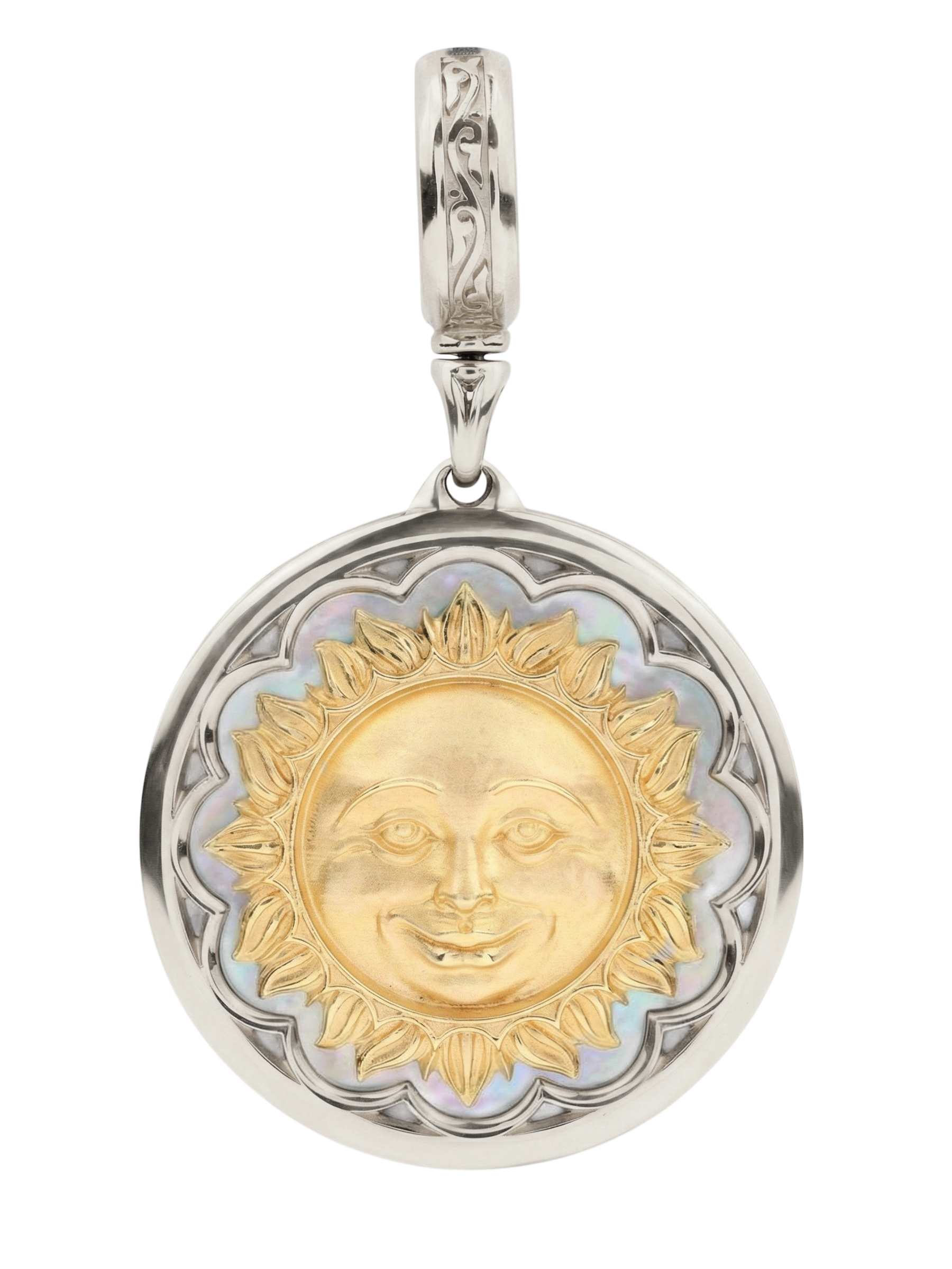 Центральным элементом композиции является вставка из перламутра круглой формы. Натуральный перламутр переливается мягкими оттенками, создавая неповторимый визуальный эффект, который притягивает взгляд и придает украшению особую глубину. Дизайн с небесными светилами делает эту подвеску универсальным аксессуаром: она одинаково эффектно смотрится как на женщинах, так и на мужчинах, подчеркивая индивидуальность своего владельца.