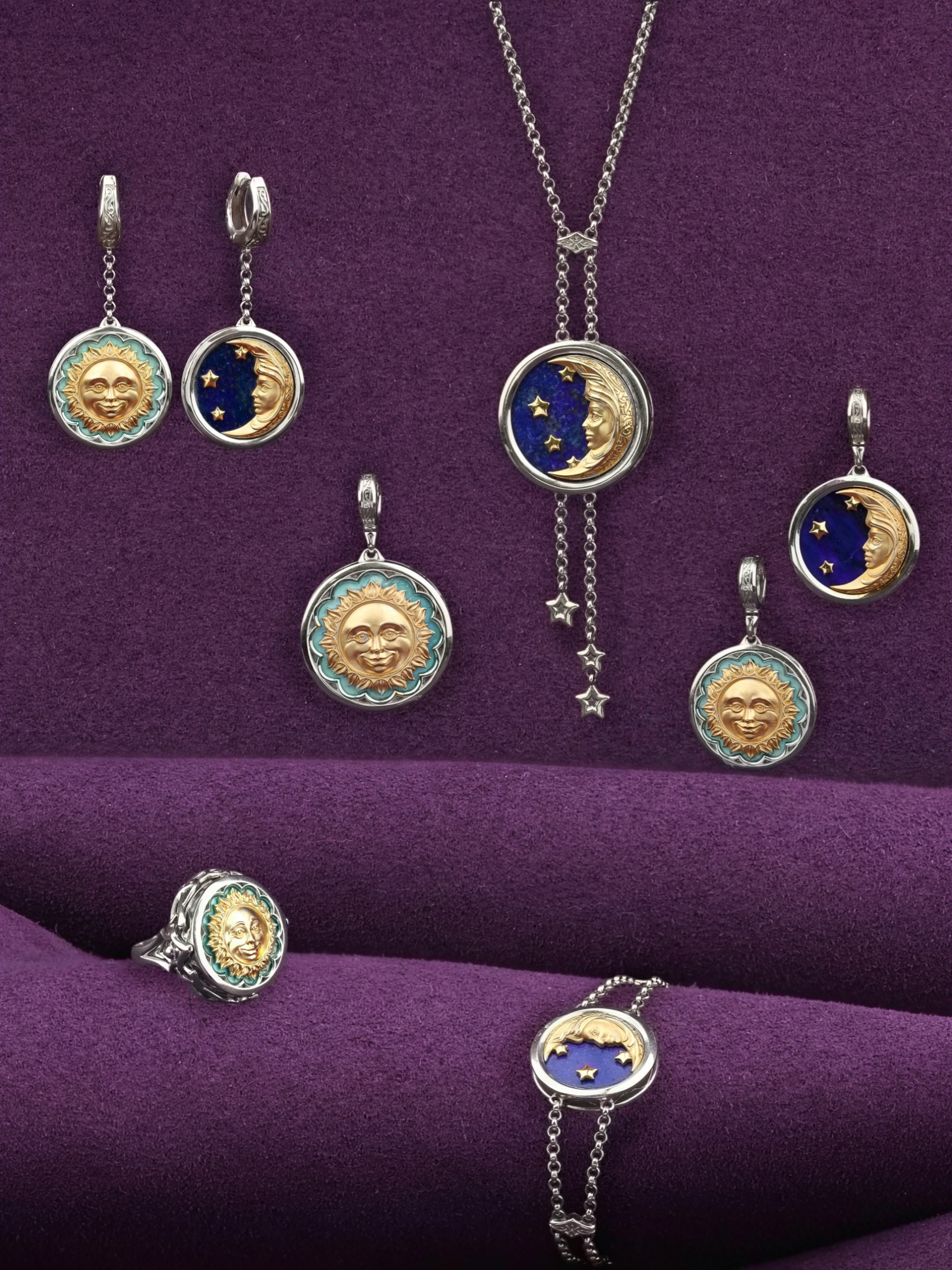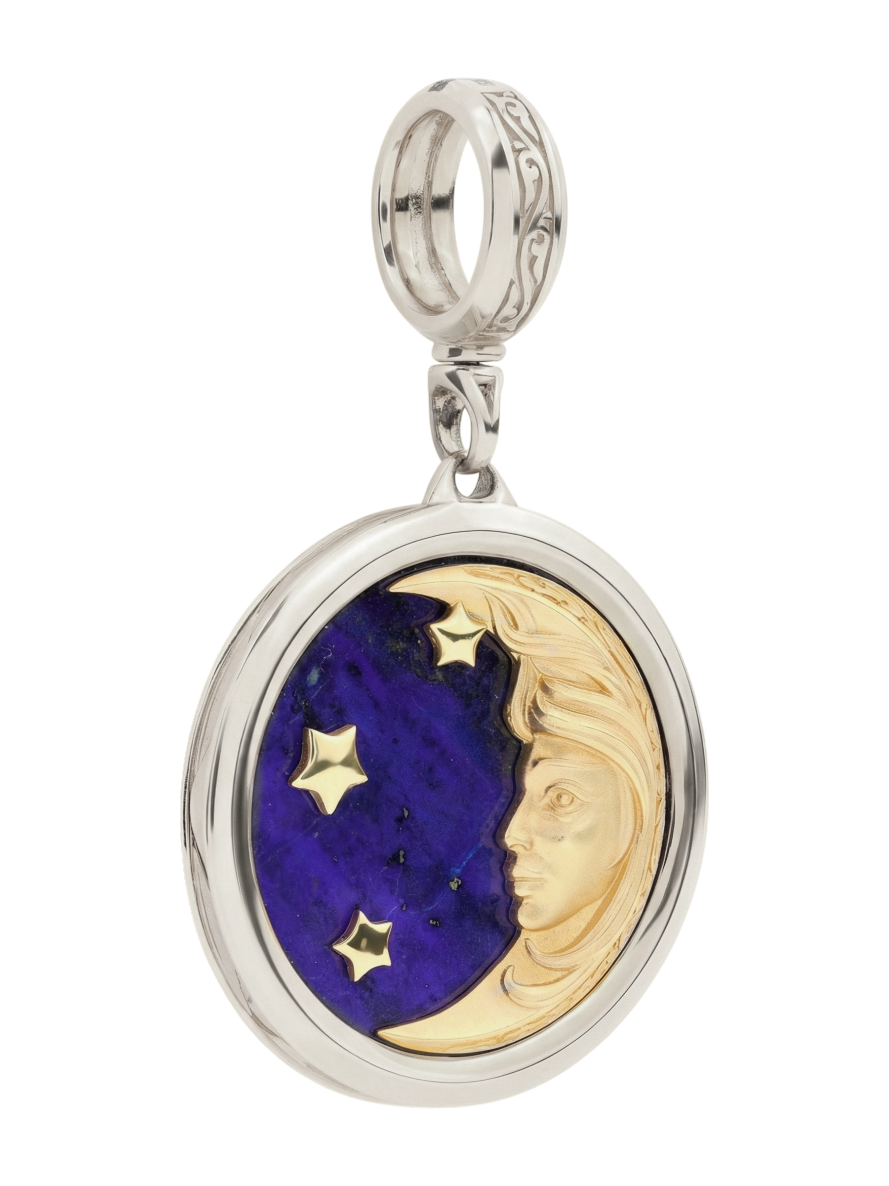 Подвеска из белого золота 585 пробы — это изысканное ювелирное украшение, которое станет воплощением элегантности и мистической красоты в вашем образе. Дизайн изделия вдохновлен небесной тематикой и выполнен в форме символичного дуэта солнца и луны, где детально проработанный профиль луны подчеркивает художественную глубину украшения. Глубокий синий цвет натурального лазурита, имеющего круглую форму, создает эффект ночного неба, на фоне которого сияют золотые звезды.