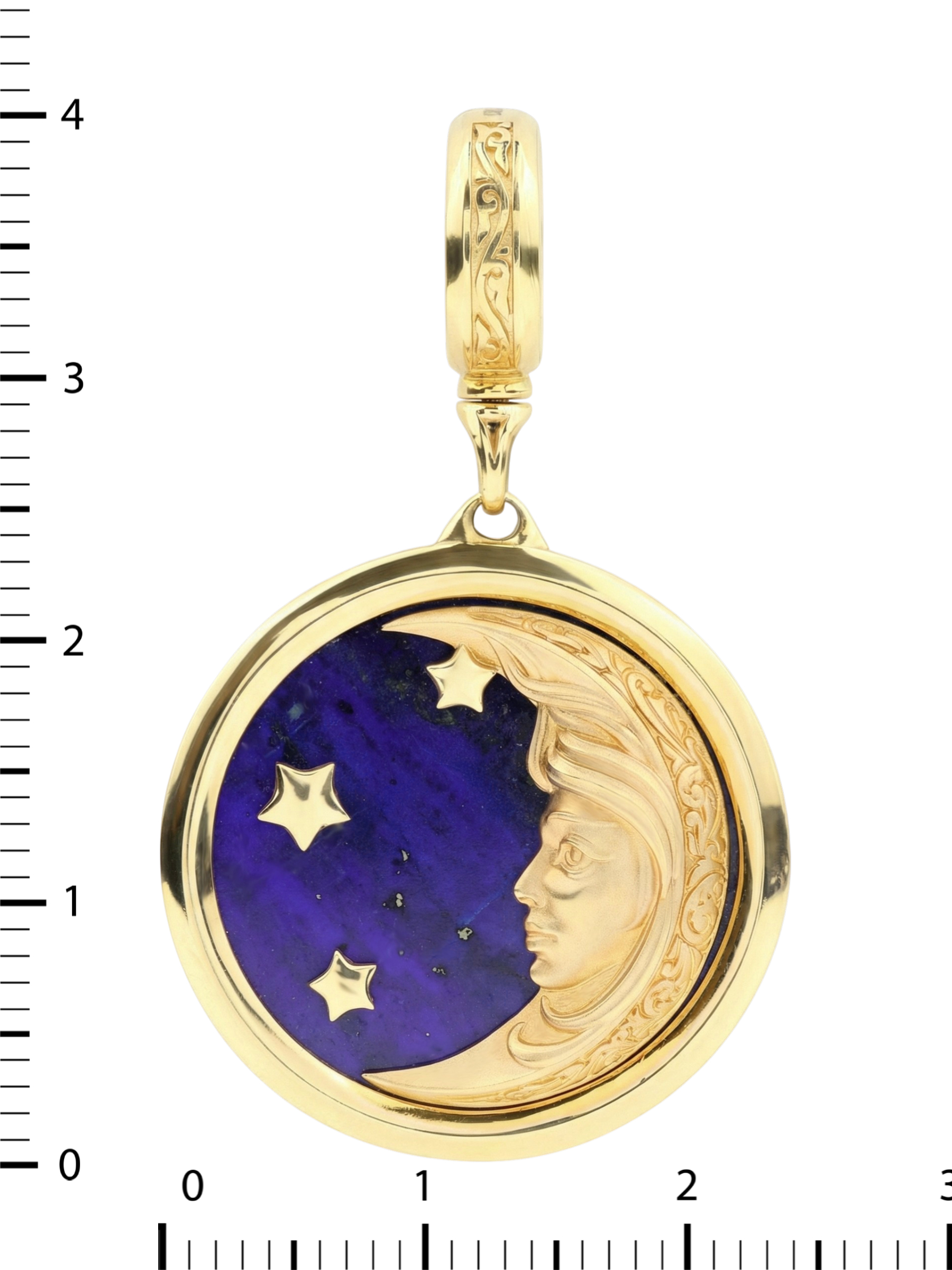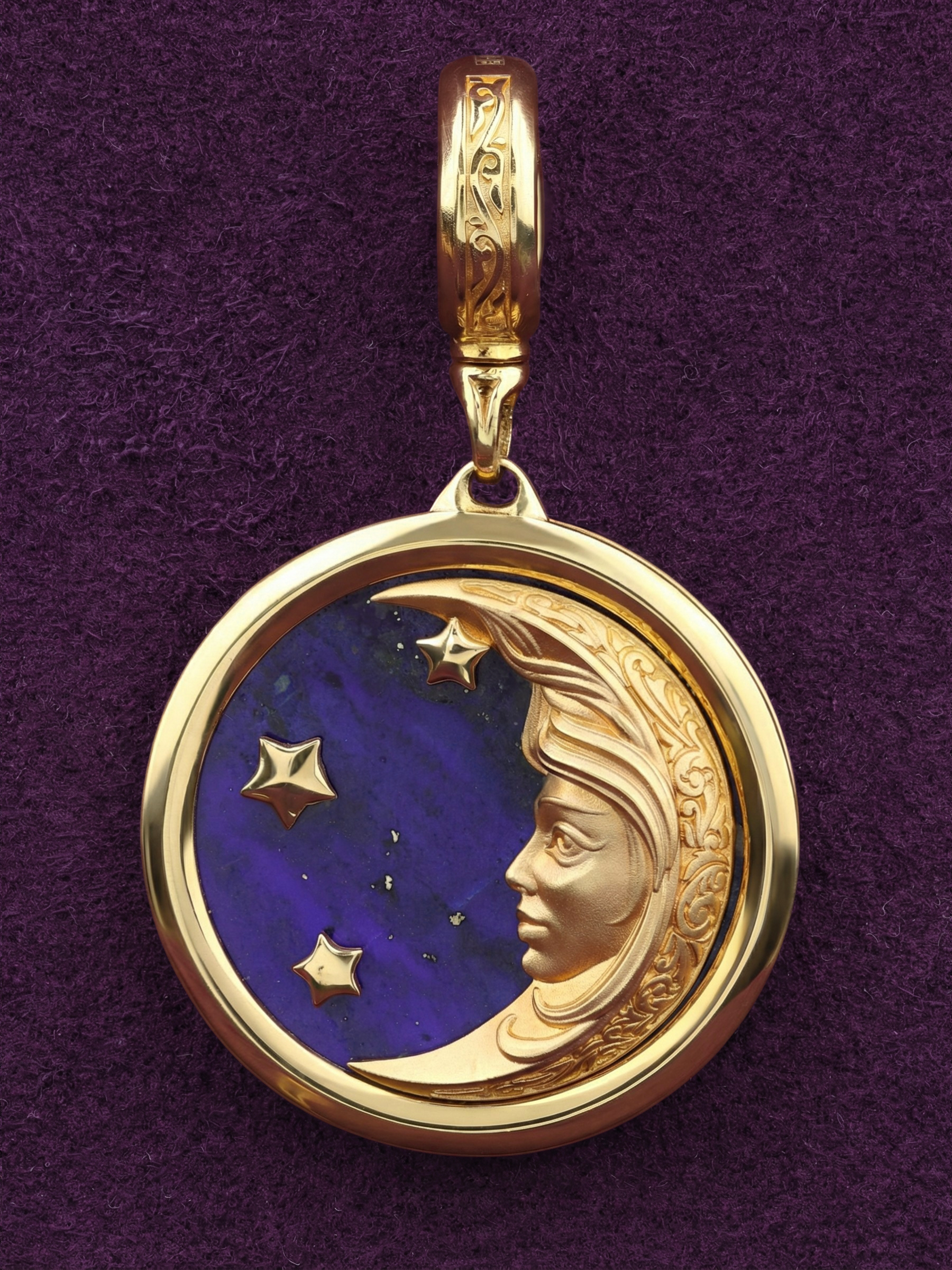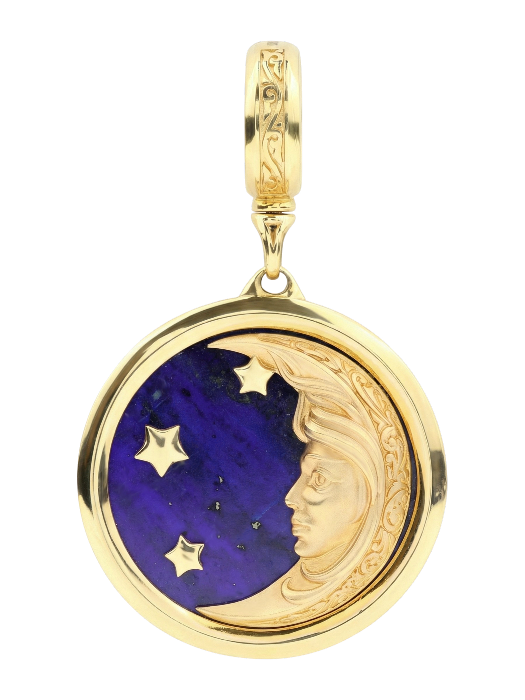 Откройте для себя магию небесных светил в авторской подвеске, вошедшей в коллекцию De luxe Premium — День и ночь. Это изысканное украшение выполнено из лимонного золота 585 пробы и станет воплощением утонченного стиля и глубокого символизма. Центральным элементом композиции является завораживающий дизайн Солнце/луна, где рельефное изображение небесного лика гармонично сочетается с глубоким синим цветом вставки — натуральным лазуритом.