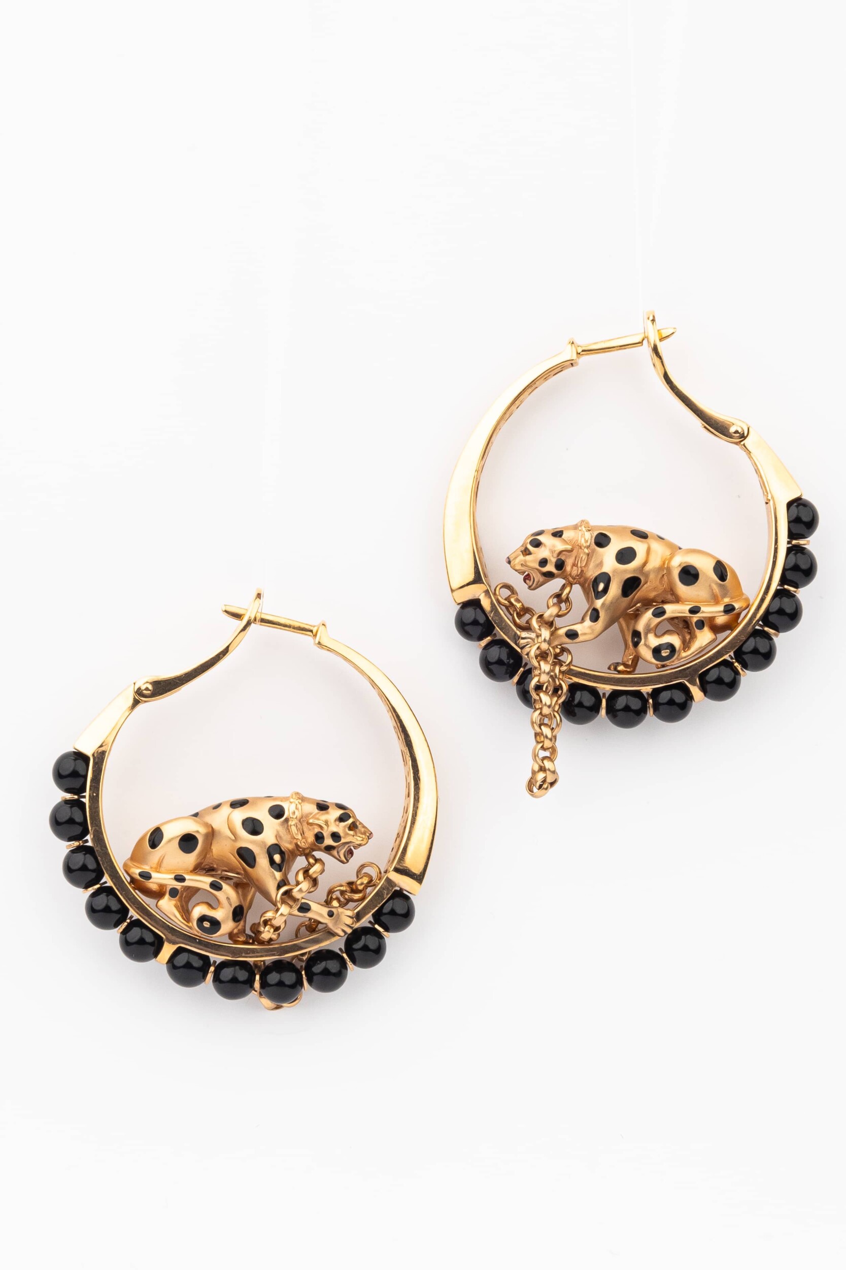 Композиция дополнена вставками из черной эмали и гладкого оникса. Глубокий черный цвет оникса, представленного в форме бусин, создает эффектный контраст с теплым оттенком драгоценного металла. Всего в изделии использовано 22 вставки, которые гармонично вписаны в конструкцию, подчеркивая динамику дизайна. Геометрический орнамент на ободе серег добавляет финальный штрих утонченности и завершенности.