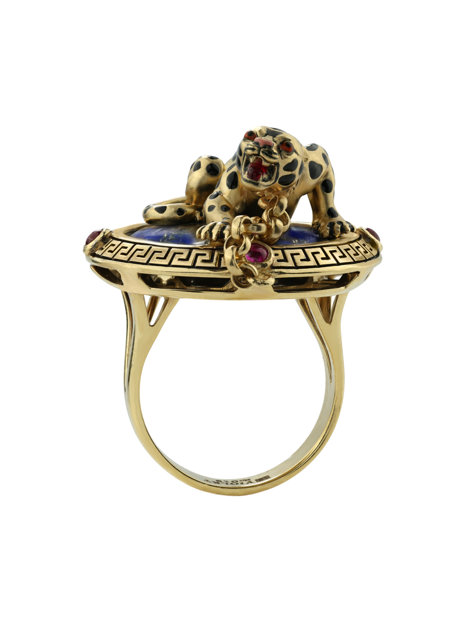 Композиция построена на эффектном контрасте материалов и цветов. Фигура леопарда расположена на глубоком синем лазурите круглой формы, создавая ощущение ночного сафари. Яркие акценты в виде 5 вставок красного рубина круглой формы добавляют изделию динамики и драматизма. Широкая основа кольца украшена классическим греческим орнаментом, который гармонично дополняет массивную и статусную конструкцию.