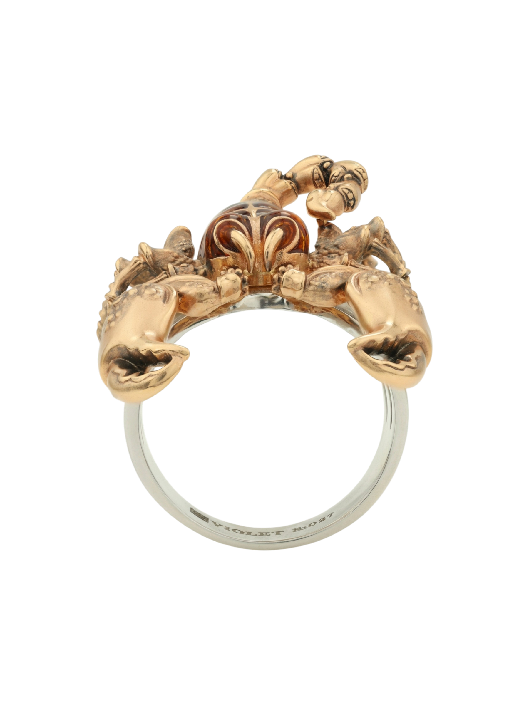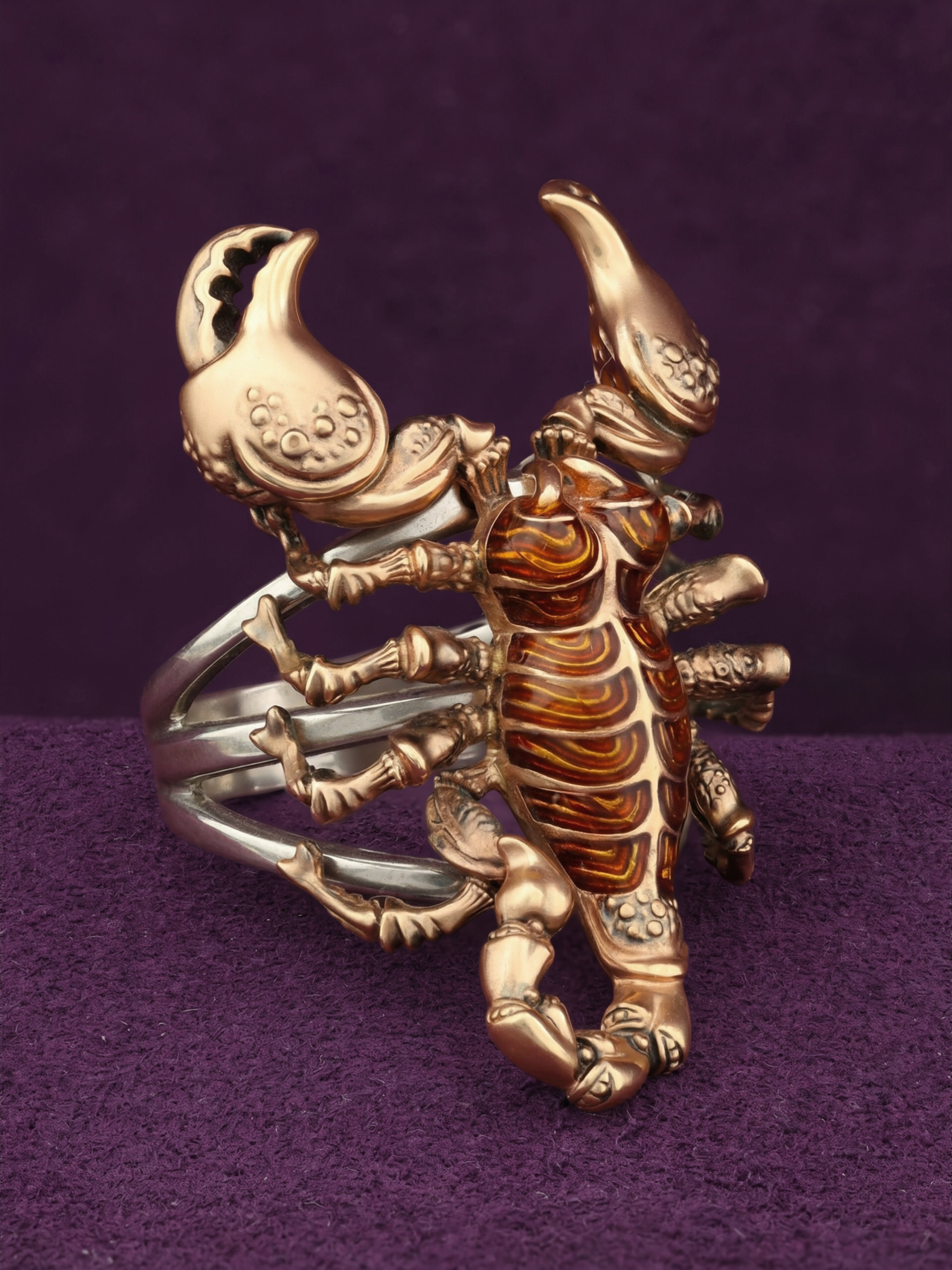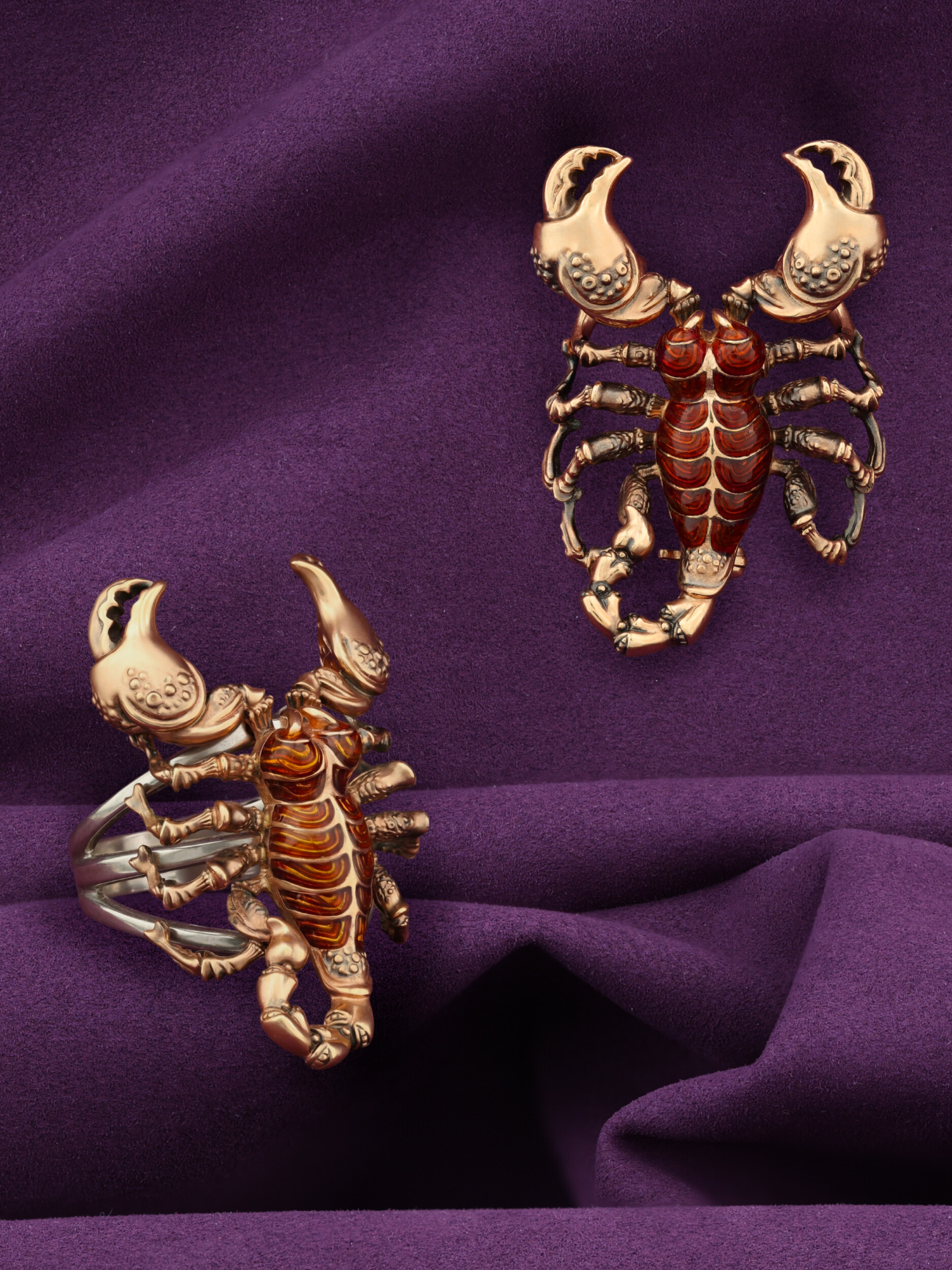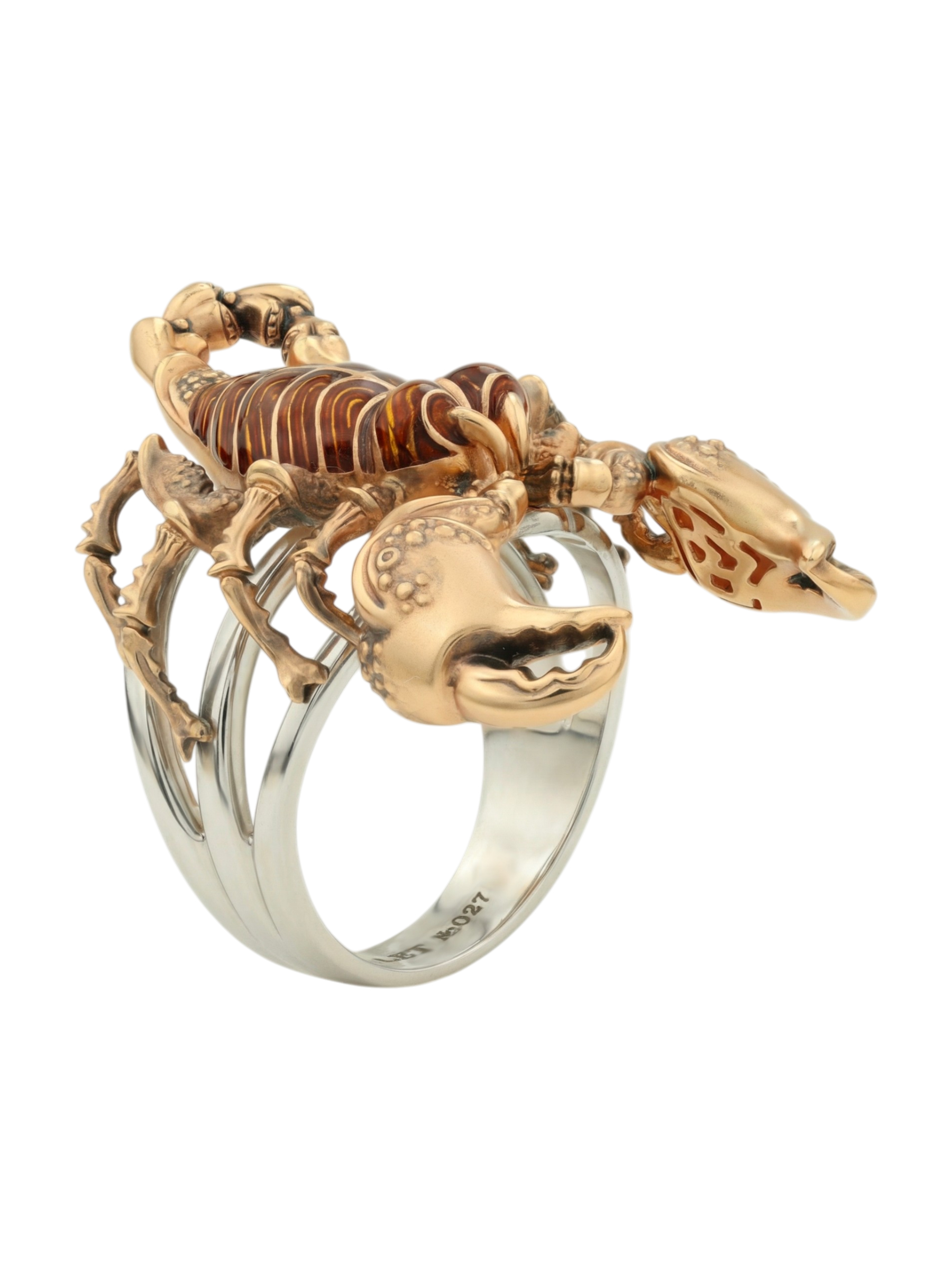 Мастерами ювелирного дела была использована техника покрытия коричневой эмалью, подчеркивающая рельефные элементы изделия и создающая глубину цвета. Красное золото гармонично дополняет теплые оттенки вставки, формируя статусный и узнаваемый образ. Дизайн в виде скорпиона символизирует силу, уверенность и независимость, делая это кольцо не просто украшением, а настоящим отражением индивидуальности владельца.