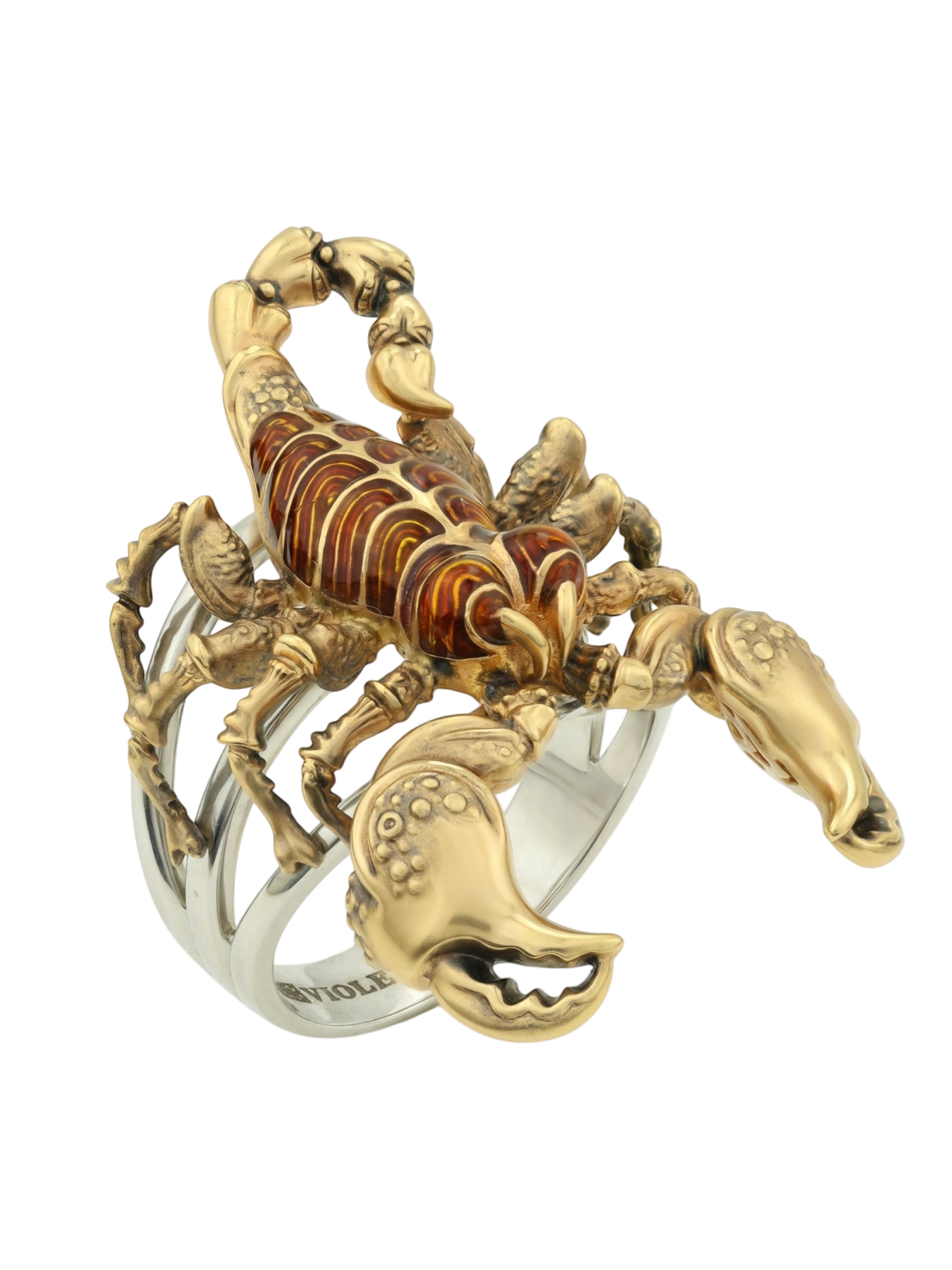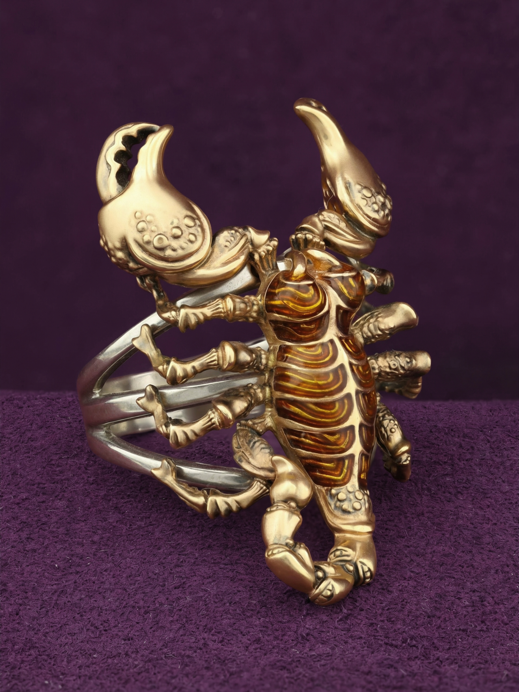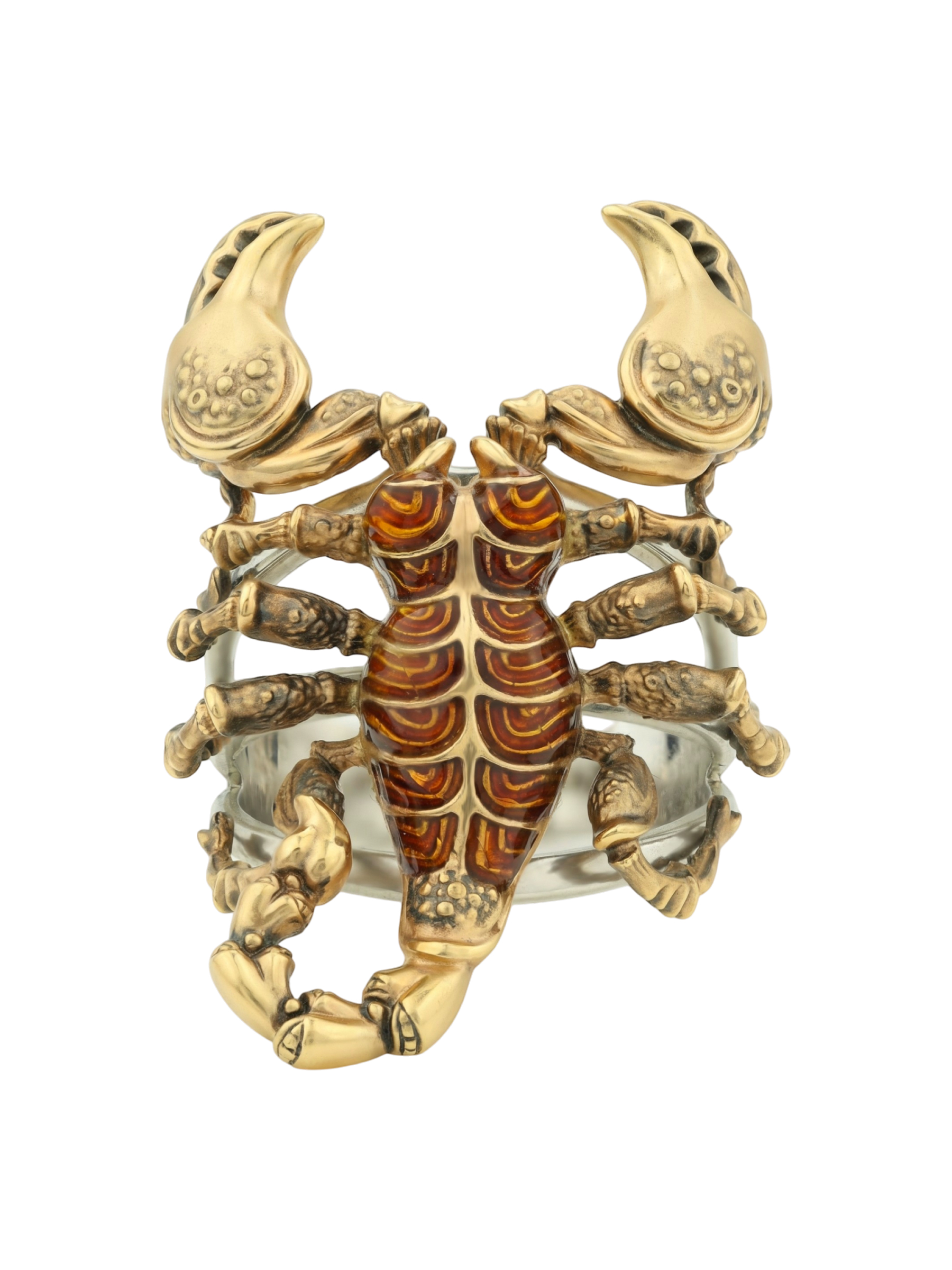 Центральным элементом декора выступает ювелирная эмаль коричневого цвета, которая красиво контрастирует с благородным лимонным оттенком золота. Использование эмали добавляет глубину и фактурность, превращая ювелирное изделие в настоящий арт-объект. Это украшение из коллекции De luxe Premium — Скорпион создано для тех, кто предпочитает смелые и запоминающиеся аксессуары.
