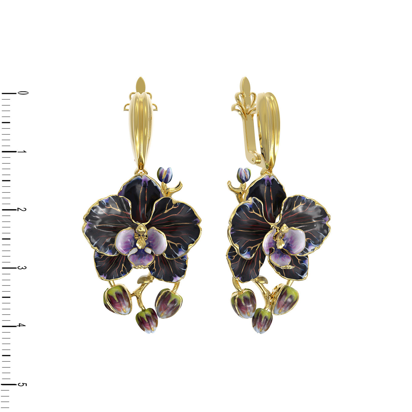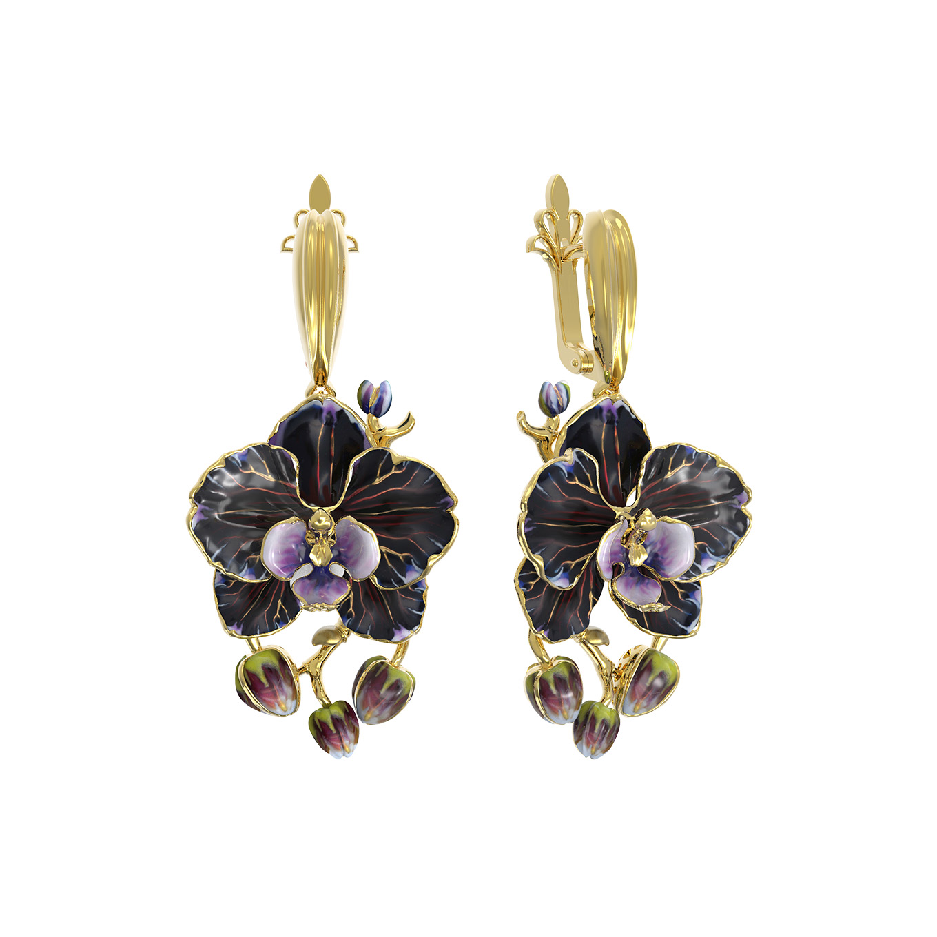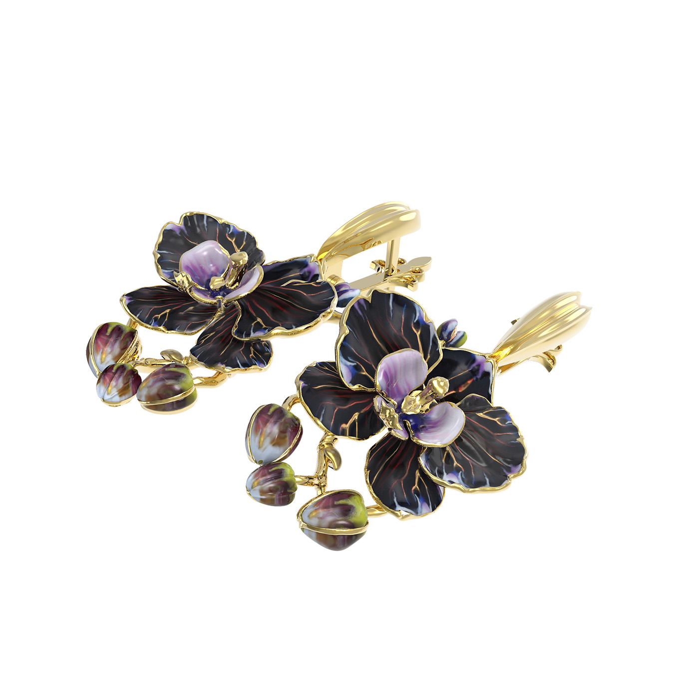 Линии лепестков, мастерски исполненные в металле, подчеркивают благородный оттенок лимонного золота, создавая гармоничное сочетание с цветной эмалью. Разноцветная эмаль придает изделию глубину и объем, словно оживляя бутоны орхидей прямо на ваших глазах. Использование эмали в ювелирном искусстве позволяет добиться уникальной игры цвета, которая делает каждое изделие по-настоящему живым и динамичным.