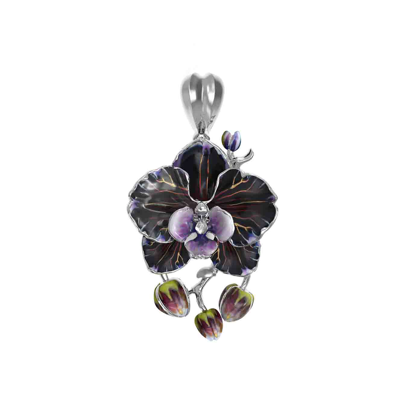 Изящная подвеска из белого золота 585 пробы станет утонченным дополнением вашего образа, воплощая в себе гармонию природной эстетики и ювелирного мастерства. Это изделие, представленное в рамках коллекции De luxe Premium — Орхидеи, выполнено в форме экзотического цветка орхидеи, чей притягательный дизайн подчеркнут детальной проработкой каждого лепестка. Использование художественной эмали позволило добиться глубокого, насыщенного цвета вставок, где переплетаются темные и светлые оттенки, создавая эффектный контраст с благородным холодным блеском белого золота.