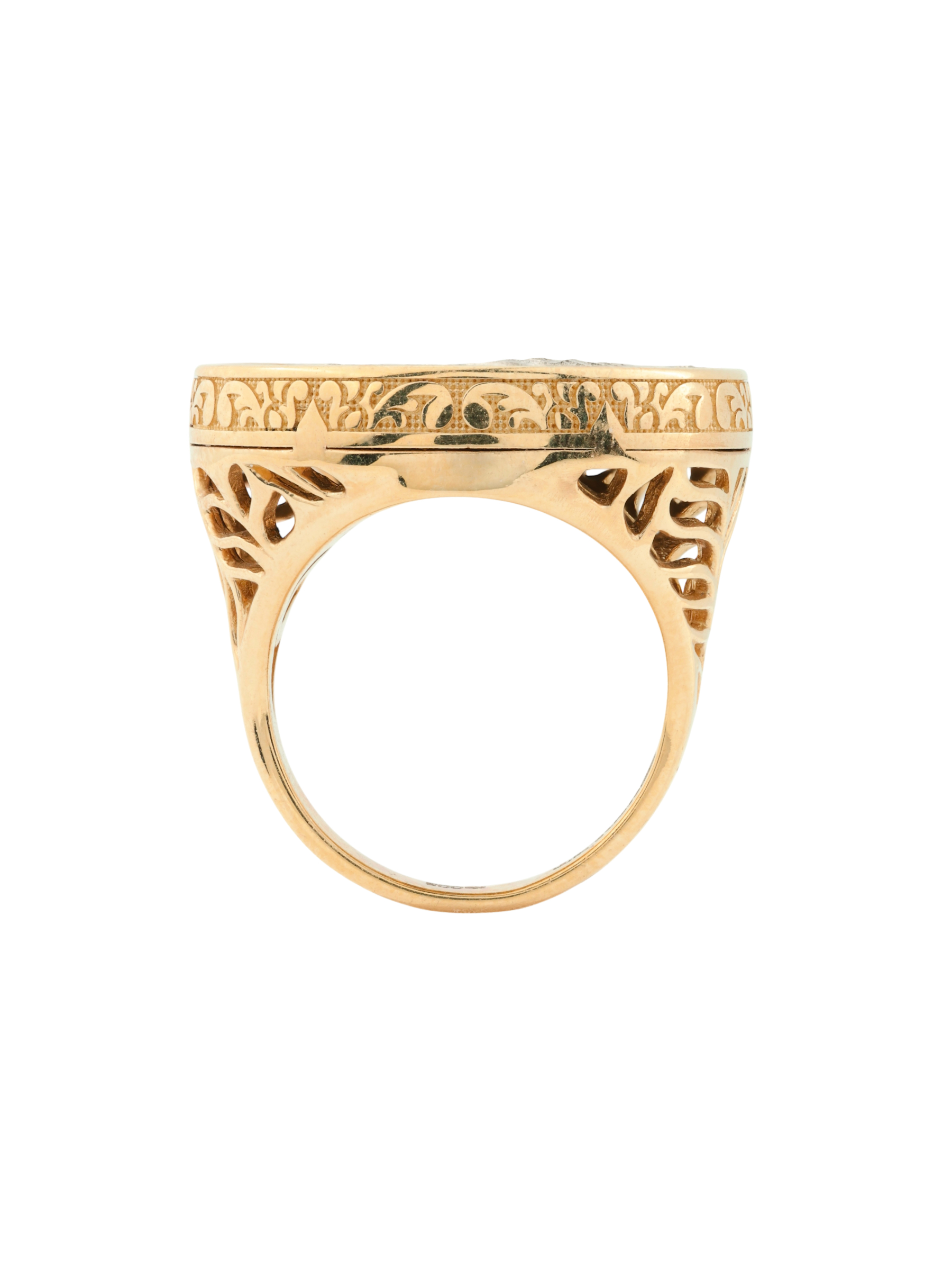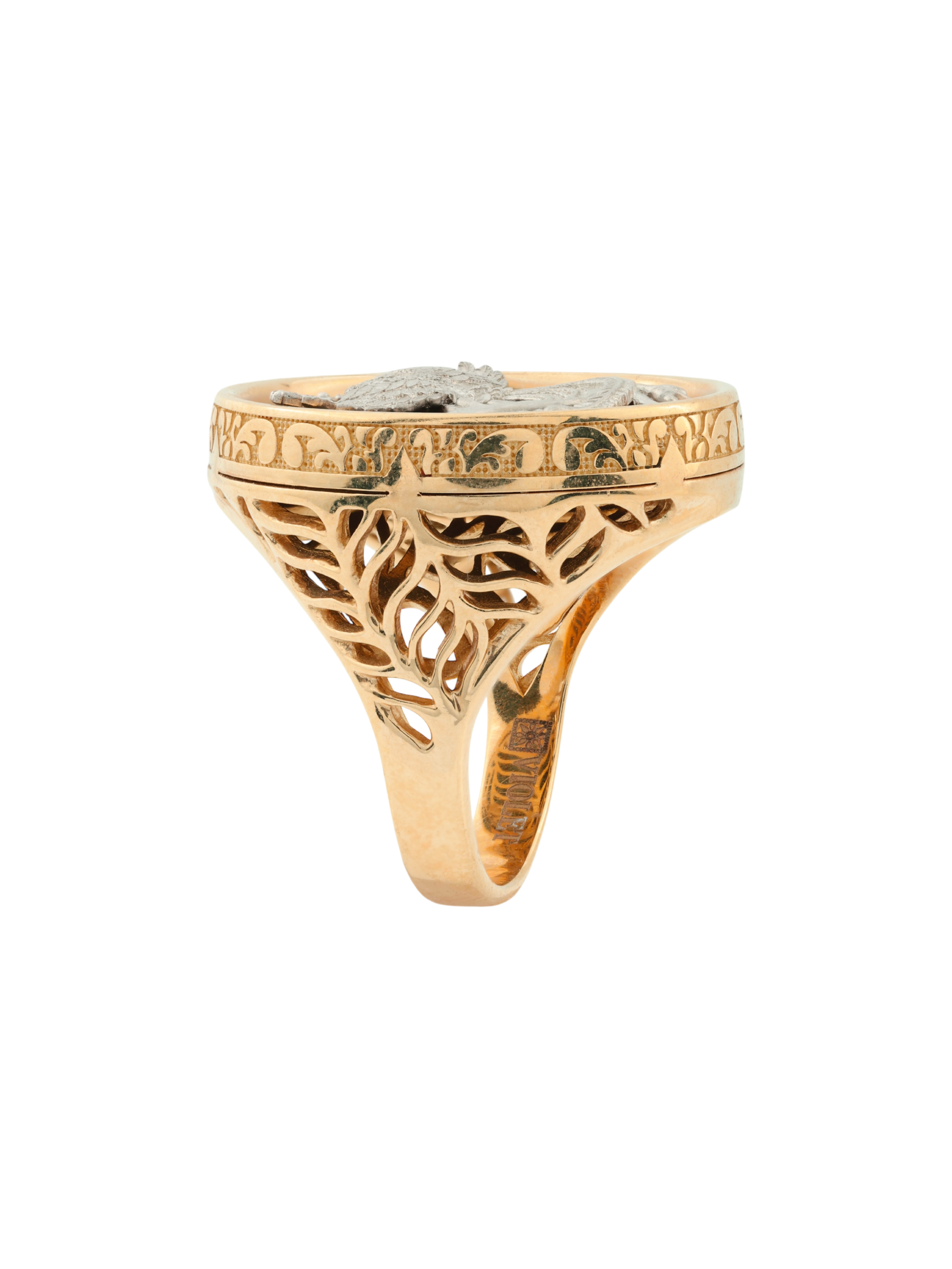 Данное кольцо выполнено из красного золота 585 пробы, что обеспечивает изделию благородный теплый оттенок и долговечность. Гармоничное сочетание красного золота и темного эбена создает выразительный образ, который подчеркнет статус и индивидуальность владельца. Уникальный дизайн, выполненный в стилистике мифологии, делает этот аксессуар не просто ювелирным изделием, а значимым талисманом.