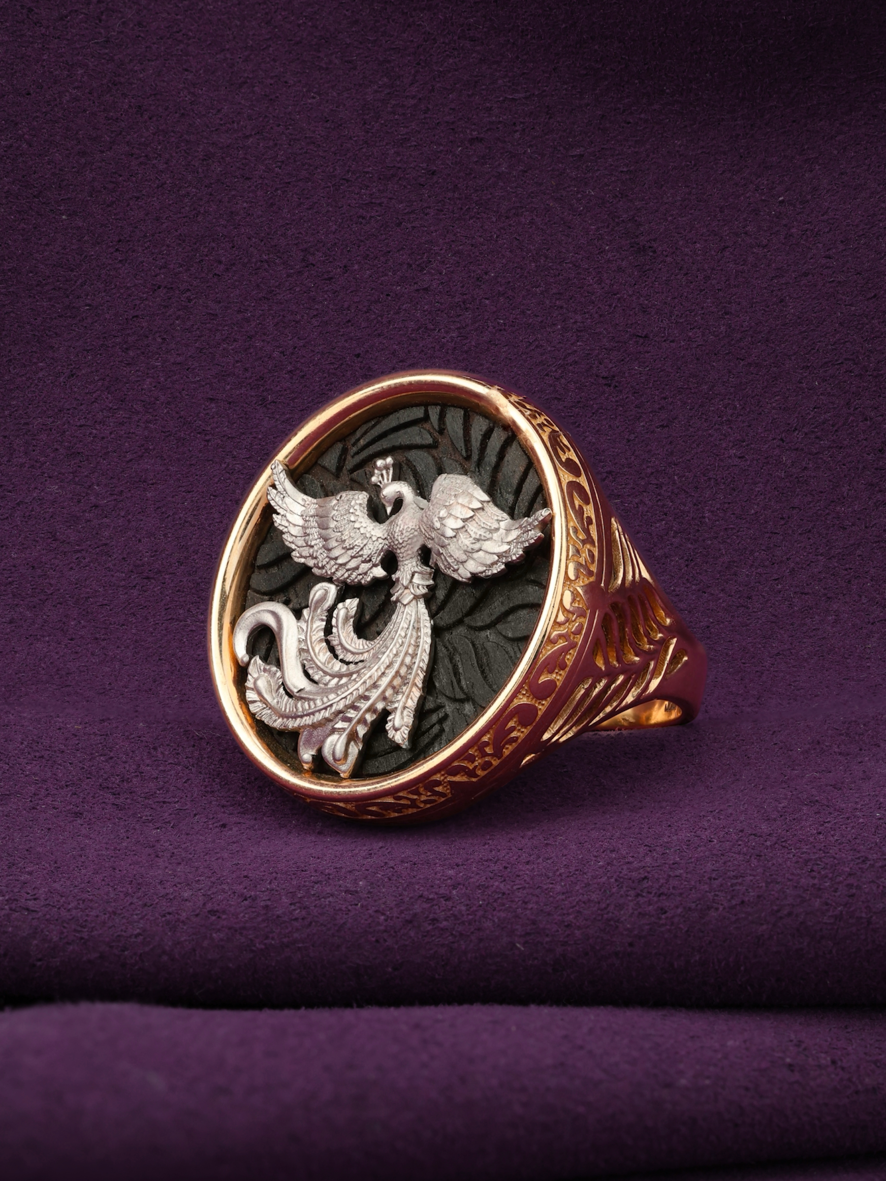Представляем вашему вниманию изысканное кольцо, созданное для ценителей глубокого символизма и премиальных материалов. Украшение входит в коллекцию De luxe Premium — Птица феникс, вдохновленную магией мифологии. Центральным элементом дизайна является величественный образ птицы Феникс, символизирующий возрождение и вечную красоту. Детально проработанное изображение мифического существа эффектно контрастирует с глубоким черным цветом вставки из эбенового дерева, имеющей форму круга.