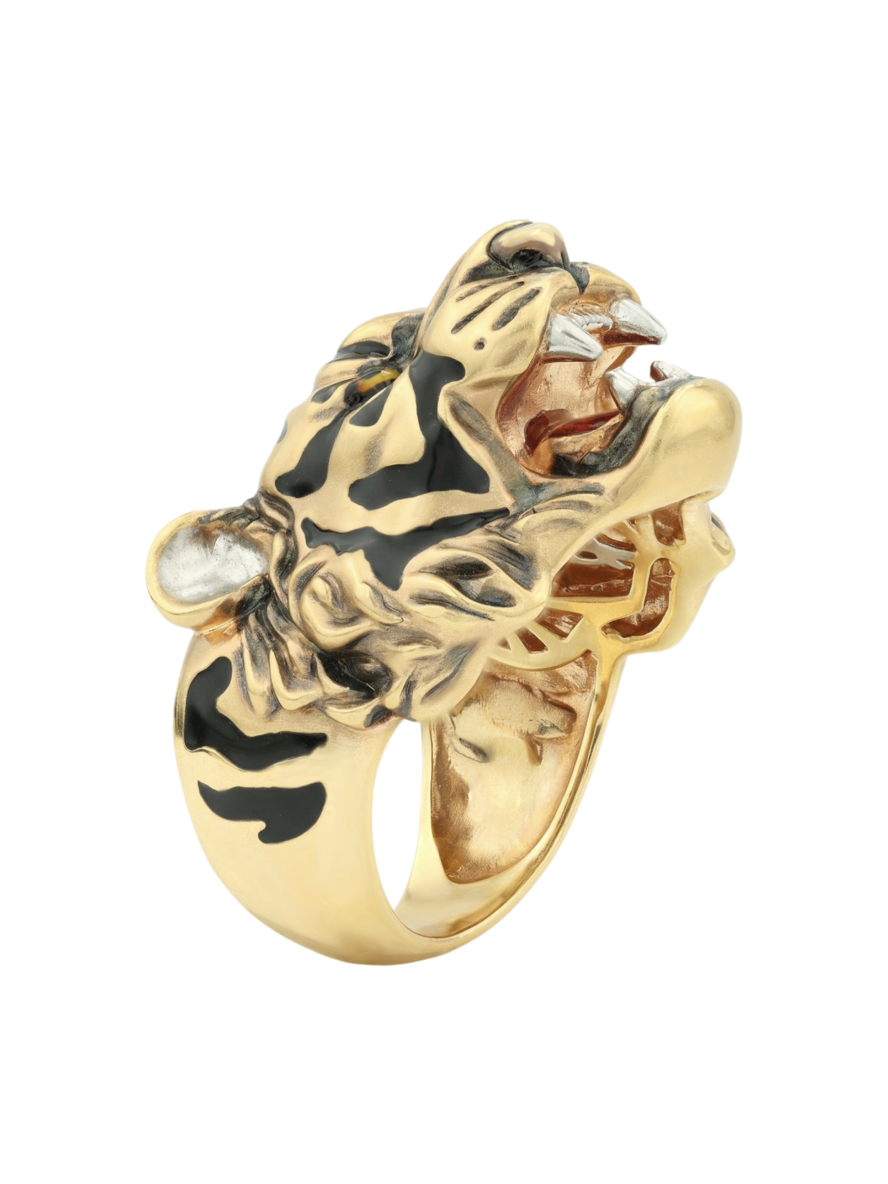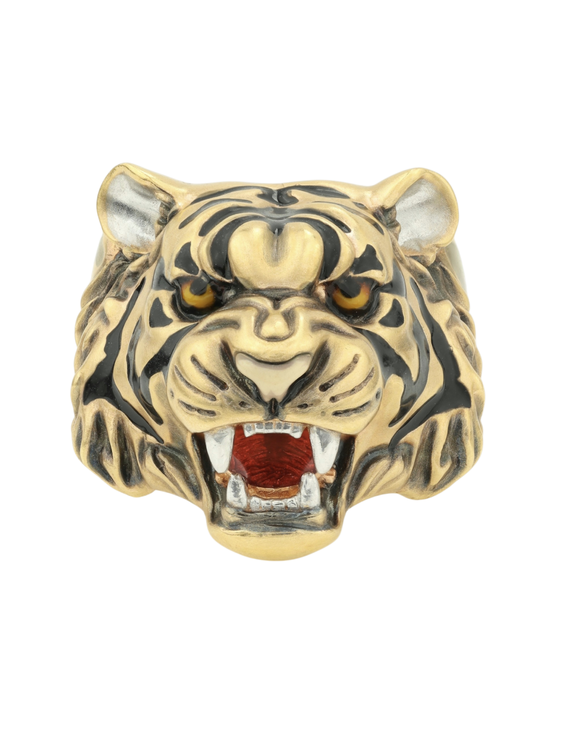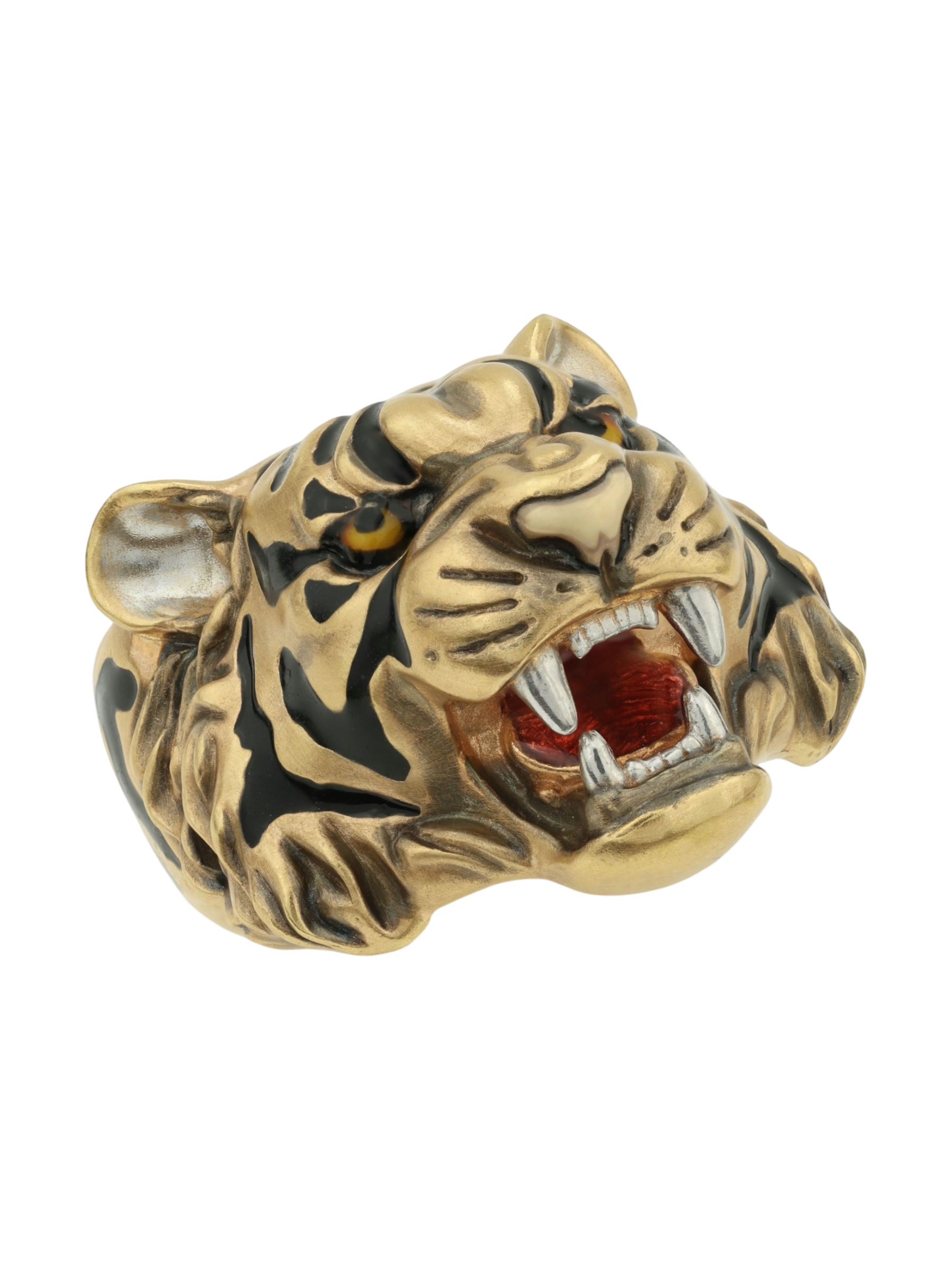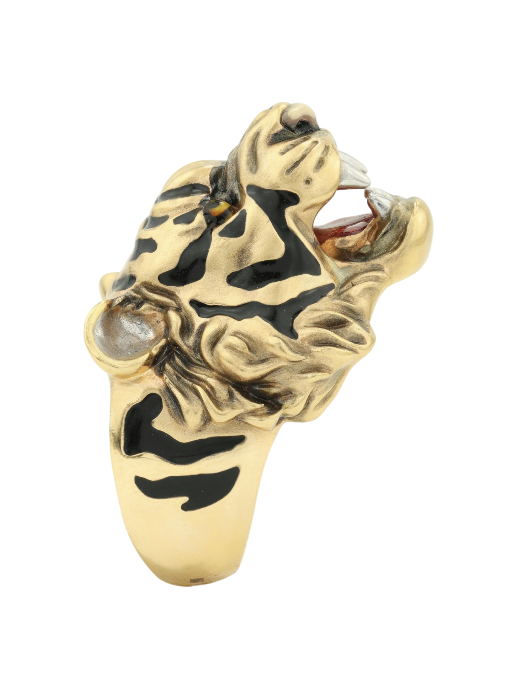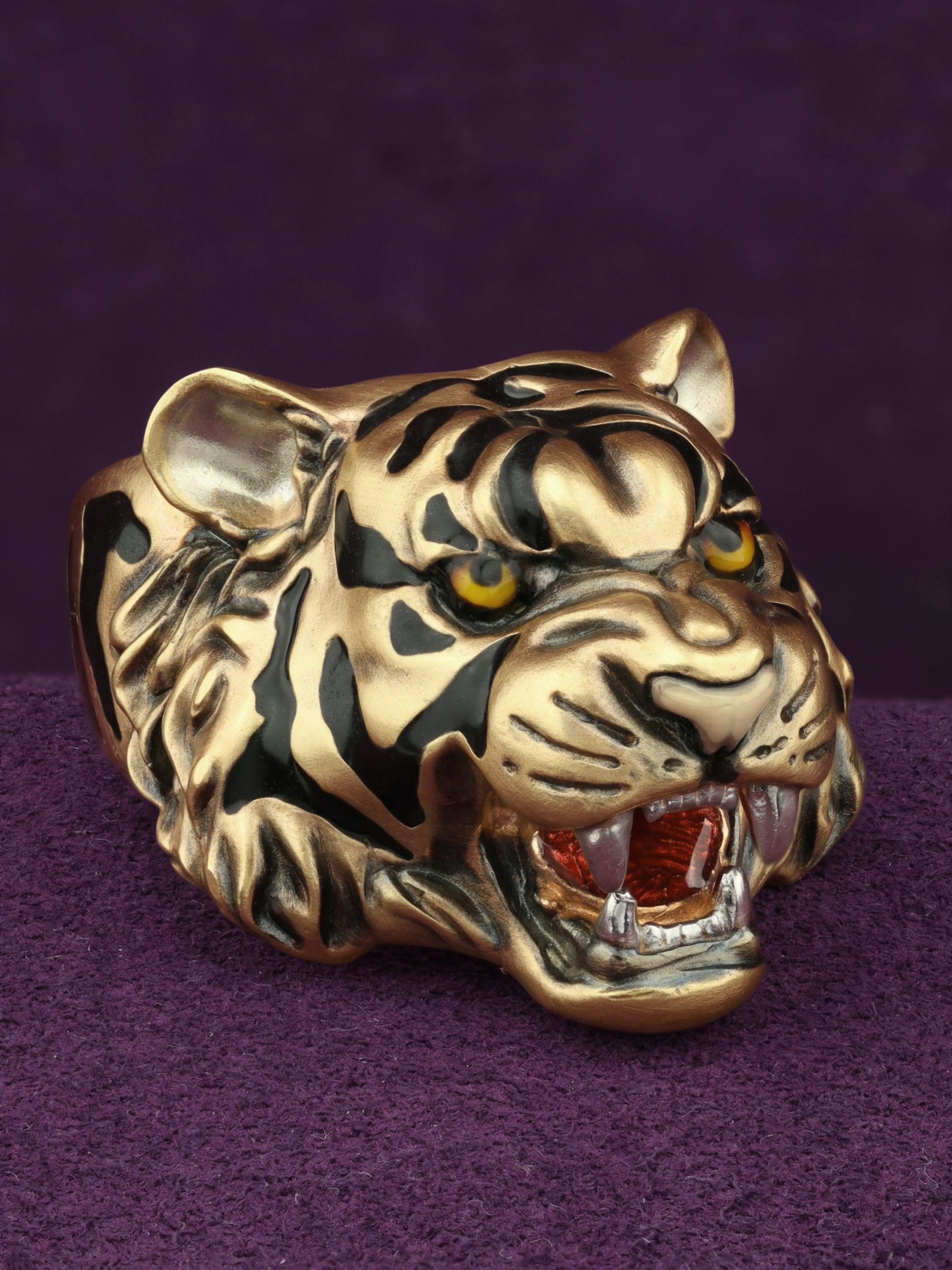 Для создания контрастного образа использована техника нанесения разноцветной эмали, которая эффектно выделяет характерные полосы и детали морды животного на фоне лимонного золота. Это ювелирное изделие гармонично дополнит строгий деловой костюм или станет частью неформального стиля, привлекая внимание окружающих своей харизмой.