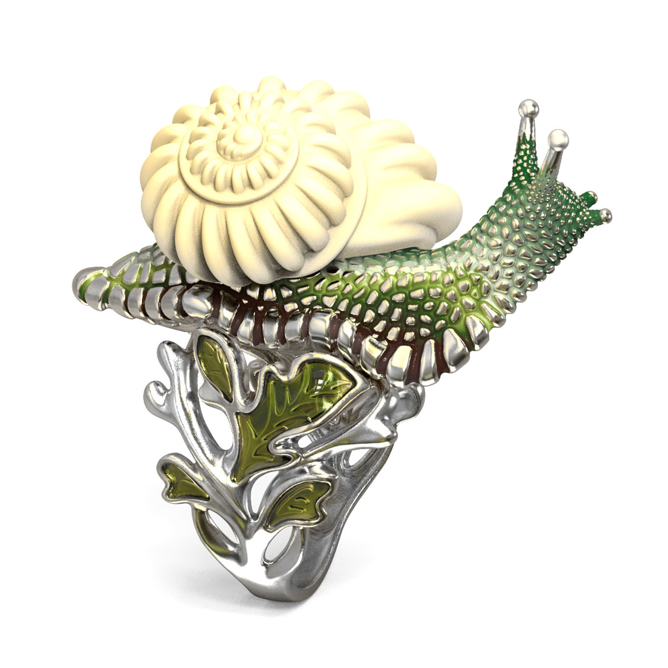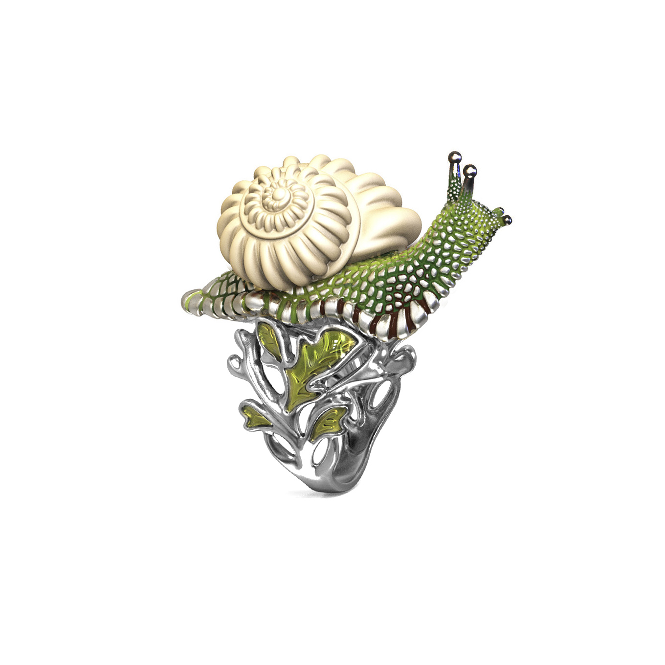 Основа изделия изготовлена из качественного белого золота 585 пробы, что обеспечивает прочность и долговечность украшения. Художественное исполнение подчеркнуто ювелирной эмалью, создающей яркий и детализированный разноцветный узор на поверхности. Искусная работа мастеров позволила передать динамику и живость образа, благодаря чему кольцо выглядит словно миниатюрное произведение искусства.