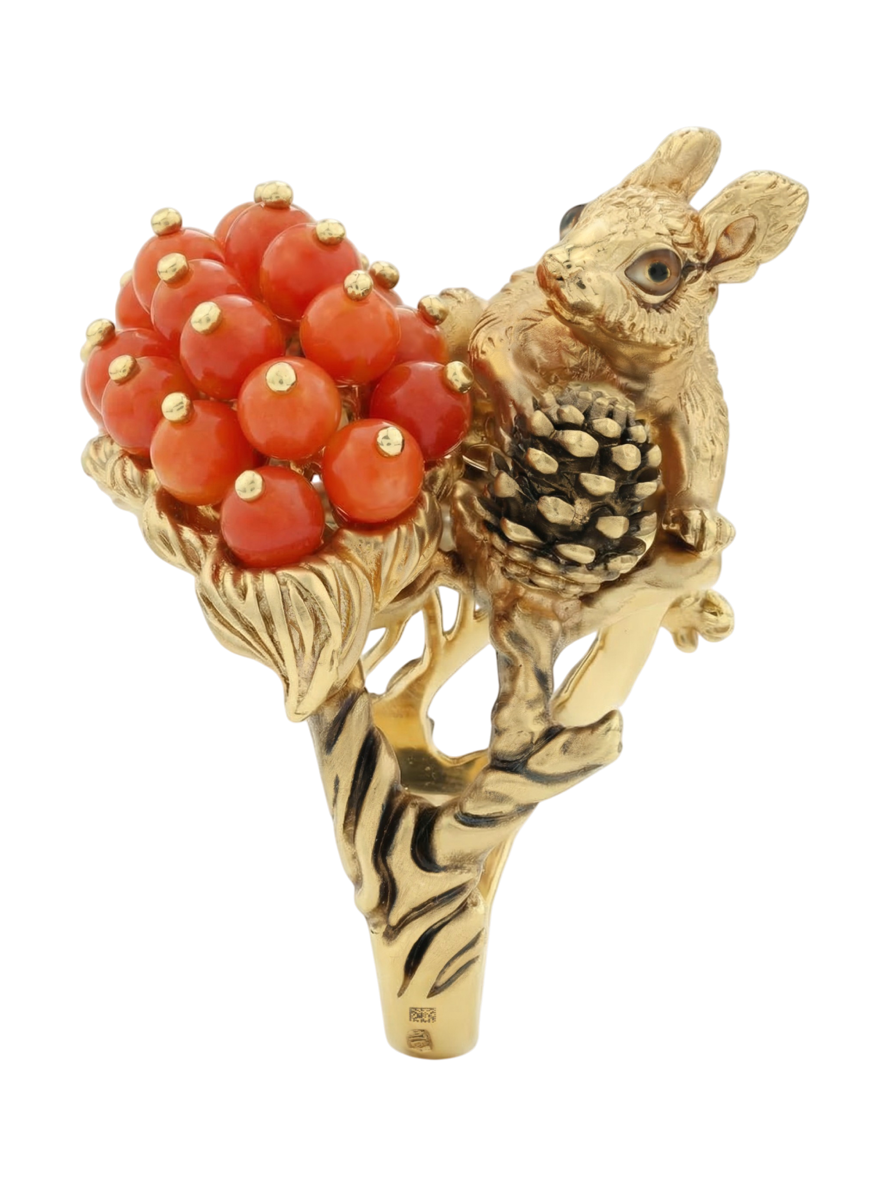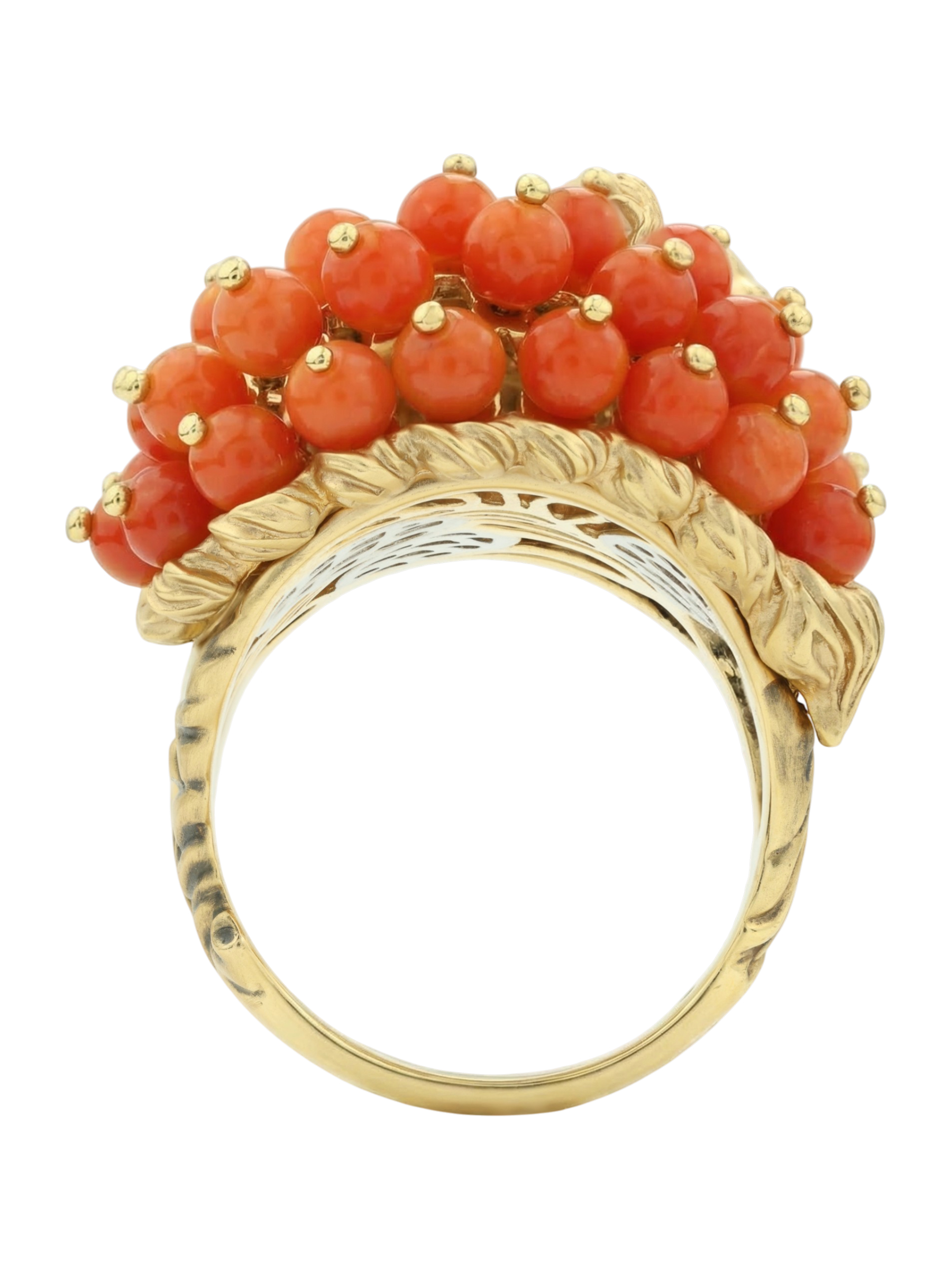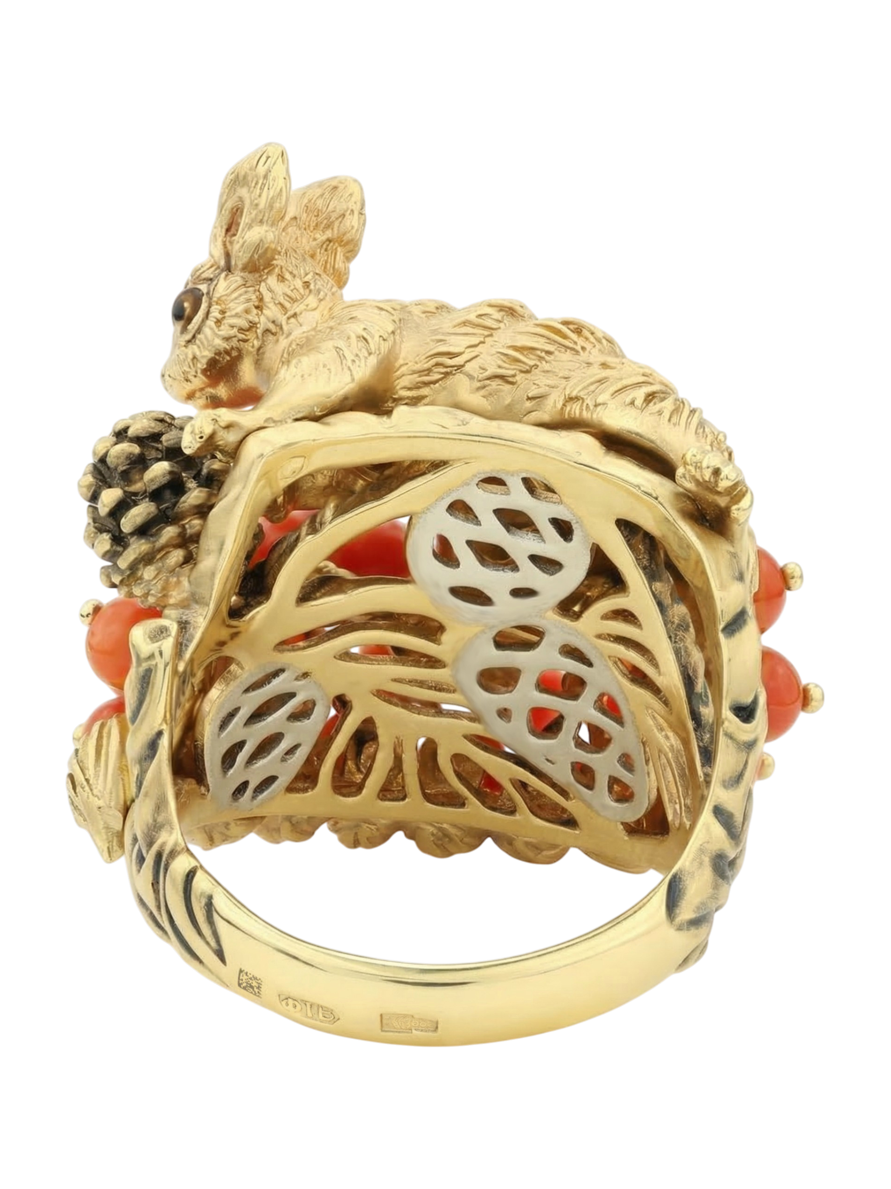 Особую выразительность изделию придает сочетание благородного лимонного золота и насыщенных вставок. Декор украшен тридцатью вставками из натурального коралла, имеющими форму изящных бусин красного цвета. Аккуратные элементы из разноцветной эмали гармонично дополняют композицию, создавая глубокий и многогранный визуальный эффект. Каждая деталь проработана с максимальной тщательностью, что делает данное кольцо по-настоящему статусным аксессуаром.