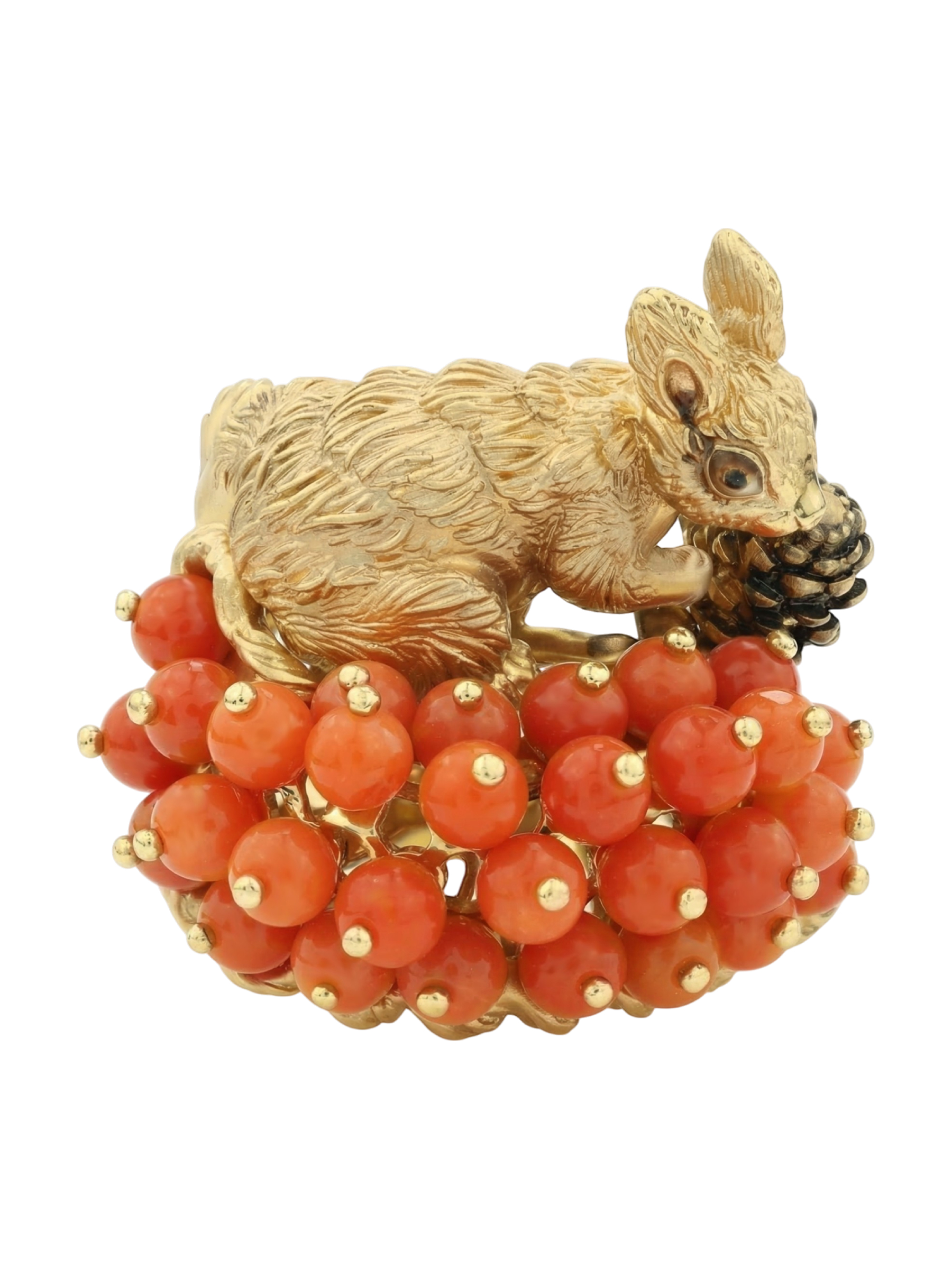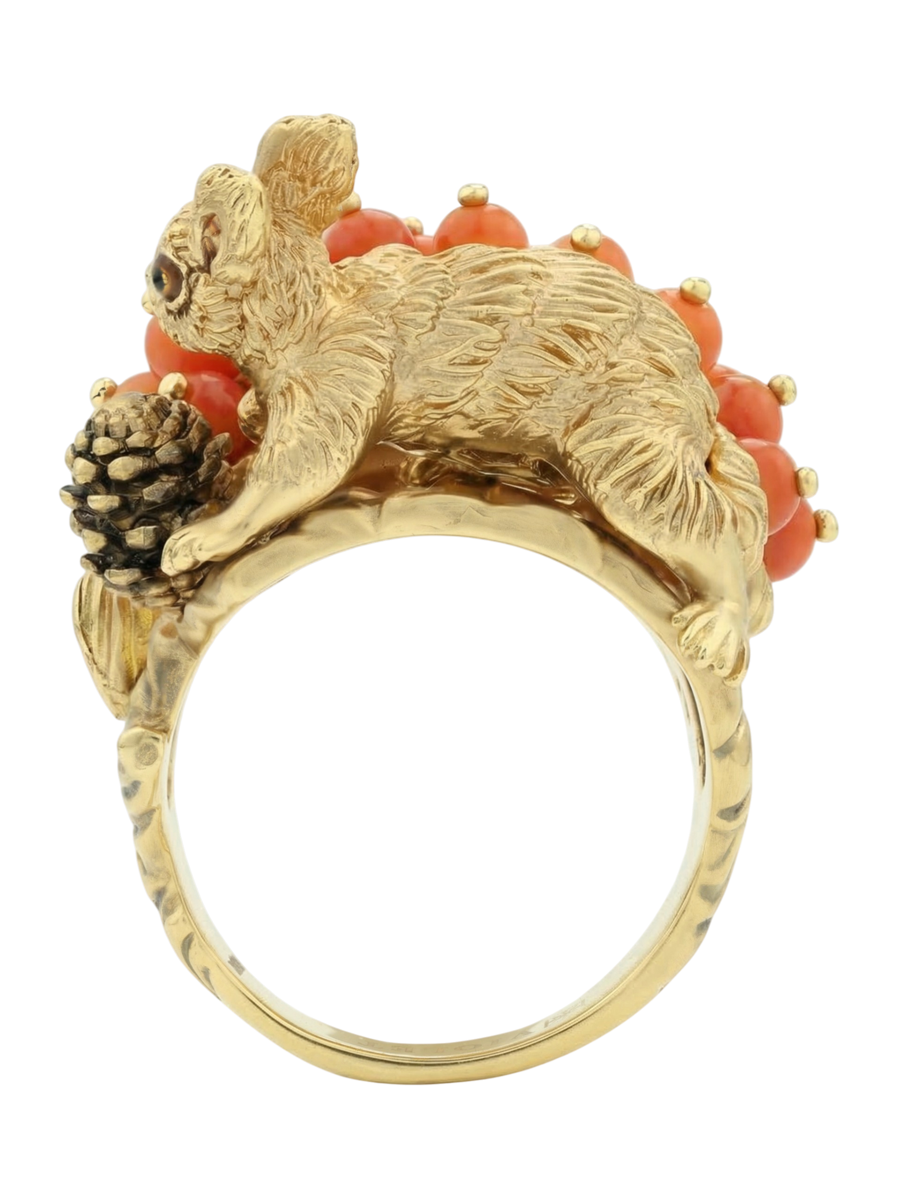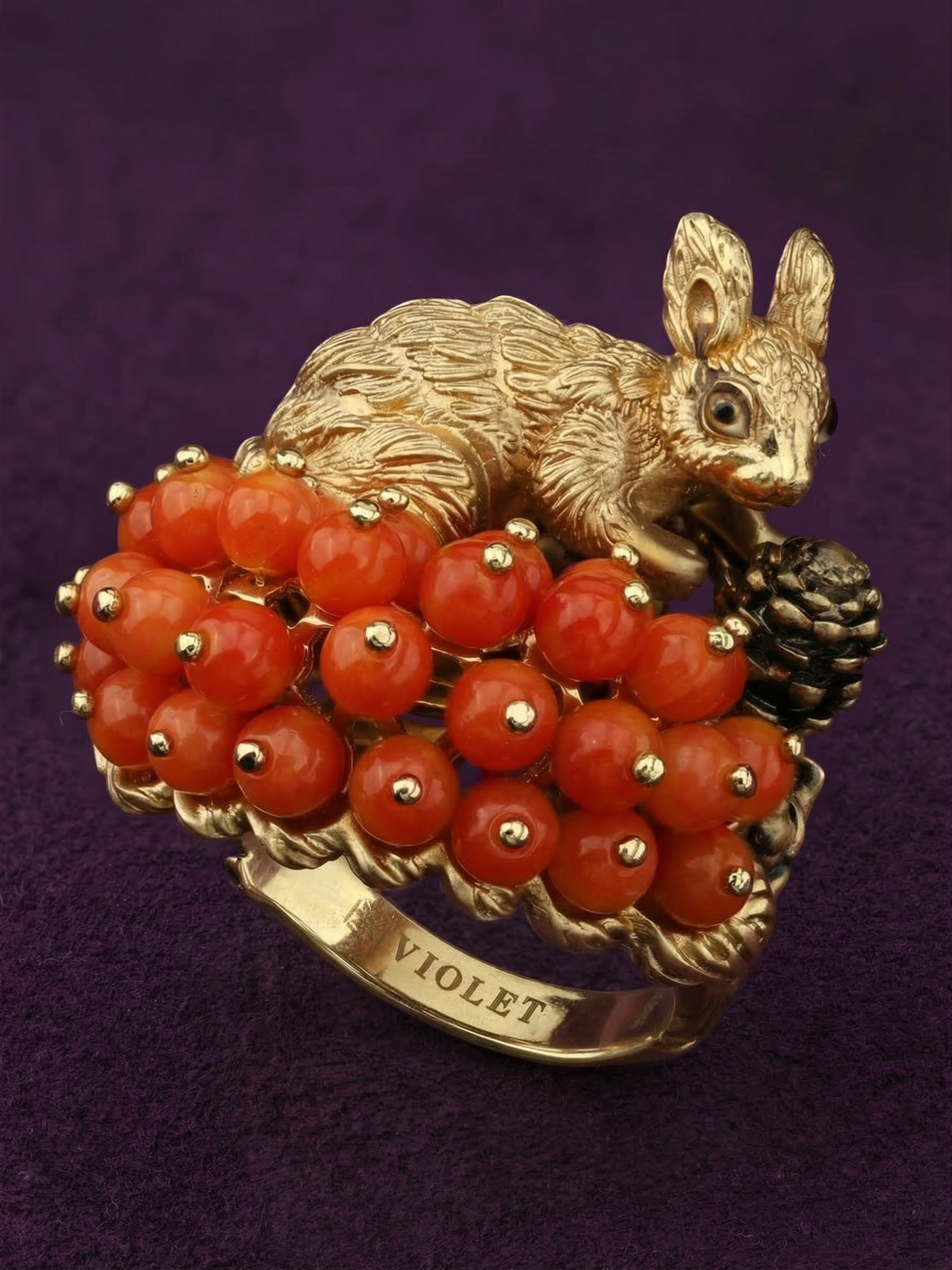 Особую выразительность изделию придает сочетание благородного лимонного золота и насыщенных вставок. Декор украшен тридцатью вставками из натурального коралла, имеющими форму изящных бусин красного цвета. Аккуратные элементы из разноцветной эмали гармонично дополняют композицию, создавая глубокий и многогранный визуальный эффект. Каждая деталь проработана с максимальной тщательностью, что делает данное кольцо по-настоящему статусным аксессуаром.