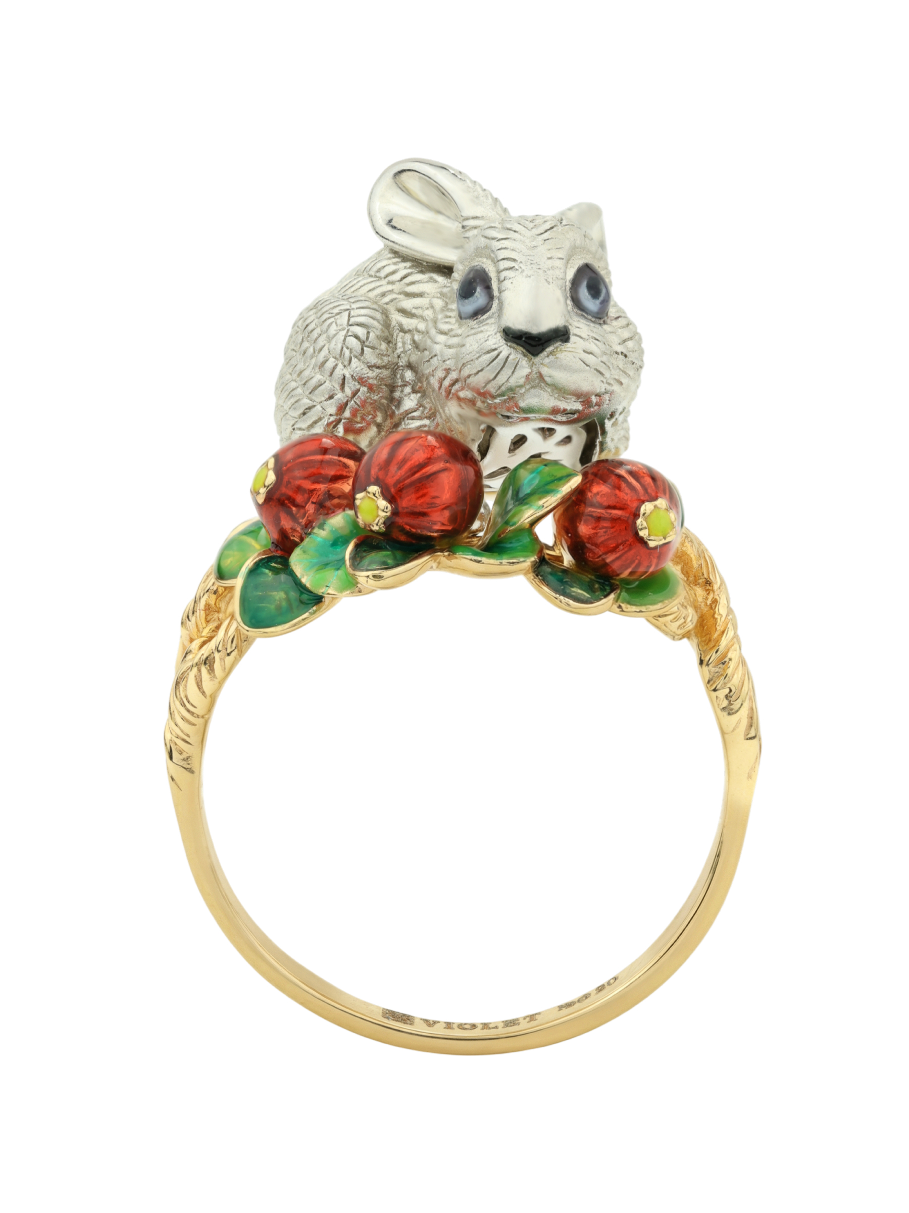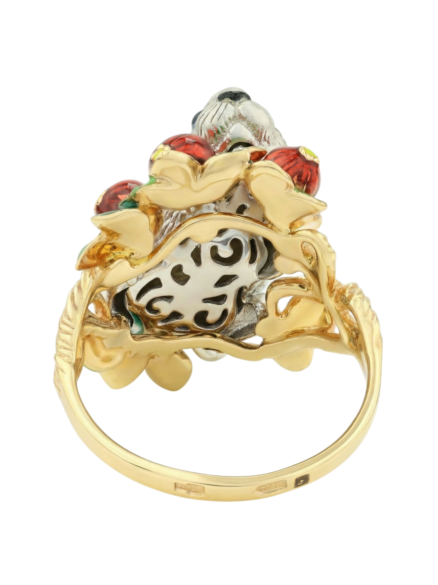 Изысканное кольцо из лимонного золота 585 пробы из коллекции De luxe Premium — Кролик станет ярким акцентом в вашем образе. Дизайн украшения воплощает сказочную эстетику: центральным элементом композиции является искусная фигурка зайца, дополненная деталями с разноцветной эмалью, которые придают изделию живой и выразительный вид. Сочетание благородного лимонного золота и сочных оттенков эмали создает гармоничную игру цвета, подчеркивающую ювелирное мастерство.