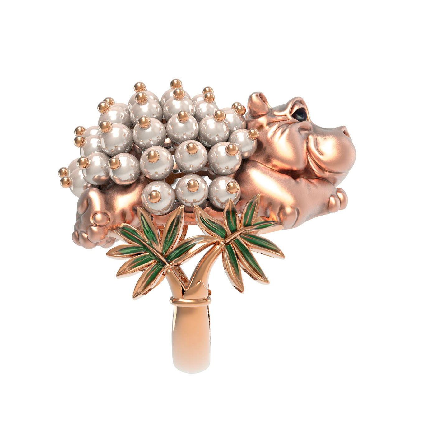 Особую выразительность дизайну придает искусная комбинация вставок. Мастера ювелирного дела использовали 49 вставок круглого жемчуга белого цвета, которые эффектно украшают спинку фигурки, создавая объем и невероятную игру света. Дополнительный акцент вносит яркая эмаль разноцветных оттенков, подчеркивающая детали композиции. Теплый оттенок красного золота гармонично объединяет все элементы в единый ансамбль.