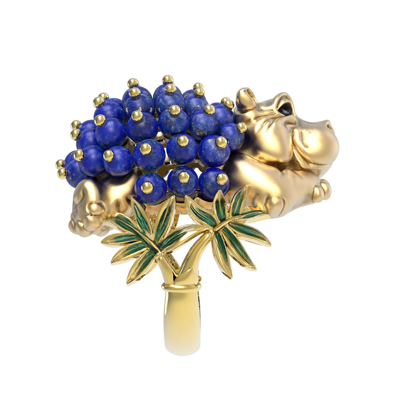 Особую художественную выразительность кольцу придает сочетание материалов. Основным акцентом дизайна стали 49 вставок из лазурита, которые имеют форму бусин и создают насыщенный синий цвет. Гармоничным дополнением выступает яркая эмаль, добавляющая разноцветные оттенки в композицию изделия. Декор в виде тропических растений с эмалевым покрытием придает украшению завершенность и живость.