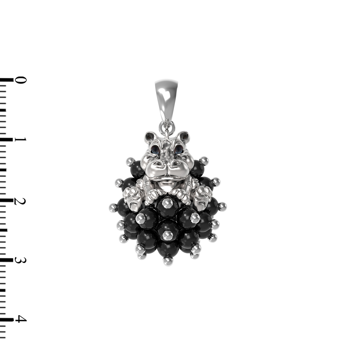 Центральным элементом композиции выступает объемный бегемот, выполненный из белого золота. Художественное исполнение дополняют вставки из оникса в форме бусин, расположенные по периметру изделия. Всего в украшении использовано 39 вставок глубокого черного цвета, которые создают эффектный контраст с холодным блеском благородного металла. Детали акцентированы с помощью разноцветной эмали, придающей подвеске дополнительную глубину и выразительность.