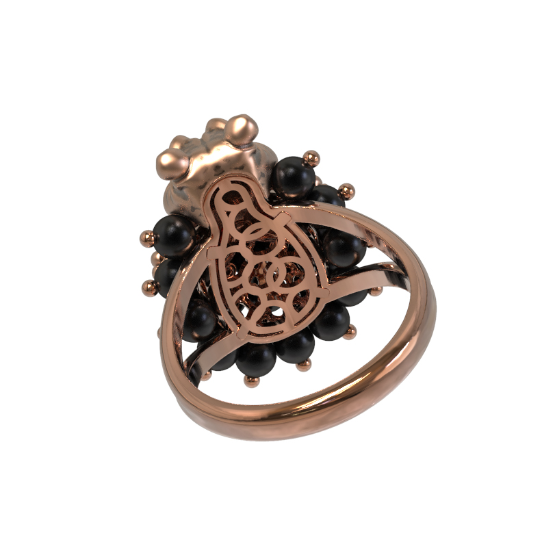 Особый шарм изделию придает богатая инкрустация: композиция включает 26 вставок из оникса черного цвета, выполненных в форме бусин. Глубокий блеск камня эффектно контрастирует с теплым оттенком красного золота. В оформлении также использована ювелирная эмаль, добавляющая разноцветные акценты и глубину общему художественному образу кольца.
