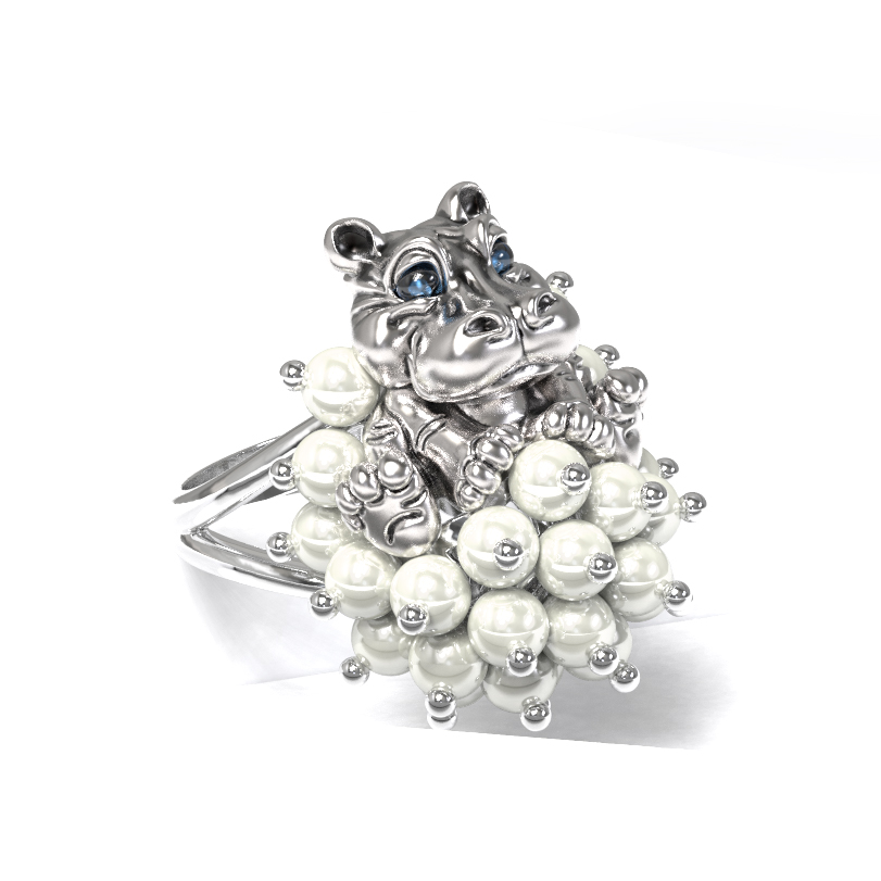 Откройте для себя оригинальное кольцо из коллекции De luxe Premium — Бегемотик, которое станет ярким акцентом в вашем образе. Это ювелирное изделие, выполненное в смелом дизайне, представляет собой искусное сочетание высокого ювелирного мастерства и необычной эстетики. Центральным элементом украшения выступает милая фигурка бегемотика, выполненная с проработкой мельчайших деталей, дополненная яркими акцентами эмали. Особую роскошь кольцу придает россыпь из 26 жемчужин круглой формы, которые создают эффектный объемный декор.