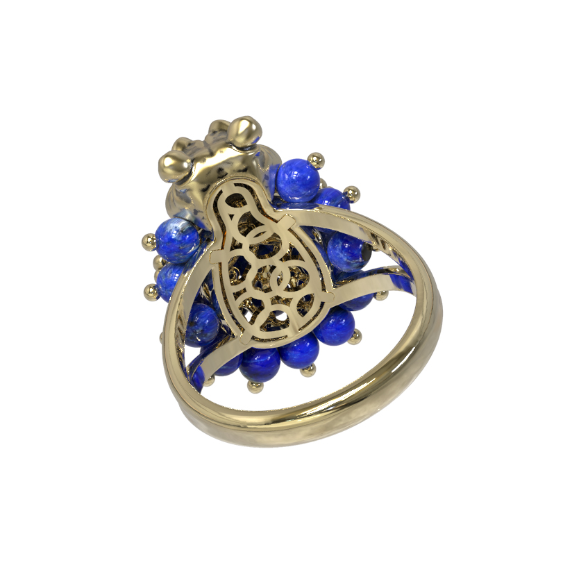 Декоративная часть изделия состоит из 26 вставок из лазурита, имеющих форму бусин. Насыщенный синий цвет натурального камня эффектно контрастирует с нежным оттенком лимонного золота, создавая гармоничное сочетание. Благодаря необычному дизайну с анималистическими мотивами, это кольцо одинаково хорошо подходит как для женщин, так и для мужчин, желающих подчеркнуть свою индивидуальность. Украшение станет смелым дополнением образа или частью изысканного комплекта.