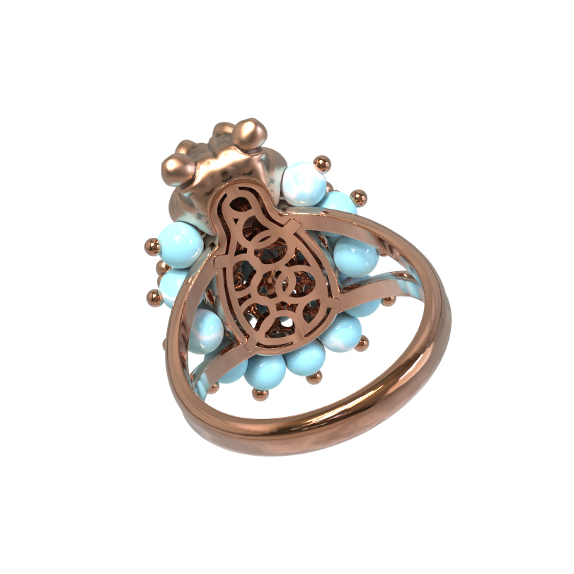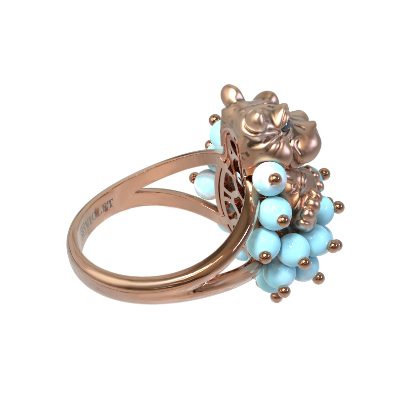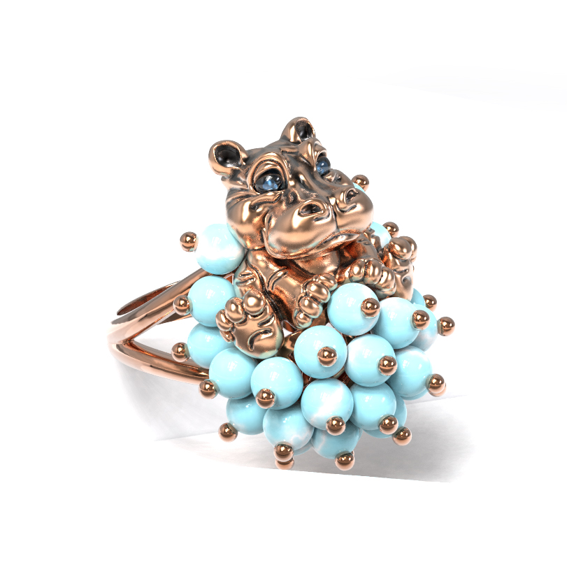 Оригинальное кольцо из красного золота 585 пробы — это смелое ювелирное решение для тех, кто ценит эксклюзивный дизайн и яркие акценты. Модель входит в коллекцию De luxe Premium — Бегемотик и привлекает внимание необычным исполнением в анималистическом стиле. Центральным элементом композиции является искусная фигурка бегемотика, выполненная из красного золота с элементами эмали. Этот декоративный образ дополнен россыпью из 26 вставок бирюзы в форме бусин, создающих эффектный объем и приятный контраст с благородным металлом.