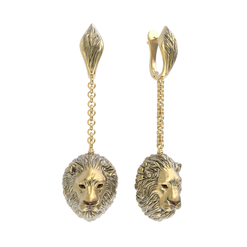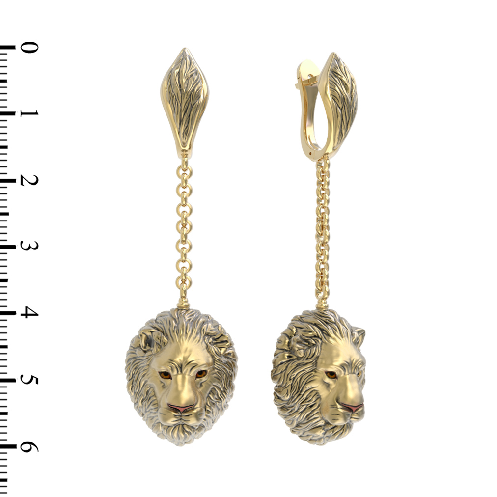 Изделие выполнено в благородном лимонном золоте, чей мягкий и теплый оттенок идеально дополняет сложную форму. Акценты в виде вставок из эмали добавляют глубины и выразительности, создавая интересный контраст. Разноцветная эмаль нанесена с филигранной аккуратностью, расставляя деликатные цветовые нюансы на образе льва. Конструкция серег дополнена подвижным цепочным элементом, благодаря чему украшение красиво струится и динамично движется при каждом повороте головы.