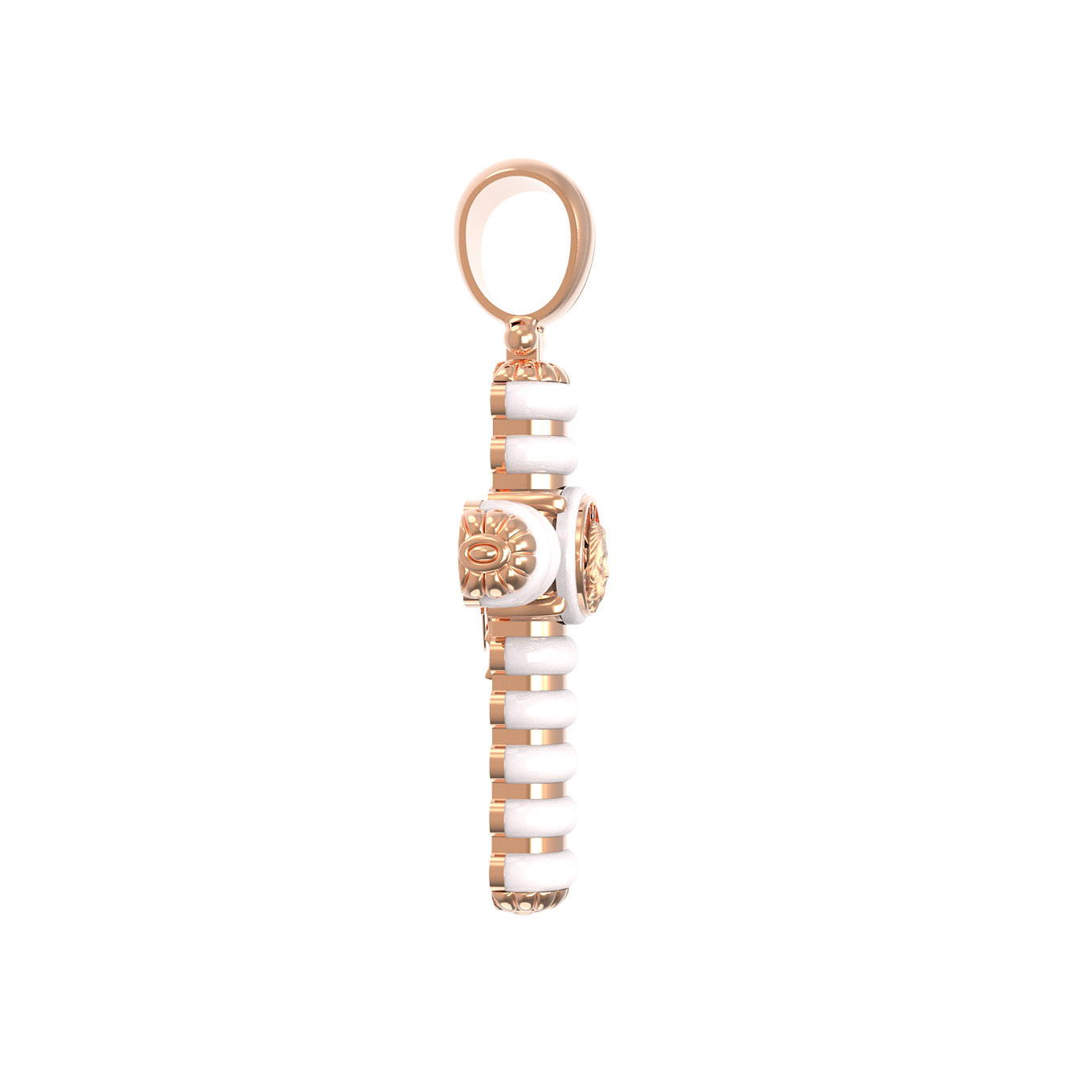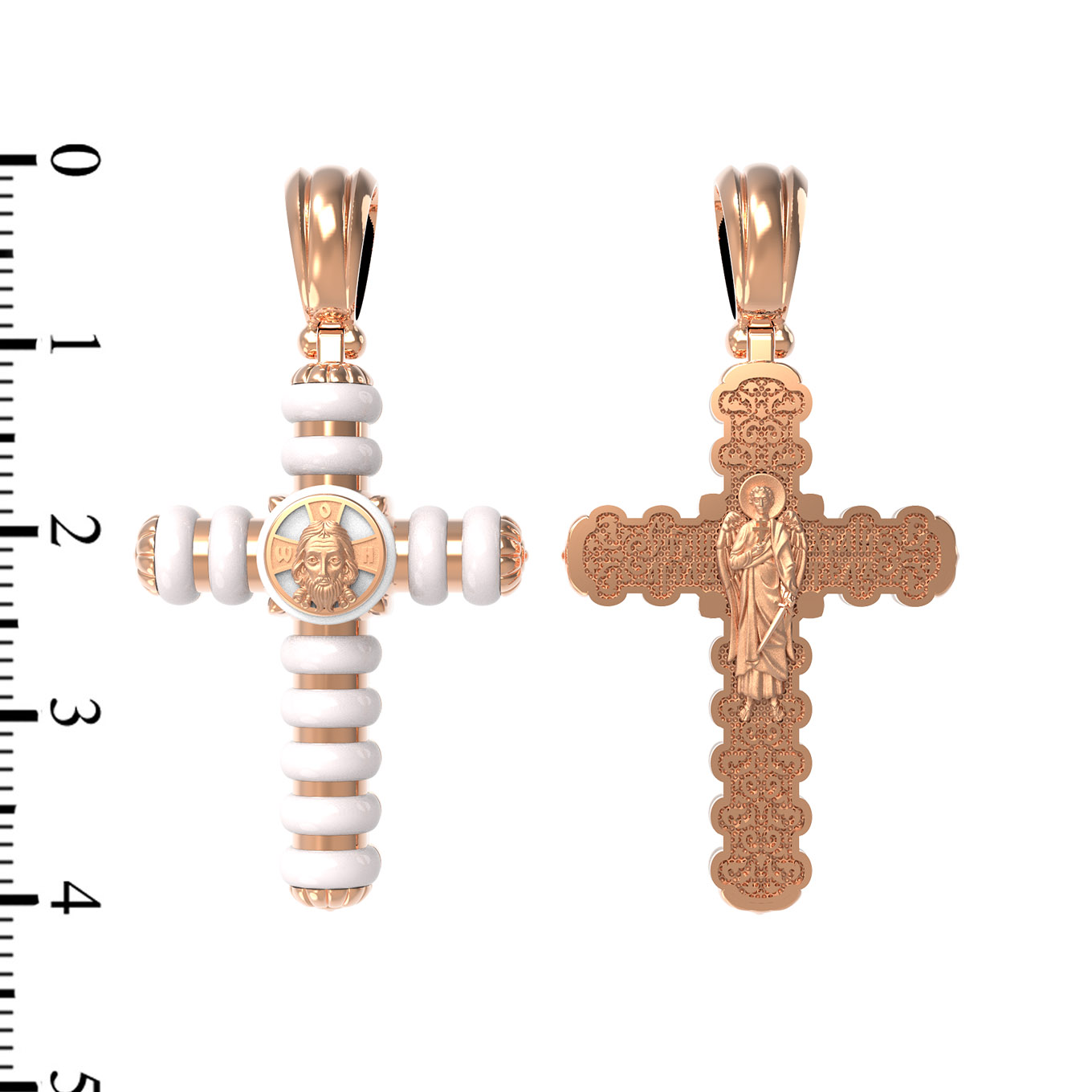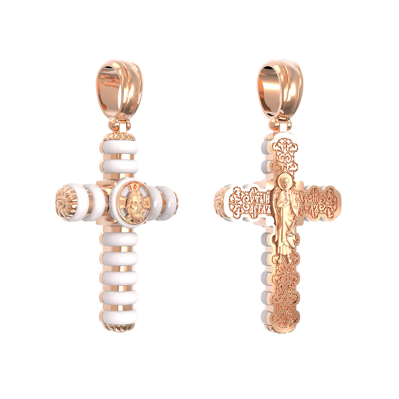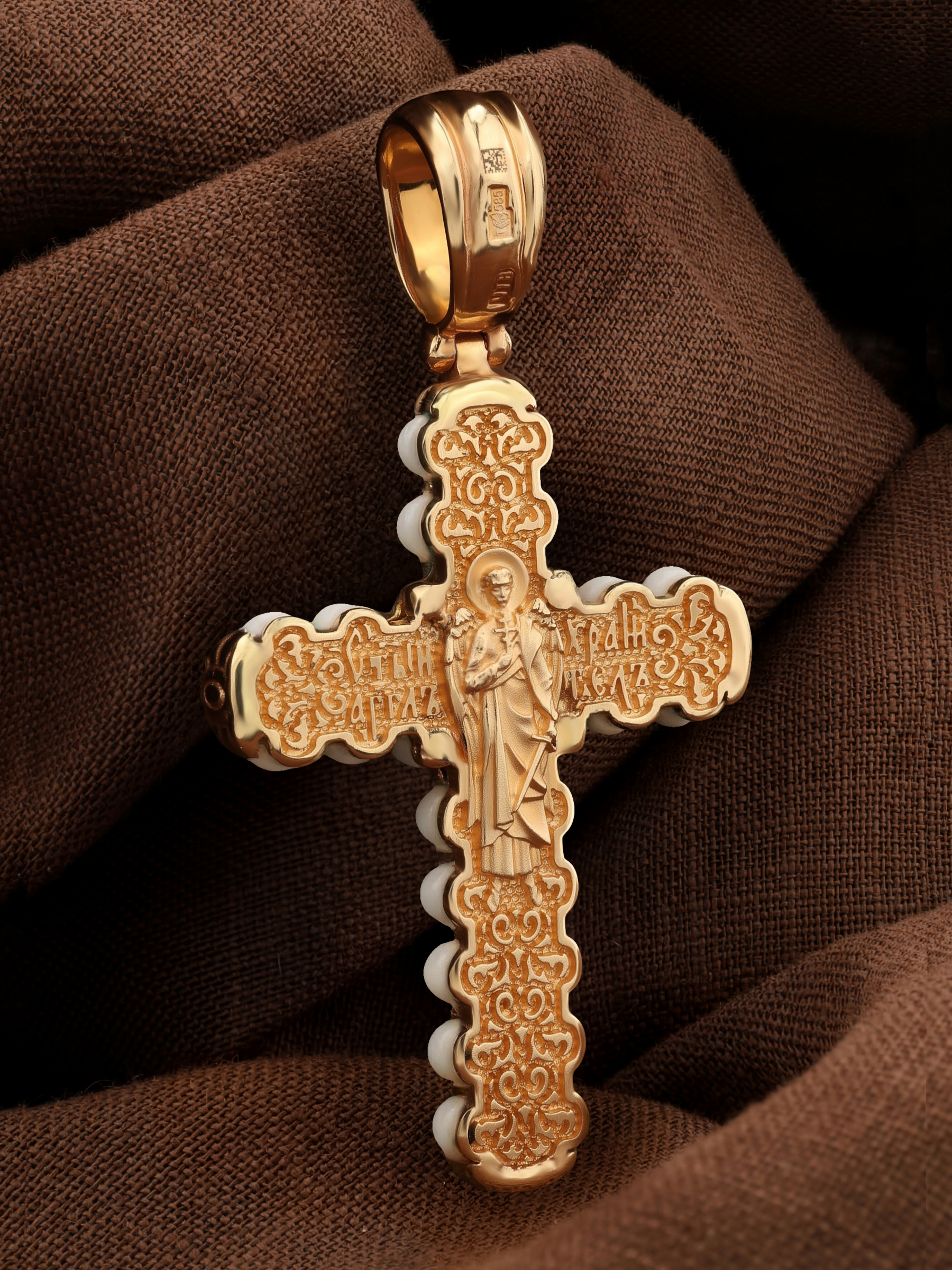 На оборотной стороне креста изображен святой Ангел-Хранитель в виде прекрасного юноши держащего в правой руке крест, а в левой — сферу. Ангел-Хранитель — это Ангел приставляемый Богом к человеку при крещении для охраны и помощи в добрых делах. Невидимо пребывая при нас постоянно, он, руководствуя нас ко спасению, не только по нашему желанию таинственно наставляет нас на все доброе и полезное, не только возносит наши молитвы к Богу, но еще и сам от себя охраняют и защищают нас от врагов видимых и невидимых, ходатайствует за нас пред Богом.