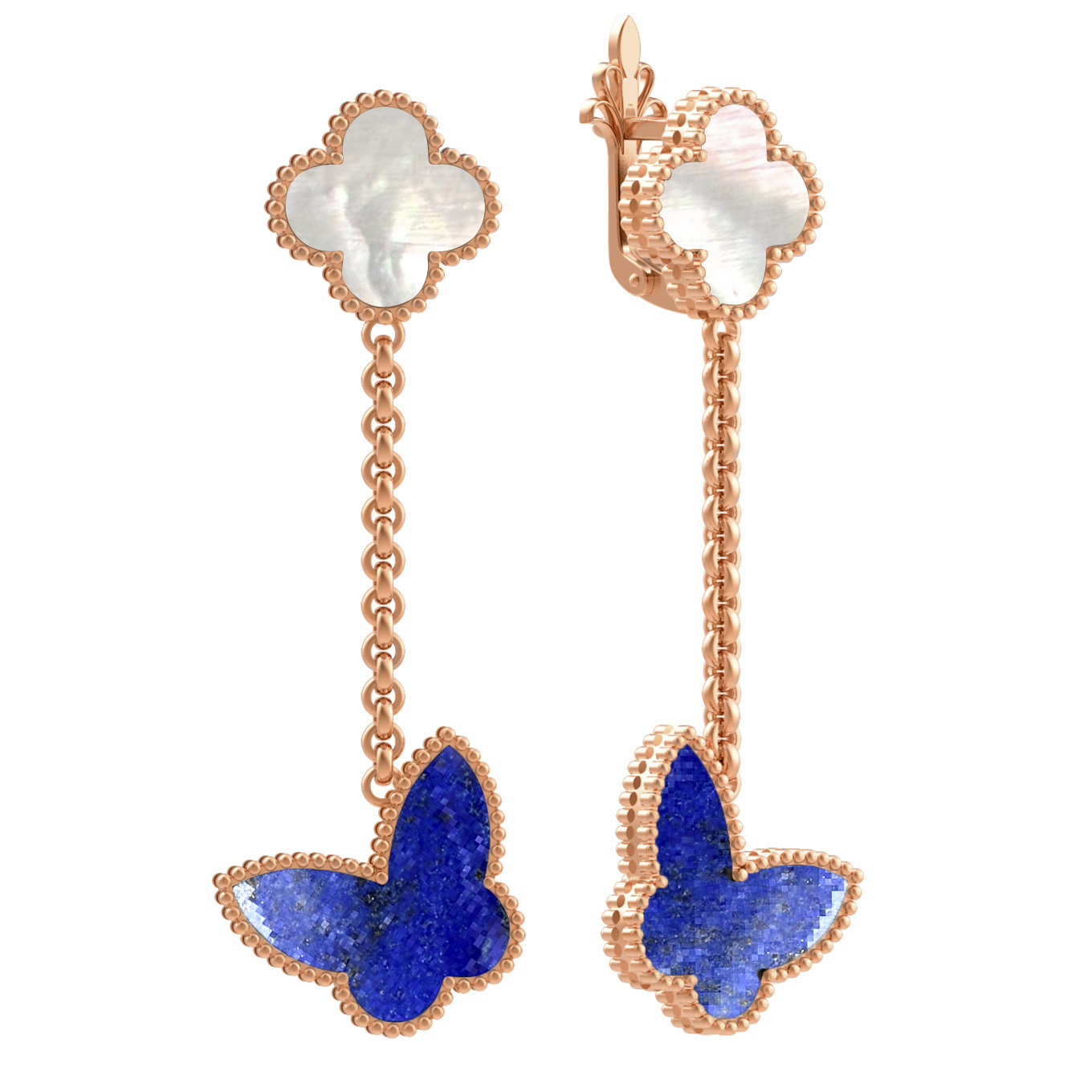 В центре композиции находится сочетание глубокого синего оттенка лазурита и нежного сияния перламутра. Перламутр дарит украшению мягкий свет, а лазурит наполняет его глубиной и насыщенным цветом. Каждая серьга инкрустирована вставками, что создает завершенный и гармоничный облик. Общее количество вставок составляет 2. Благодаря подвесной конструкции, бабочки из лазурита грациозно покачиваются при каждом движении, придавая образу динамику и легкость.