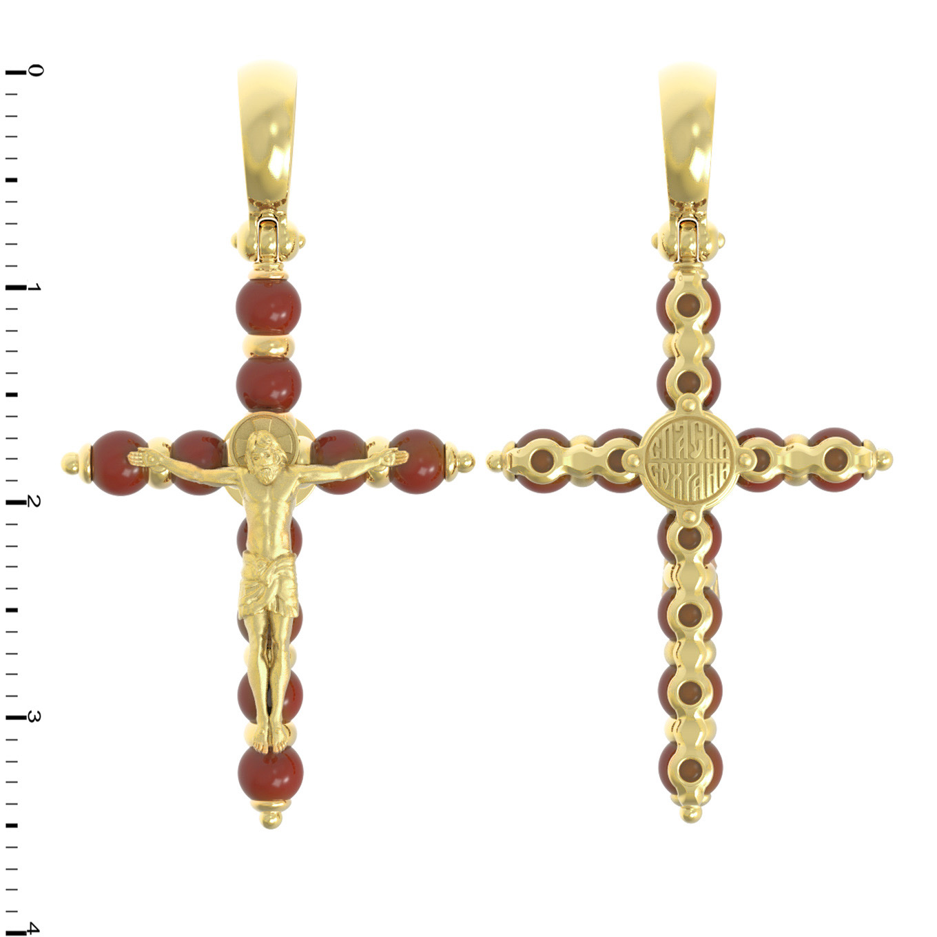 На лицевой стороне креста изображено Распятие Господа и Спасителя нашего Иисуса Христа. Своими крестными страданиями Господь смыл наши грехи, покрыл наш долг перед Богом или, на языке Писания, нас «искупил». В Голгофе сокрыта непостижимая тайна бесконечной правды и любви Бога. Крест стал символом победы добра над злом, жизни над смертью, напоминанием бесконечной Божьей любви, предметом радости. Воплотившийся Сын Божий Своею кровью освятил крест и сделал его проводником Своей благодати, источником освящения верующих.