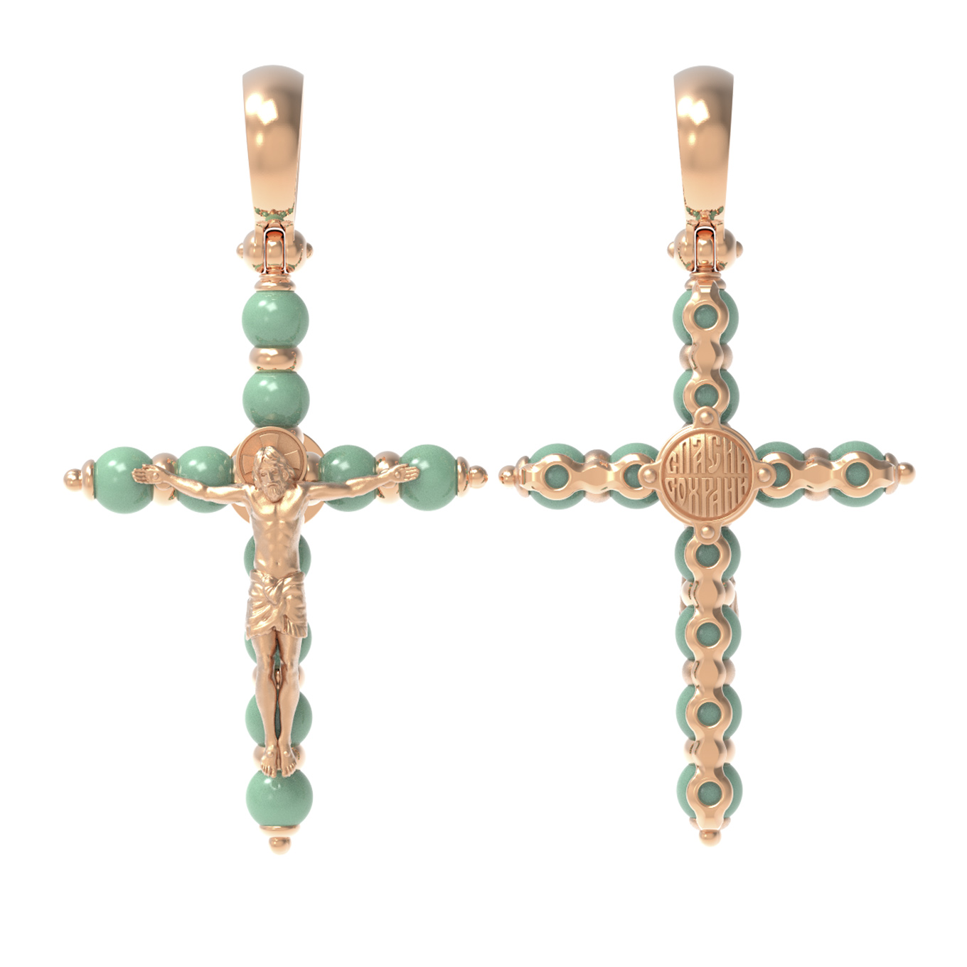 На лицевой стороне креста изображено Распятие Господа и Спасителя нашего Иисуса Христа. Своими крестными страданиями Господь смыл наши грехи, покрыл наш долг перед Богом или, на языке Писания, нас «искупил». В Голгофе сокрыта непостижимая тайна бесконечной правды и любви Бога. Крест стал символом победы добра над злом, жизни над смертью, напоминанием бесконечной Божьей любви, предметом радости. Воплотившийся Сын Божий Своею кровью освятил крест и сделал его проводником Своей благодати, источником освящения верующих.