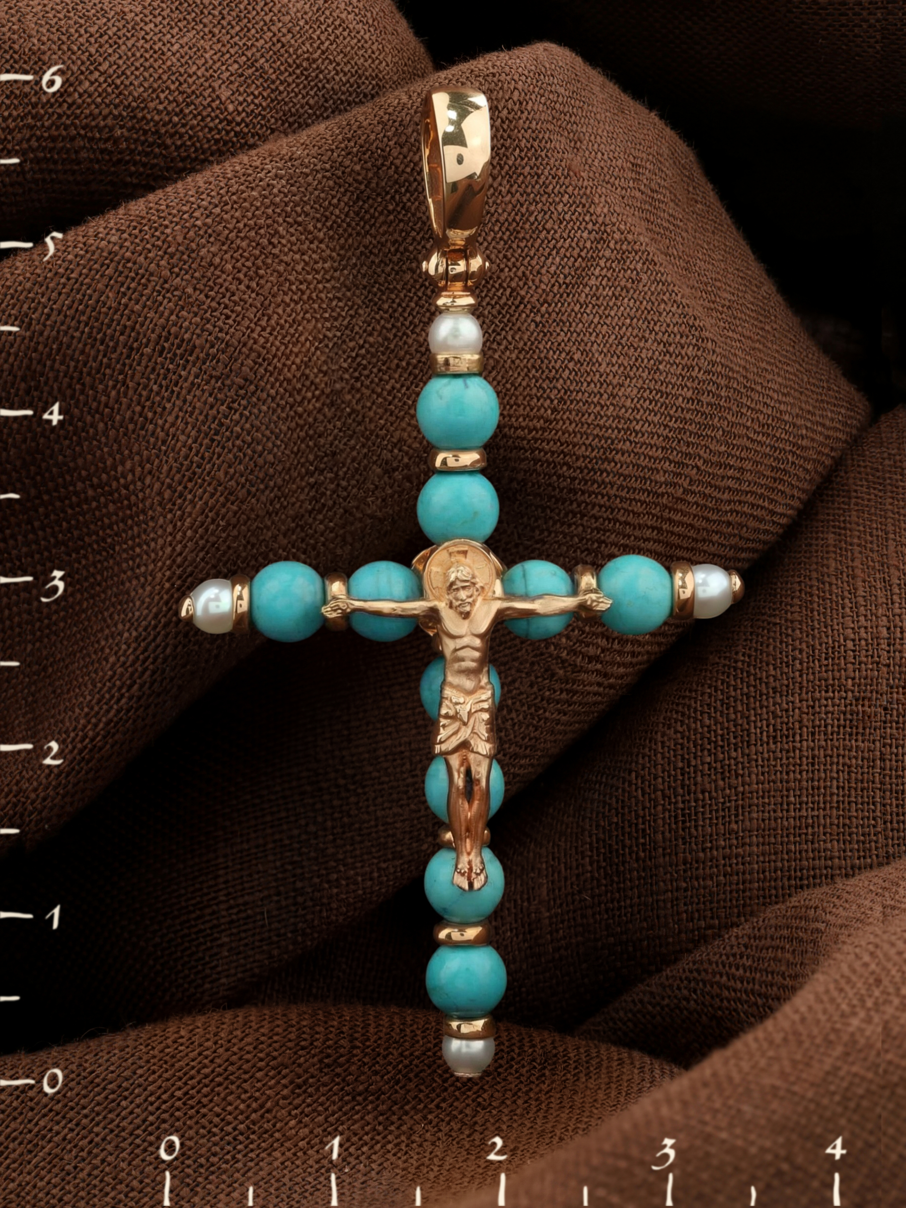 На лицевой стороне креста изображено Распятие Господа и Спасителя нашего Иисуса Христа. Своими крестными страданиями Господь смыл наши грехи, покрыл наш долг перед Богом или, на языке Писания, нас «искупил». В Голгофе сокрыта непостижимая тайна бесконечной правды и любви Бога. Крест стал символом победы добра над злом, жизни над смертью, напоминанием бесконечной Божьей любви, предметом радости. Воплотившийся Сын Божий Своею кровью освятил крест и сделал его проводником Своей благодати, источником освящения верующих. На верхней табличке, выше головы Иисуса, расположена надпись, составленная Понтием Пилатом — «IНЦI». Она означает «Иисус Назорей, Царь Иудейский». Надпись «IC» «ХC», означает Иисус Христос, помещаются на разных сторонах поперечной перекладины креста. Христос в Своей Божественной любви, над которой смерть не властна и которая, страдая, и не страдает в обычном смысле, простирает к людям со Креста Свои объятия, в которые призывается и привлекается весь мир. Поэтому Тело Его не висит, а торжественно покоится на Кресте.