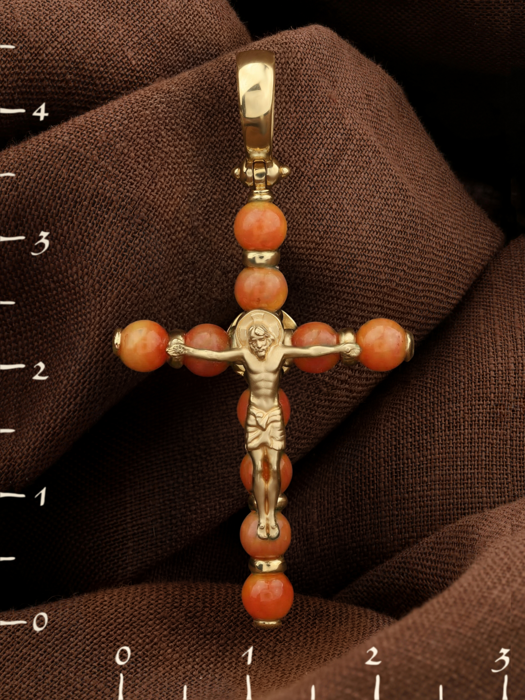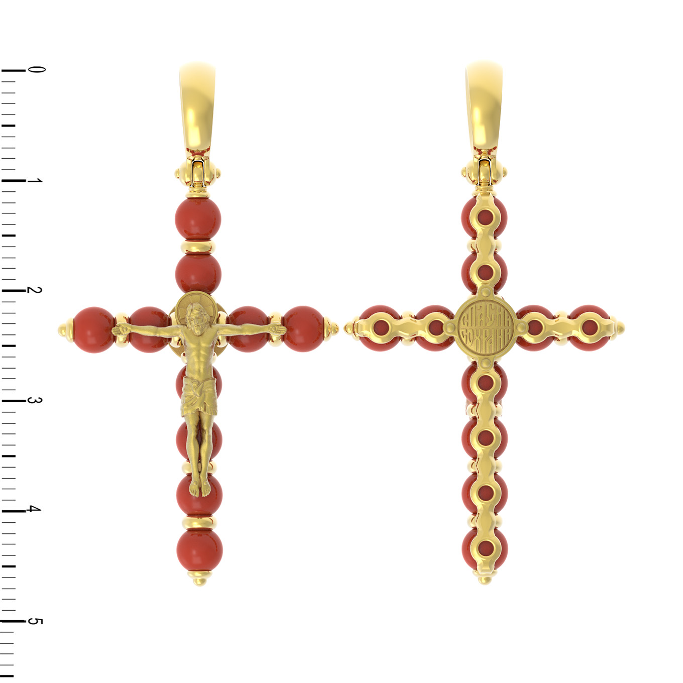 На лицевой стороне креста изображено Распятие Господа и Спасителя нашего Иисуса Христа. Своими крестными страданиями Господь смыл наши грехи, покрыл наш долг перед Богом или, на языке Писания, нас «искупил». В Голгофе сокрыта непостижимая тайна бесконечной правды и любви Бога. Крест стал символом победы добра над злом, жизни над смертью, напоминанием бесконечной Божьей любви, предметом радости. Воплотившийся Сын Божий Своею кровью освятил крест и сделал его проводником Своей благодати, источником освящения верующих. На верхней табличке, выше головы Иисуса, расположена надпись, составленная Понтием Пилатом — «IНЦI». Она означает «Иисус Назорей, Царь Иудейский». Надпись «IC» «ХC», означает Иисус Христос, помещаются на разных сторонах поперечной перекладины креста. Христос в Своей Божественной любви, над которой смерть не властна и которая, страдая, и не страдает в обычном смысле, простирает к людям со Креста Свои объятия, в которые призывается и привлекается весь мир. Поэтому Тело Его не висит, а торжественно покоится на Кресте.