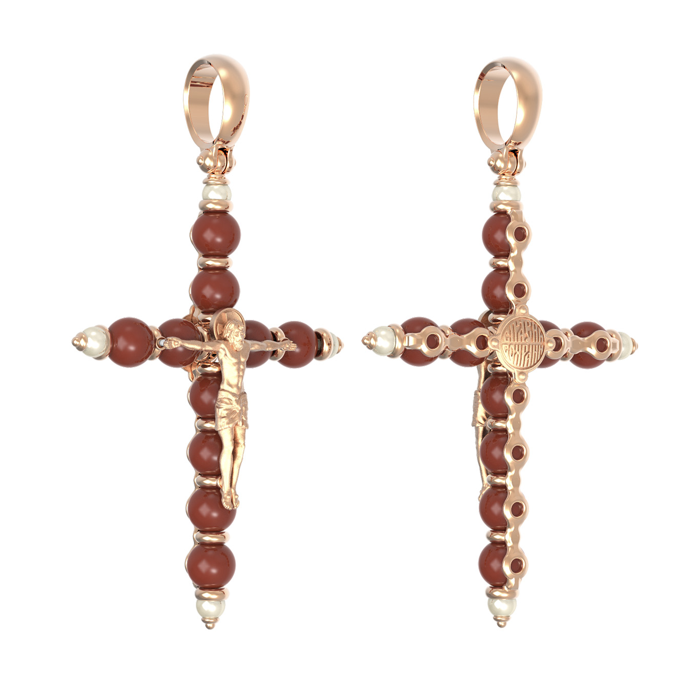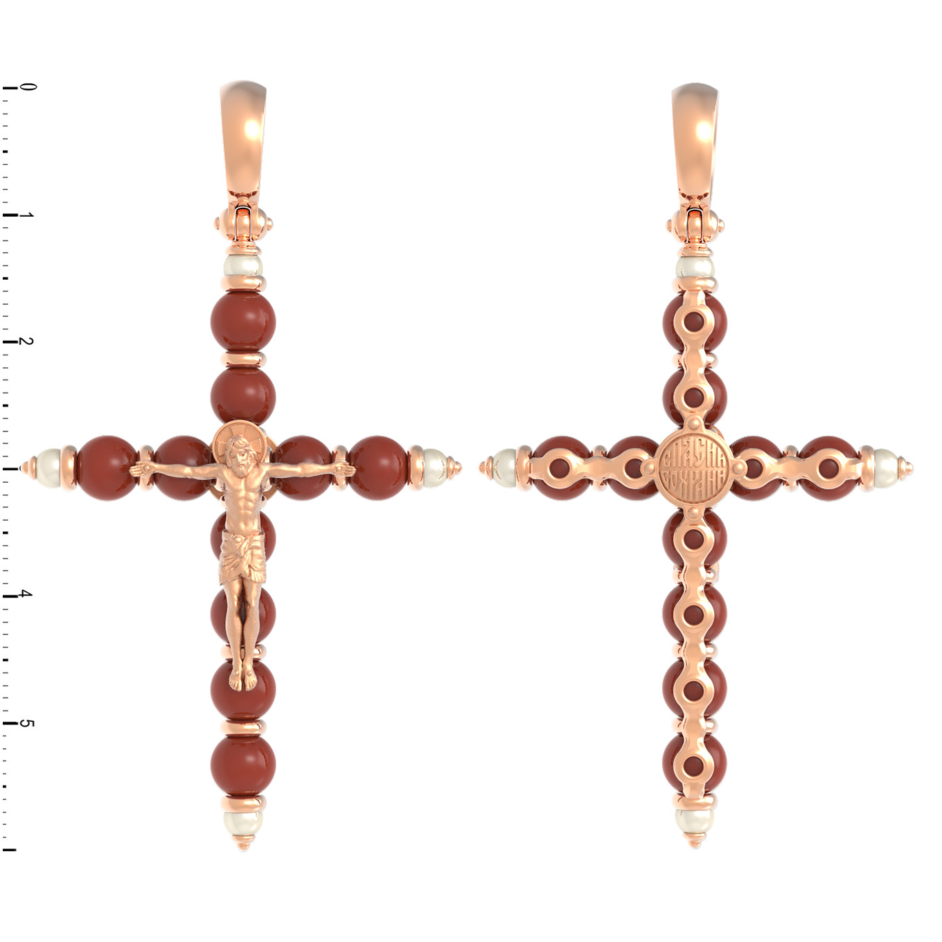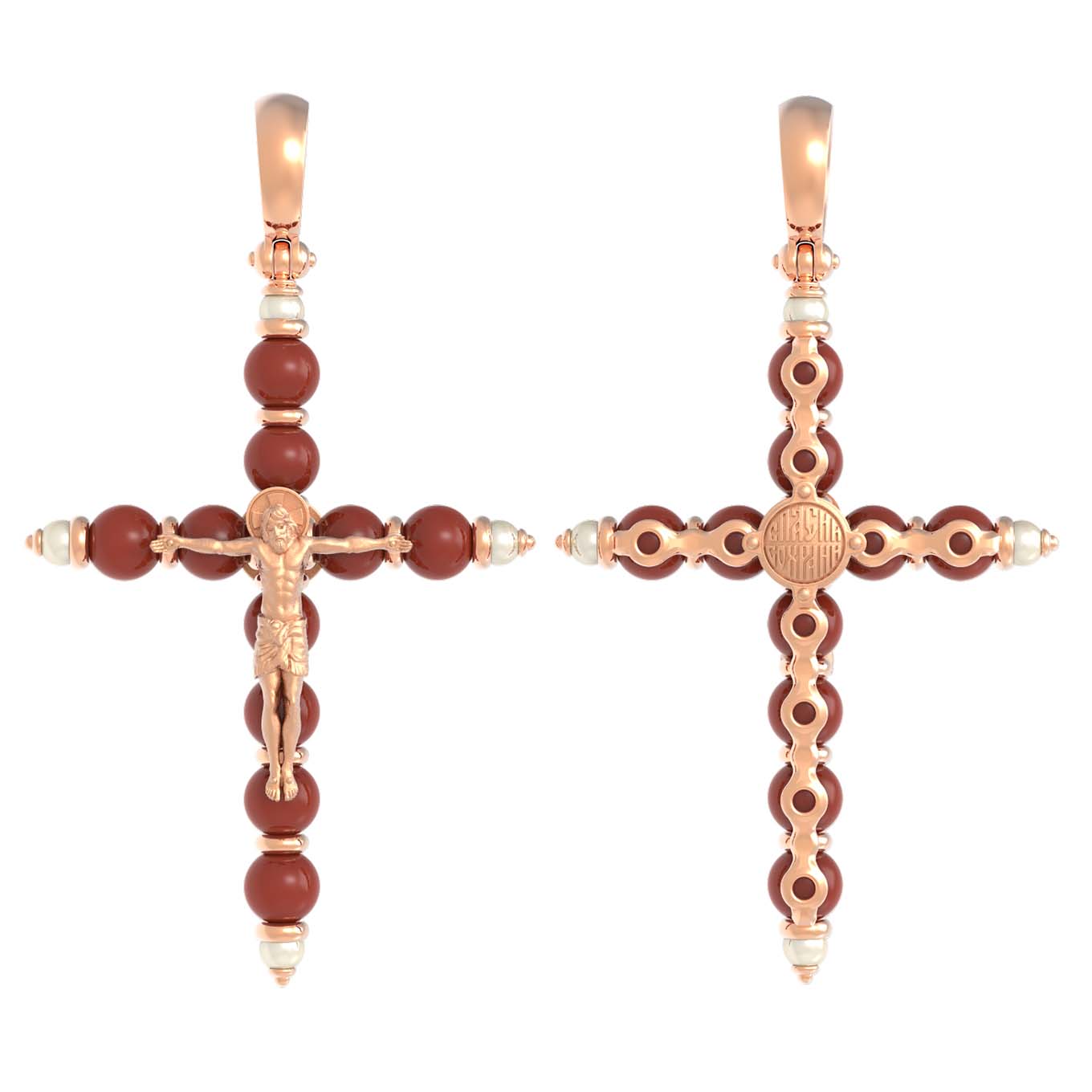 Крест из красного золота 585 пробы c жемчугом и кораллом