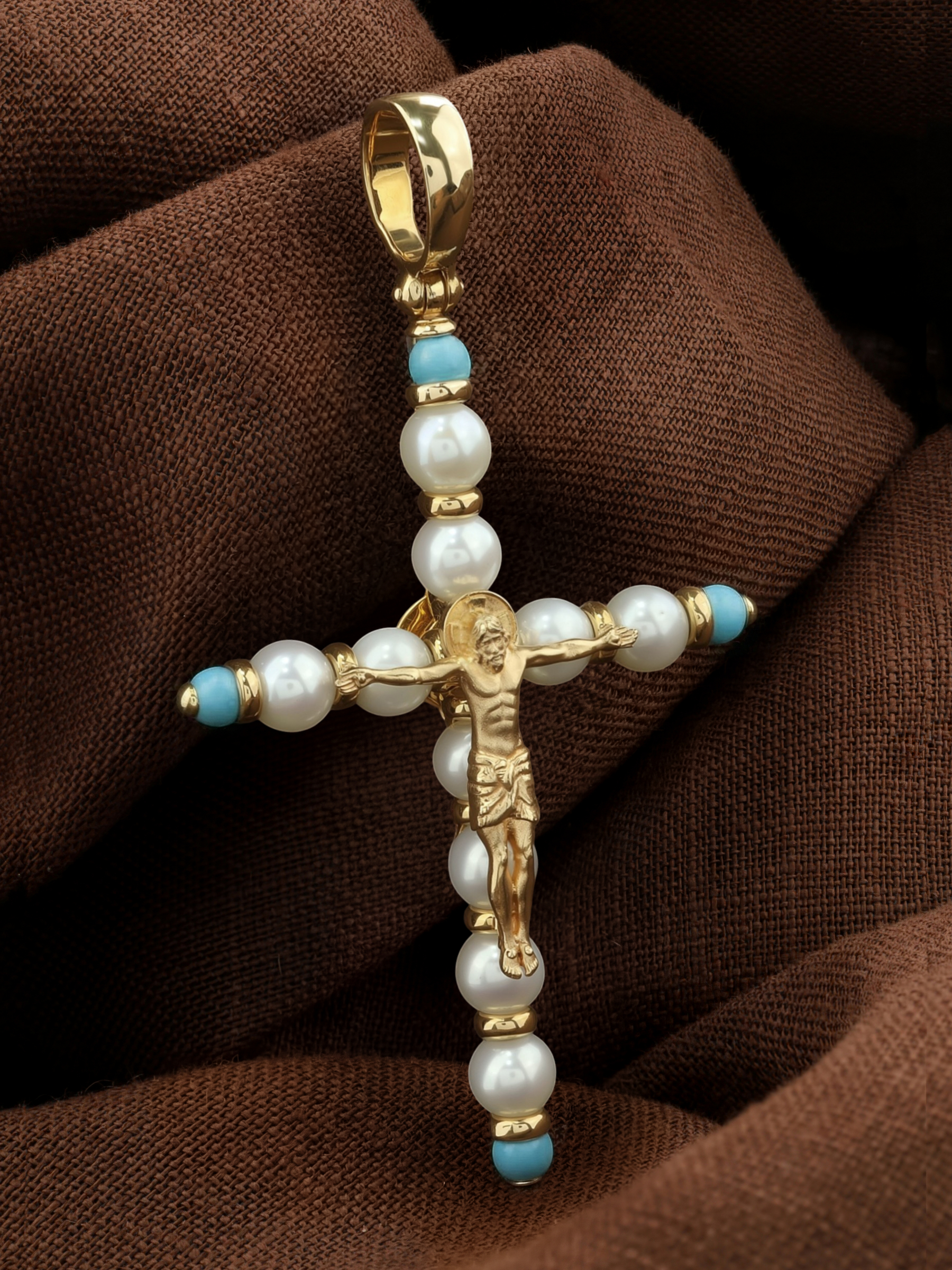На лицевой стороне креста изображено Распятие Господа и Спасителя нашего Иисуса Христа. Своими крестными страданиями Господь смыл наши грехи, покрыл наш долг перед Богом или, на языке Писания, нас «искупил». В Голгофе сокрыта непостижимая тайна бесконечной правды и любви Бога. Крест стал символом победы добра над злом, жизни над смертью, напоминанием бесконечной Божьей любви, предметом радости. Воплотившийся Сын Божий Своею кровью освятил крест и сделал его проводником Своей благодати, источником освящения верующих. На верхней табличке, выше головы Иисуса, расположена надпись, составленная Понтием Пилатом — «IНЦI». Она означает «Иисус Назорей, Царь Иудейский». Надпись «IC» «ХC», означает Иисус Христос, помещаются на разных сторонах поперечной перекладины креста. Христос в Своей Божественной любви, над которой смерть не властна и которая, страдая, и не страдает в обычном смысле, простирает к людям со Креста Свои объятия, в которые призывается и привлекается весь мир. Поэтому Тело Его не висит, а торжественно покоится на Кресте.