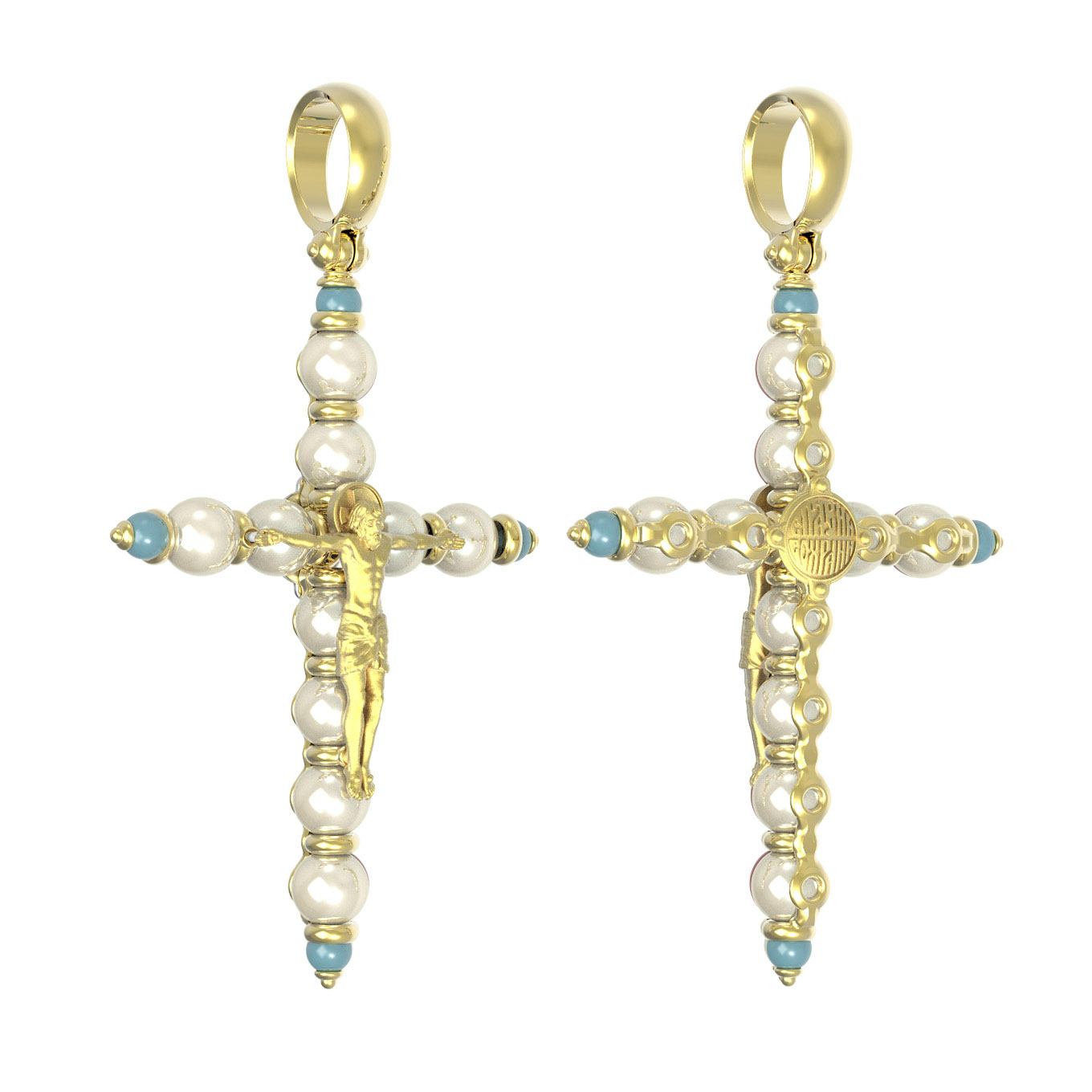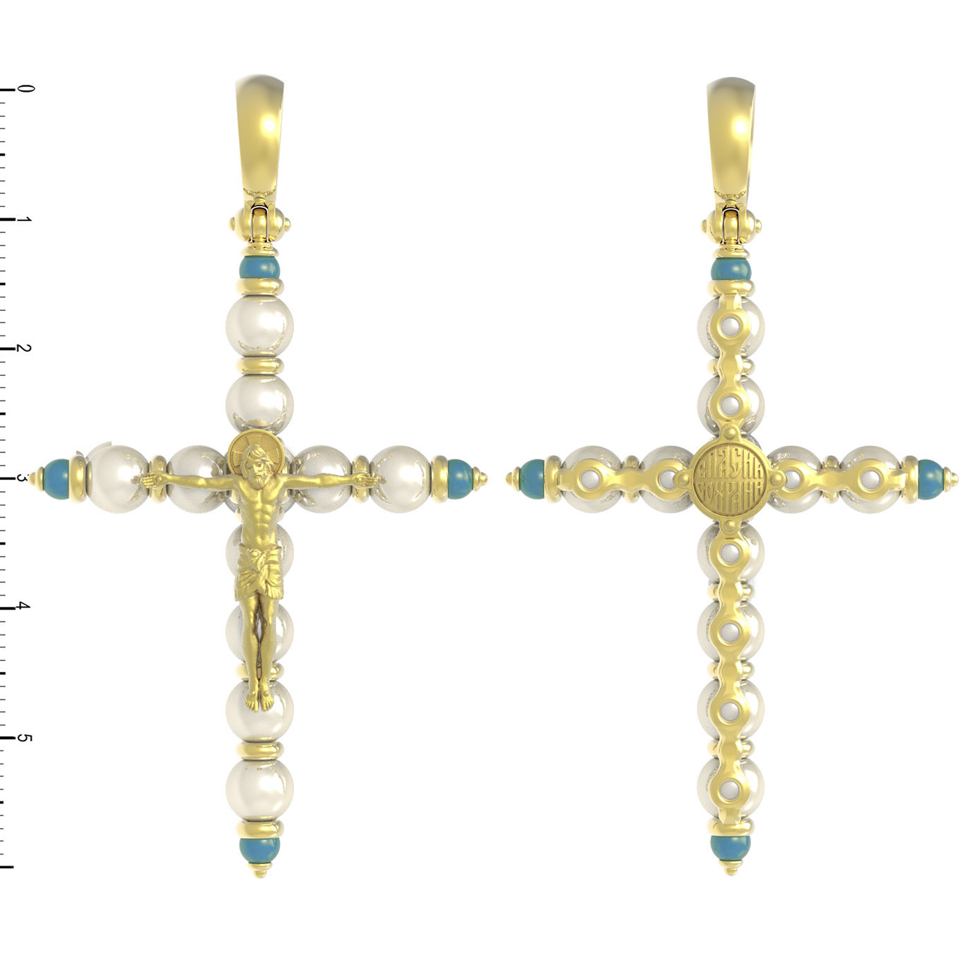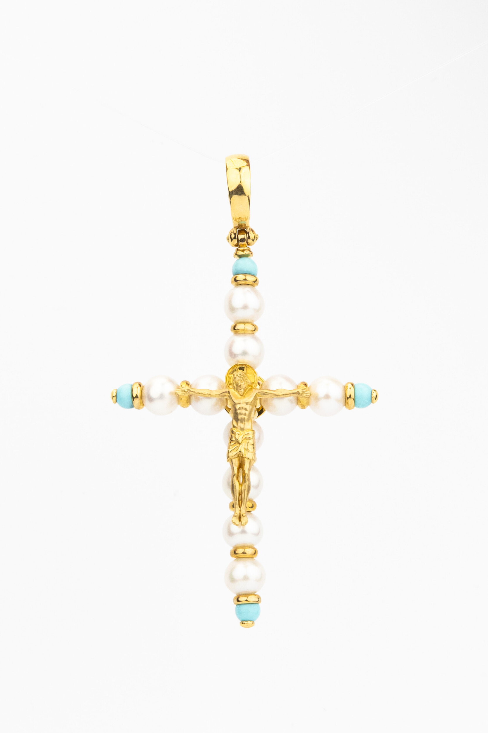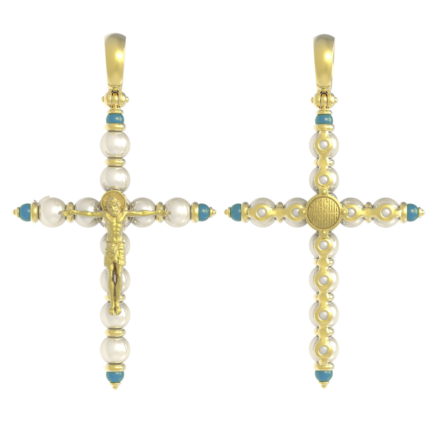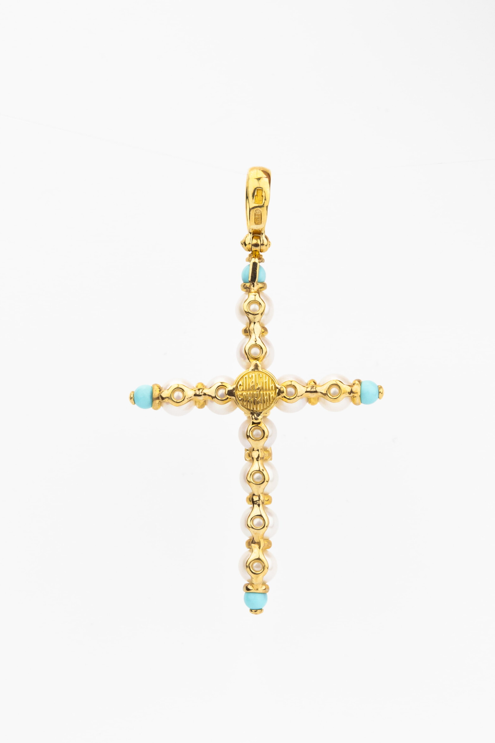 Крест из лимонного золота 585 пробы c жемчугом и бирюзой