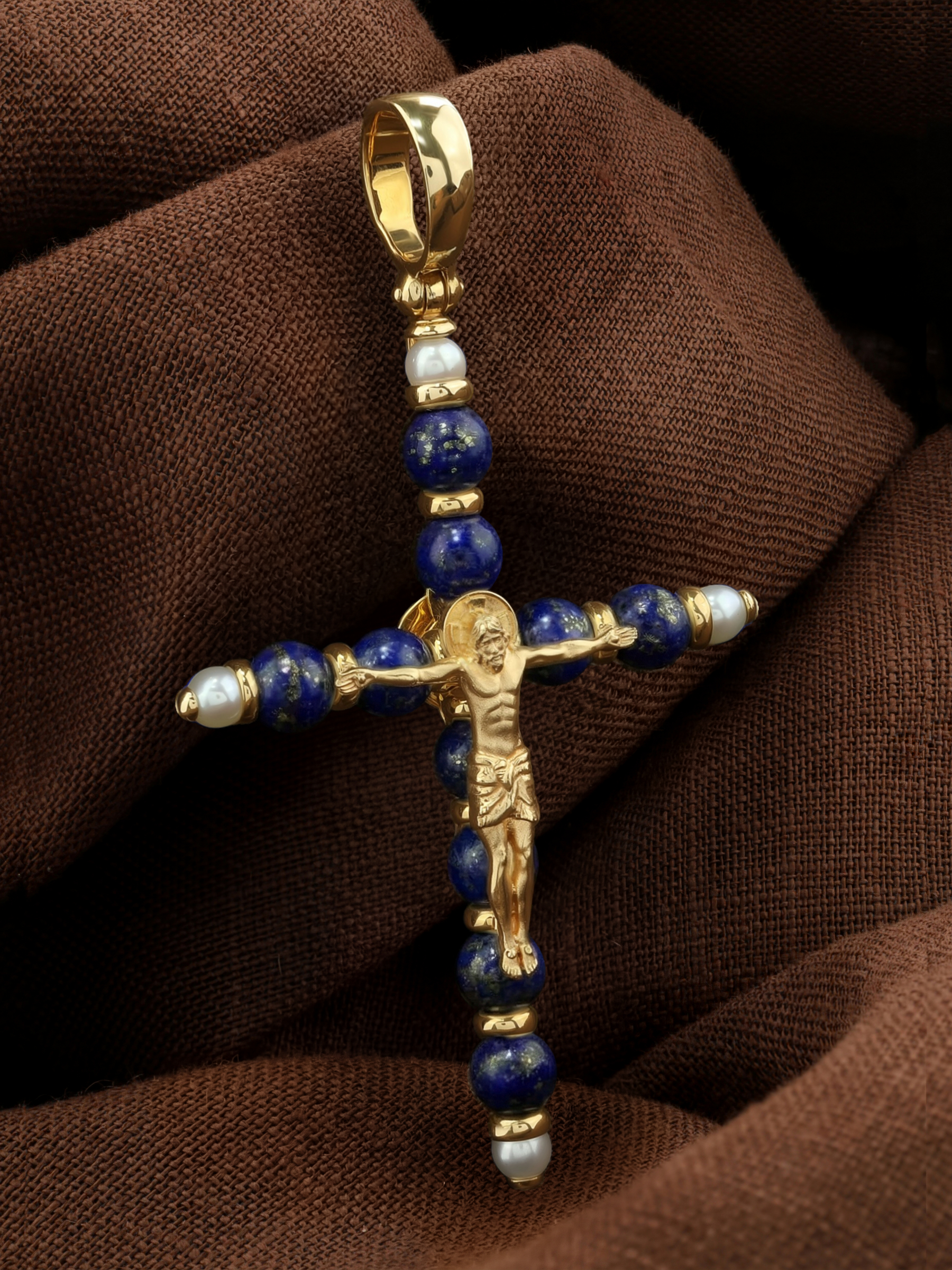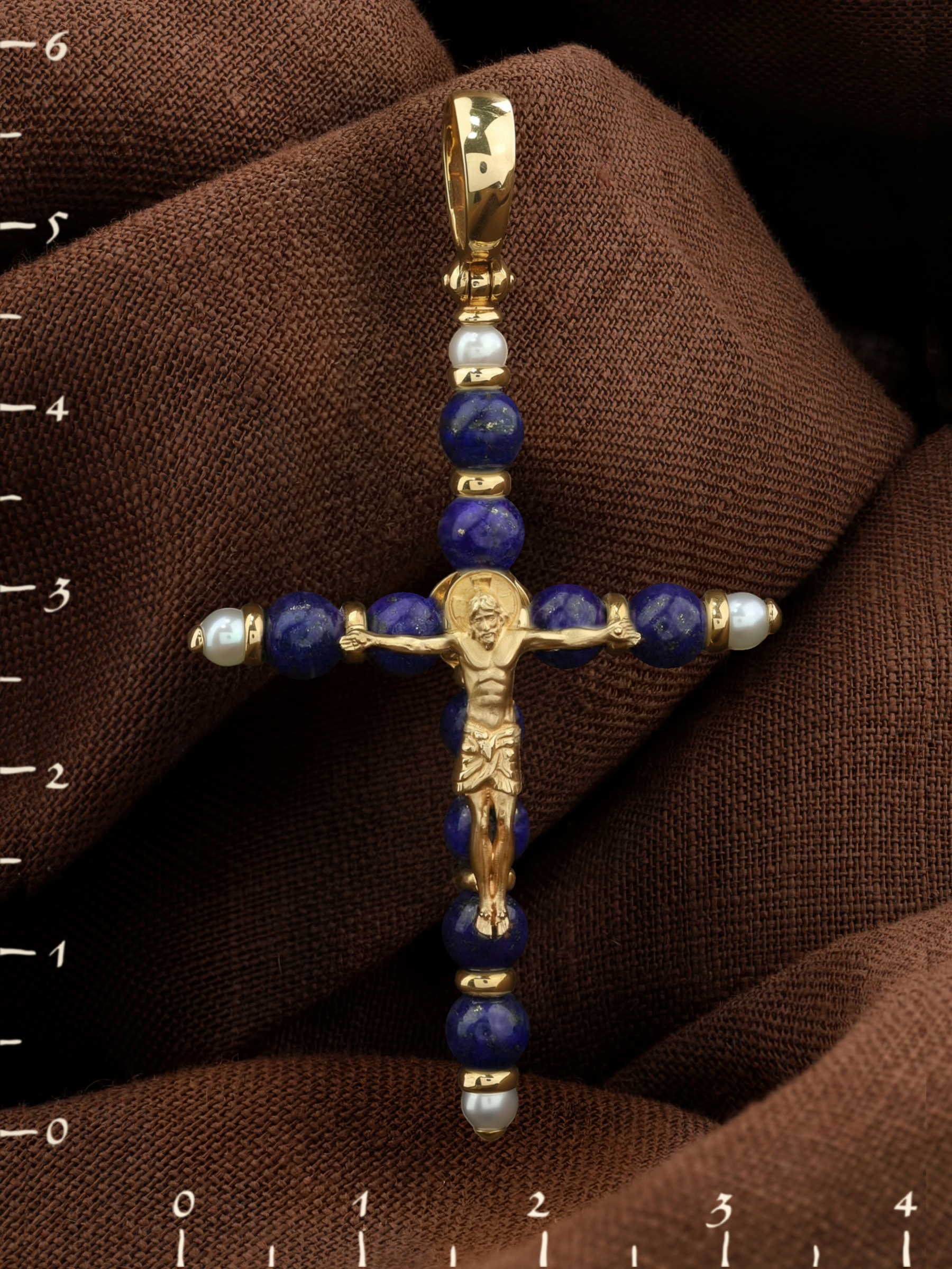 На лицевой стороне креста изображено Распятие Господа и Спасителя нашего Иисуса Христа. Своими крестными страданиями Господь смыл наши грехи, покрыл наш долг перед Богом или, на языке Писания, нас «искупил». В Голгофе сокрыта непостижимая тайна бесконечной правды и любви Бога. Крест стал символом победы добра над злом, жизни над смертью, напоминанием бесконечной Божьей любви, предметом радости. Воплотившийся Сын Божий Своею кровью освятил крест и сделал его проводником Своей благодати, источником освящения верующих. На верхней табличке, выше головы Иисуса, расположена надпись, составленная Понтием Пилатом — «IНЦI». Она означает «Иисус Назорей, Царь Иудейский». Надпись «IC» «ХC», означает Иисус Христос, помещаются на разных сторонах поперечной перекладины креста. Христос в Своей Божественной любви, над которой смерть не властна и которая, страдая, и не страдает в обычном смысле, простирает к людям со Креста Свои объятия, в которые призывается и привлекается весь мир. Поэтому Тело Его не висит, а торжественно покоится на Кресте.