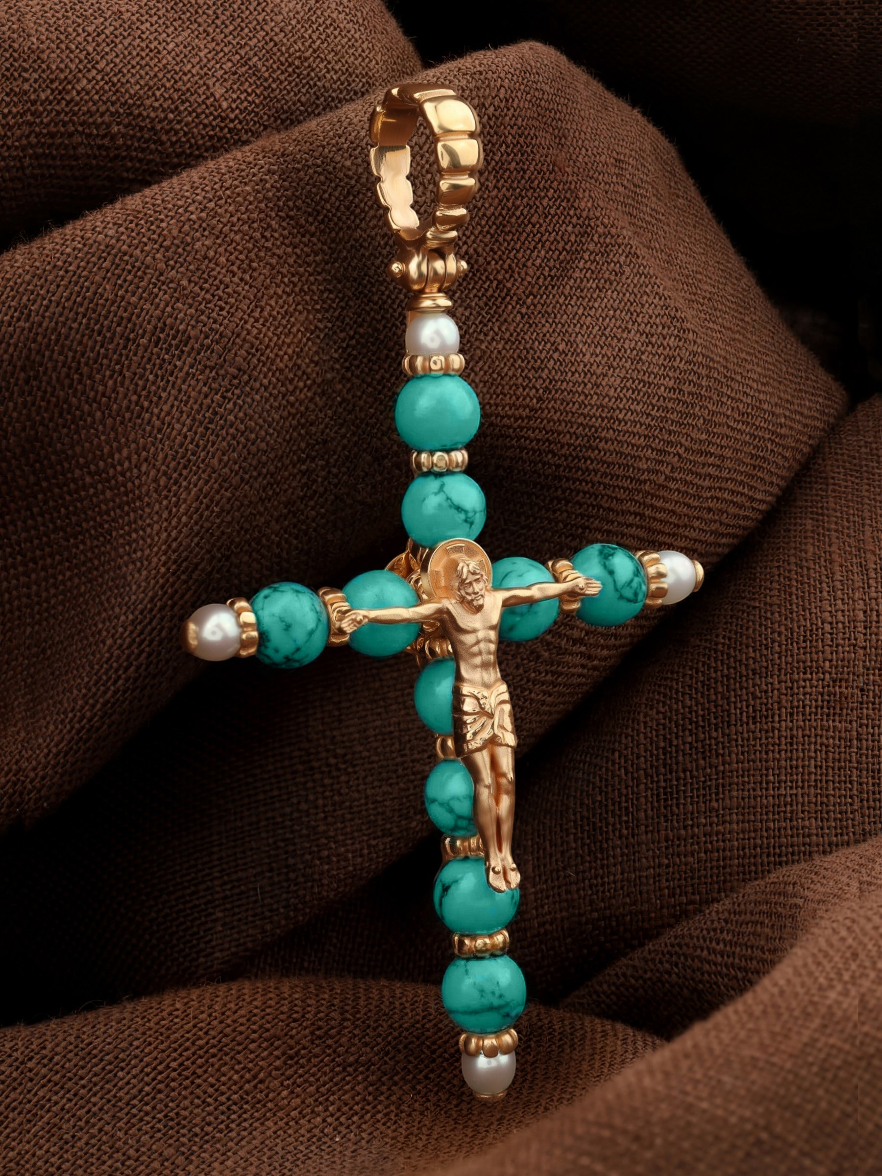 Крест из золота c жемчугом и бирюзой