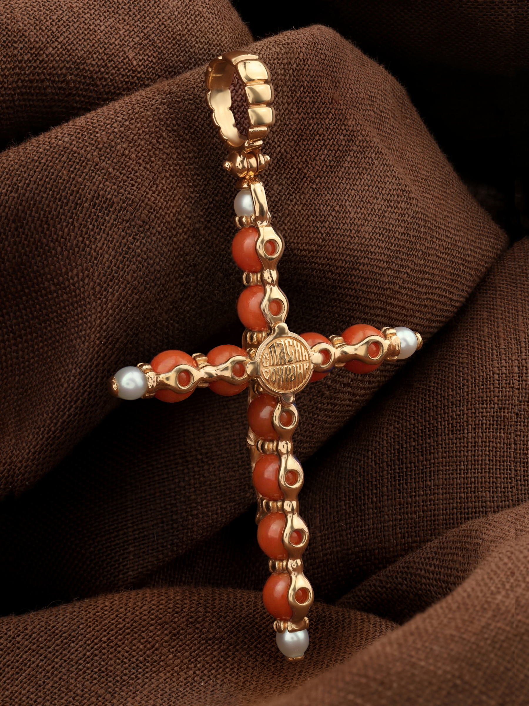 Крест из золота c жемчугом и кораллом