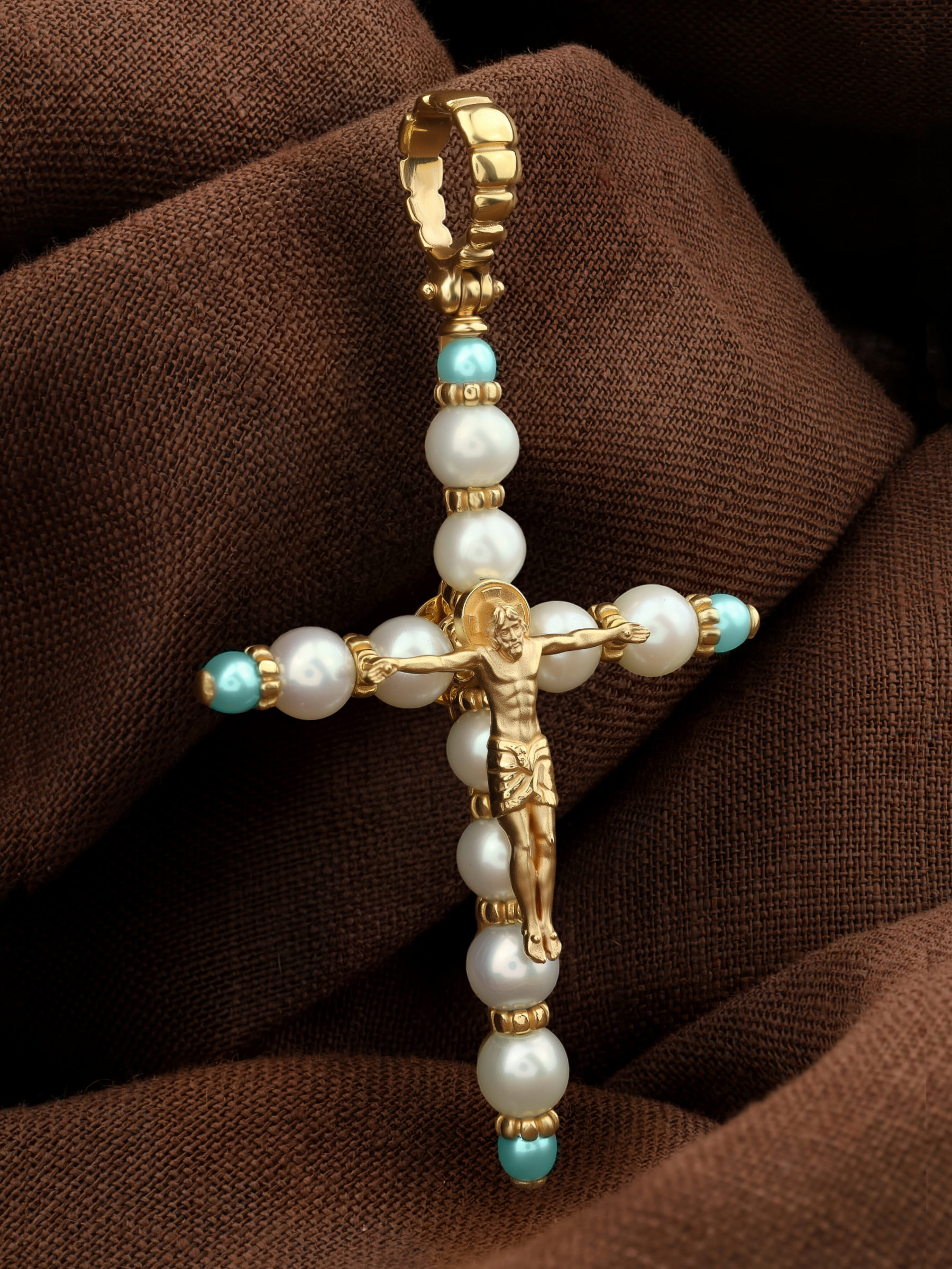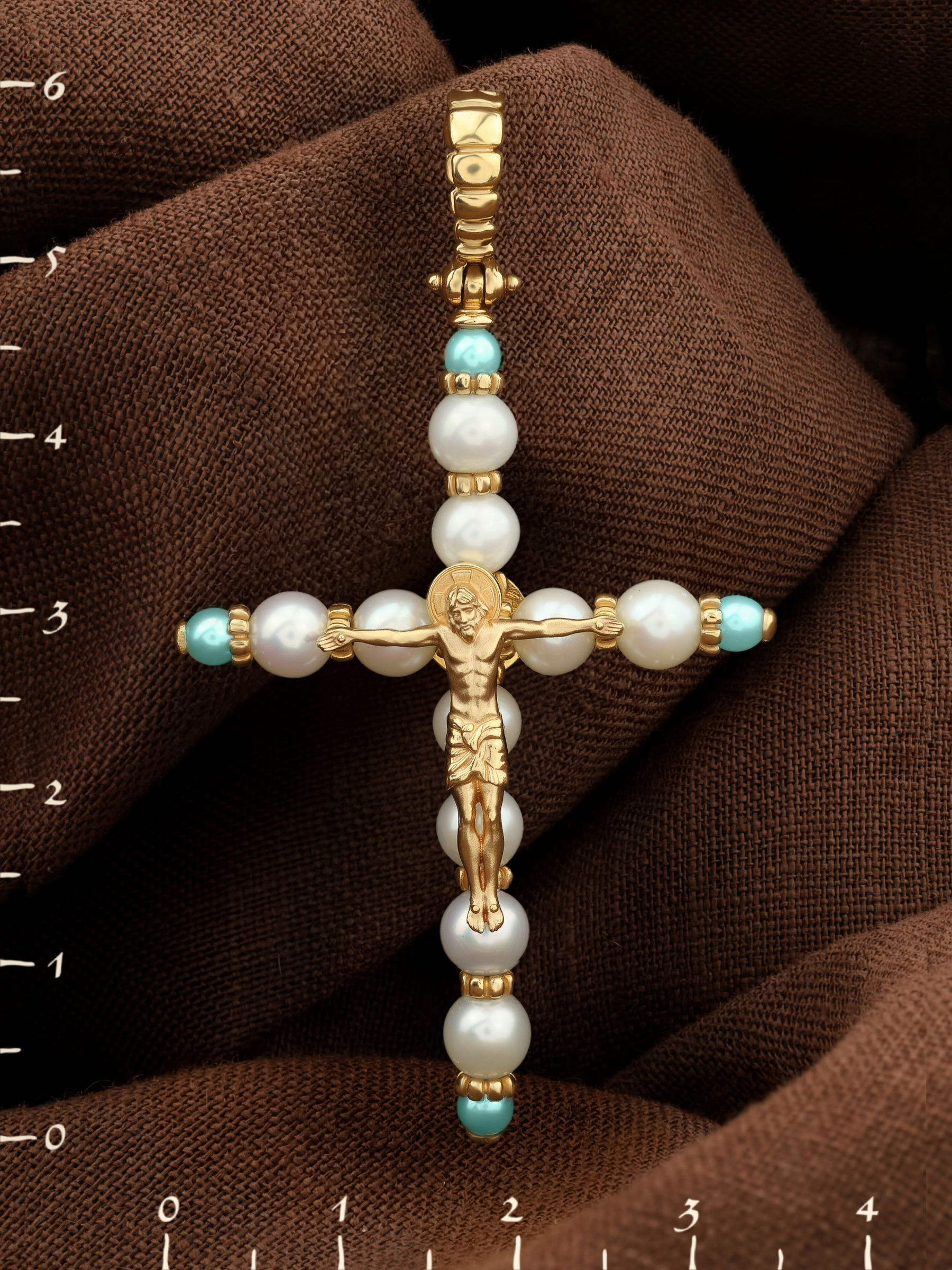 Крест из лимонного золота c жемчугом и бирюзой