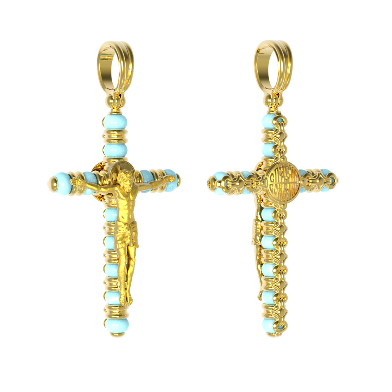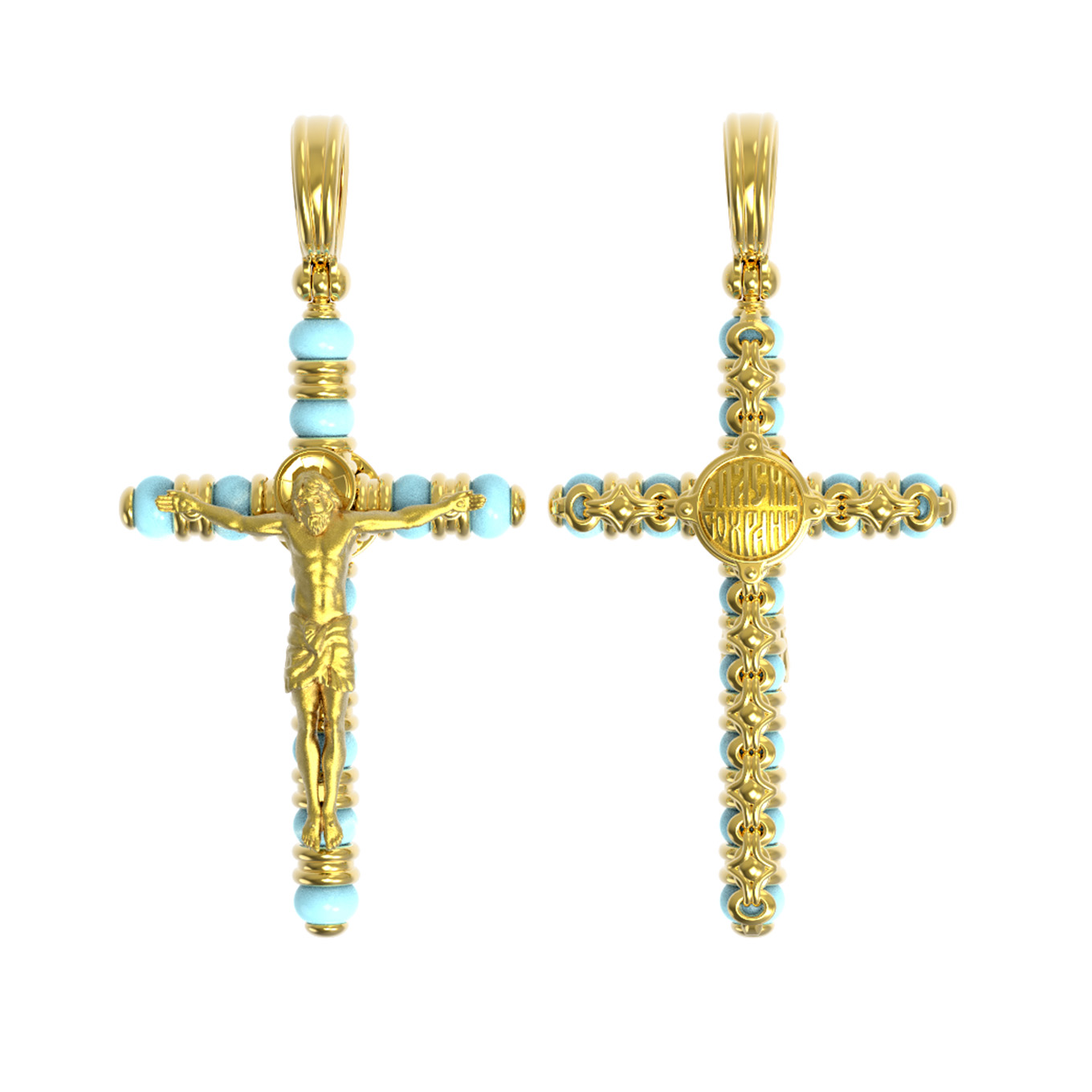 На лицевой стороне креста изображено Распятие Господа и Спасителя нашего Иисуса Христа. Своими крестными страданиями Господь смыл наши грехи, покрыл наш долг перед Богом или, на языке Писания, нас «искупил». В Голгофе сокрыта непостижимая тайна бесконечной правды и любви Бога. Крест стал символом победы добра над злом, жизни над смертью, напоминанием бесконечной Божьей любви, предметом радости. Воплотившийся Сын Божий Своею кровью освятил крест и сделал его проводником Своей благодати, источником освящения верующих. Господь сказал: кто хочет идти за Мною, отвергнись себя, и возьми крест свой, и следуй за Мною. (Мк. 8: 34). На православном кресте Христос не умирает, а свободно простирает руки, ладони Иисуса открыты, будто он хочет обнять все человечество, даря им свою любовь и открывая путь к вечной жизни.