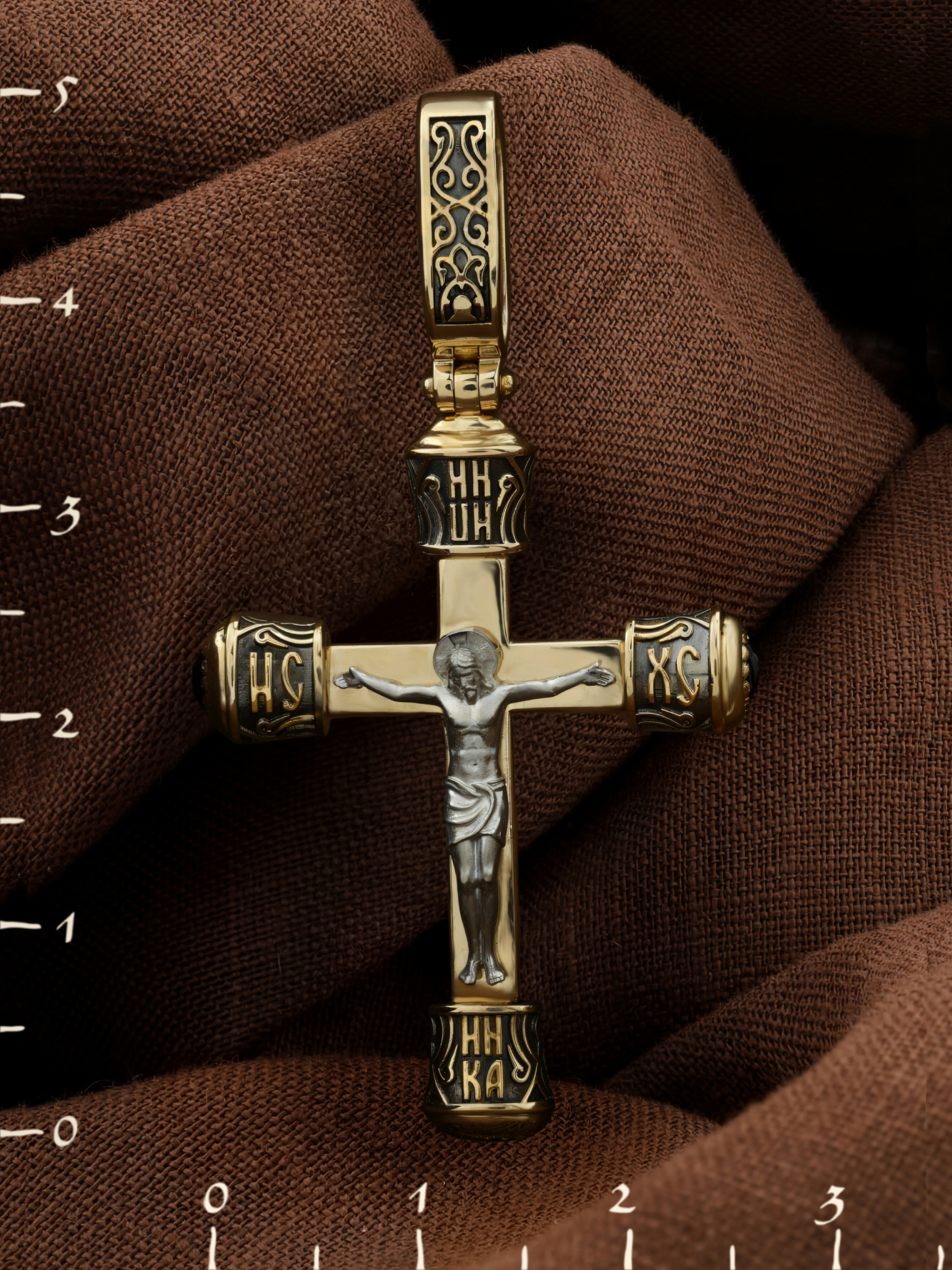 На лицевой стороне креста изображено Распятие Господа и Спасителя нашего Иисуса Христа. В Голгофе сокрыта непостижимая тайна бесконечной правды и любви Бога. Крест стал символом победы добра над злом, жизни над смертью, напоминанием бесконечной Божьей любви, предметом радости. Воплотившийся Сын Божий Своею кровью освятил крест и сделал его проводником Своей благодати, источником освящения верующих. Над распятием расположена надпись, составленная Понтием Пилатом — «ИНЦИ». Она означает «Иисус Назорей, Царь Иудейский». Надпись «ИС» «ХС» означает Иисус Христос и помещается на разных сторонах поперечной перекладины креста. В нижней части креста расположена «НИКА», что означает «победитель». На православном кресте Христос не умирает, а свободно простирает руки, ладони Иисуса открыты, будто он хочет обнять все человечество, даря им свою любовь и открывая путь к вечной жизни.