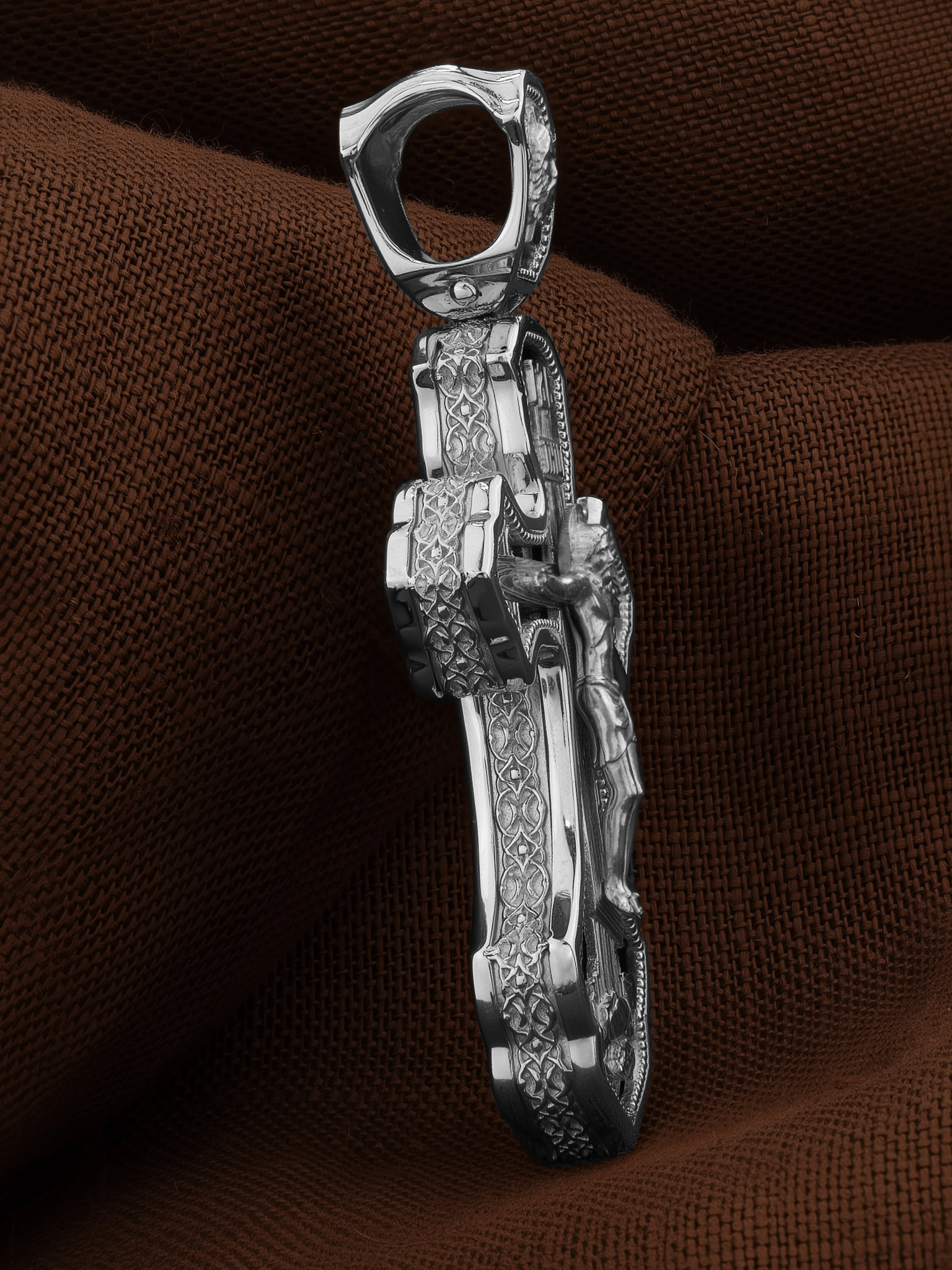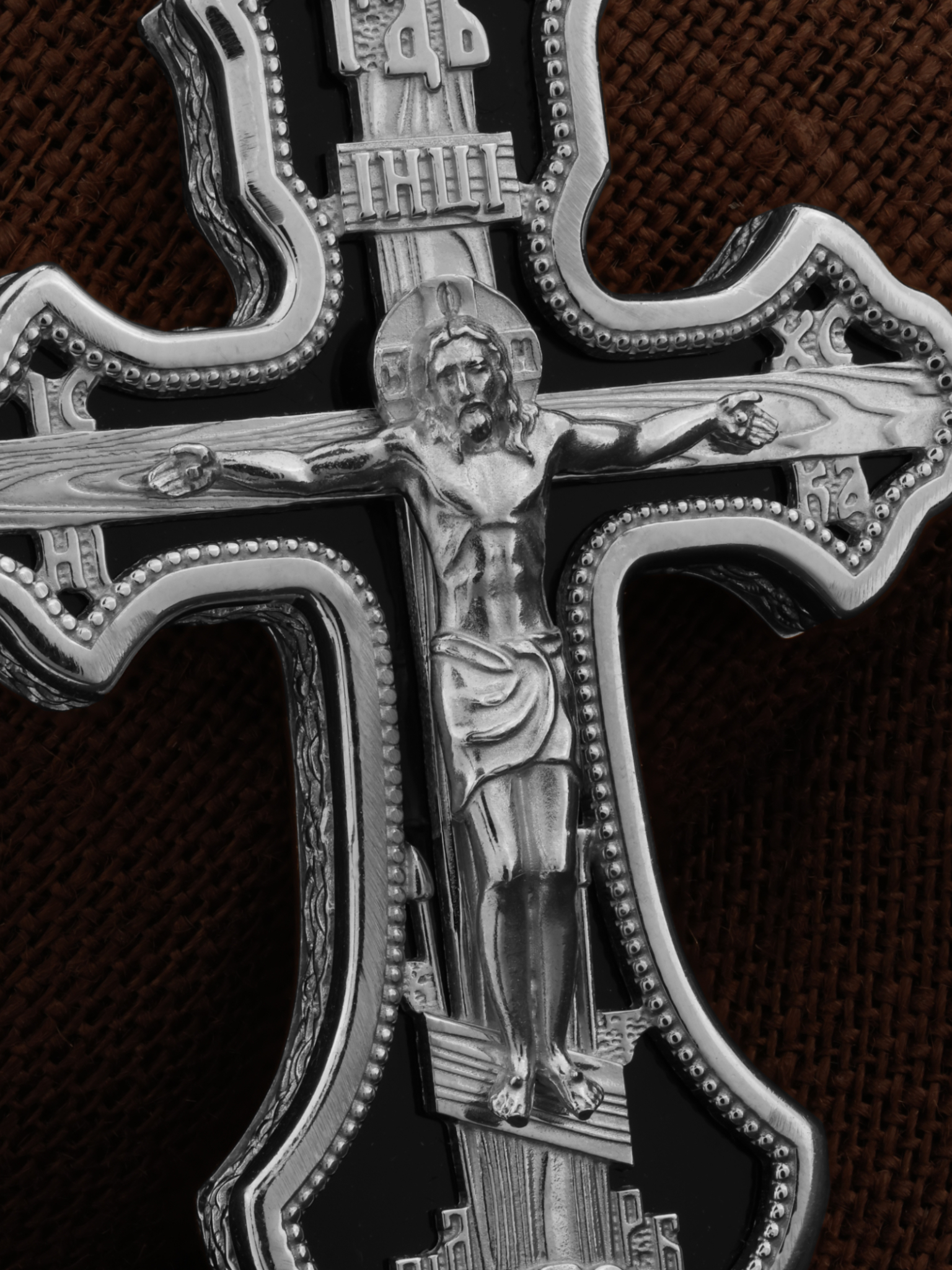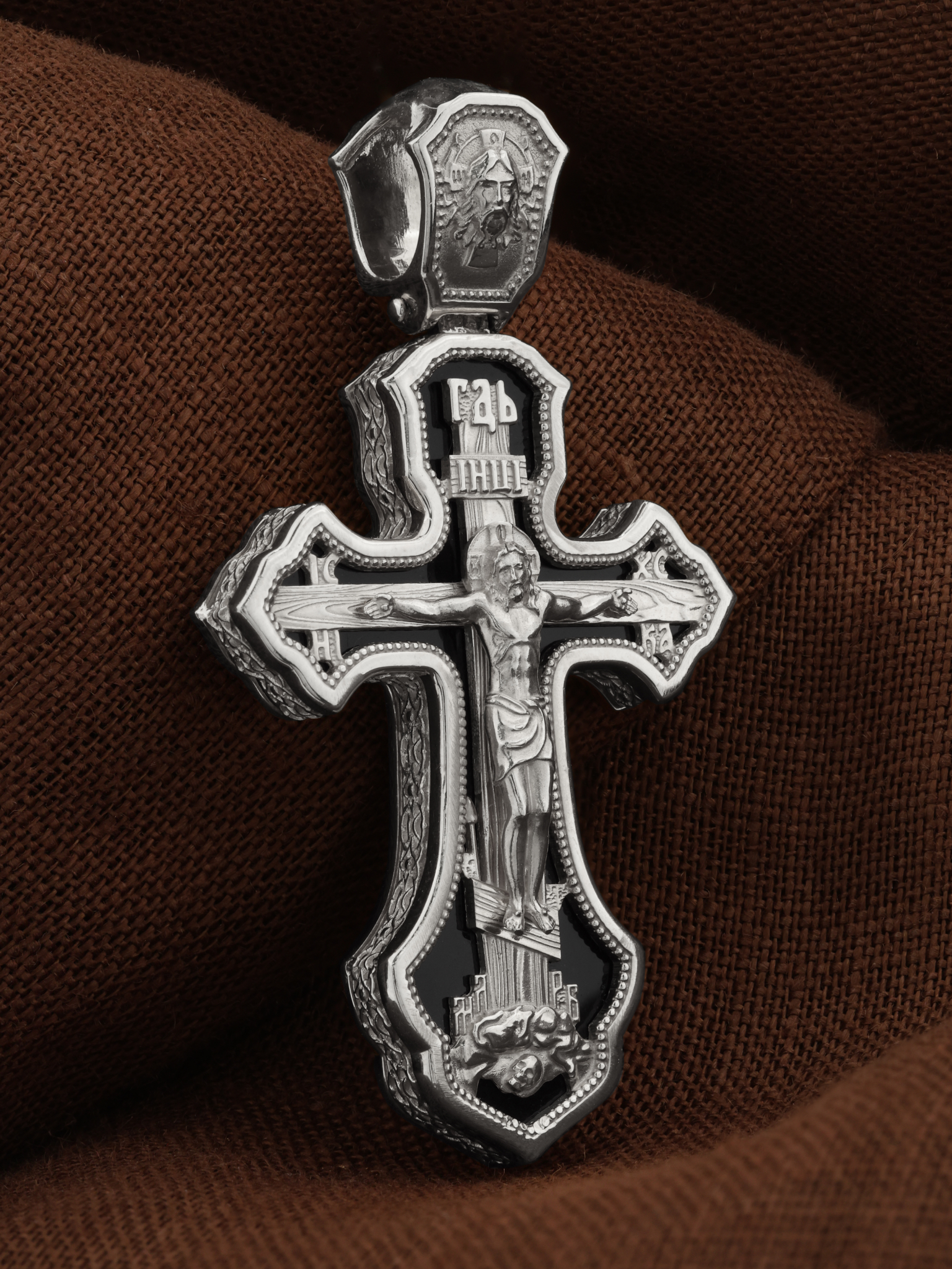 На лицевой стороне креста изображено Распятие Господа и Спасителя нашего Иисуса Христа. Христос, подвергнутый на кресте мучительной казни, своими страданиями искупил нас от древнего греха и даровал нам жизнь вечную. Без Распятия не было бы Воскресения Христова, и поэтому Крест из орудия казни обратился в святыню, в которой действует Благодать Божия. Распятие сопровождается каноническими надписями. Над Распятием размещена надпись «ГДЬ», что означает Господь. Верхняя перекладина символизирует титло — табличку, на которой, согласно Евангелию, расположена надпись, составленная Понтием Пилатом на трех языках — «IНЦI». Она означает «Иисус Назорей, Царь Иудейский». Надписи «IC» «ХC», что означает Иисус Христос, и «НИКА», что означает «победитель», помещаются на разных сторонах поперечной перекладины креста. Вдоль креста изображены копие сотника Лонгина и трость с губкой и буквы «К» и «Т». Надпись «МЛРБ» — «место лобное рай бысть», что означает место лобное стало раем, размещены в нижней части креста. Крест стоит на горе камней, символизирующих Голгофу. В ее основании различается череп — это голова Адама. На кулонном кольце изображен Нерукотворный образ Господа и Спасителя нашего Иисуса Христа, чудесно отпечатавшийся на плате, которым Христос вытер свой лик.