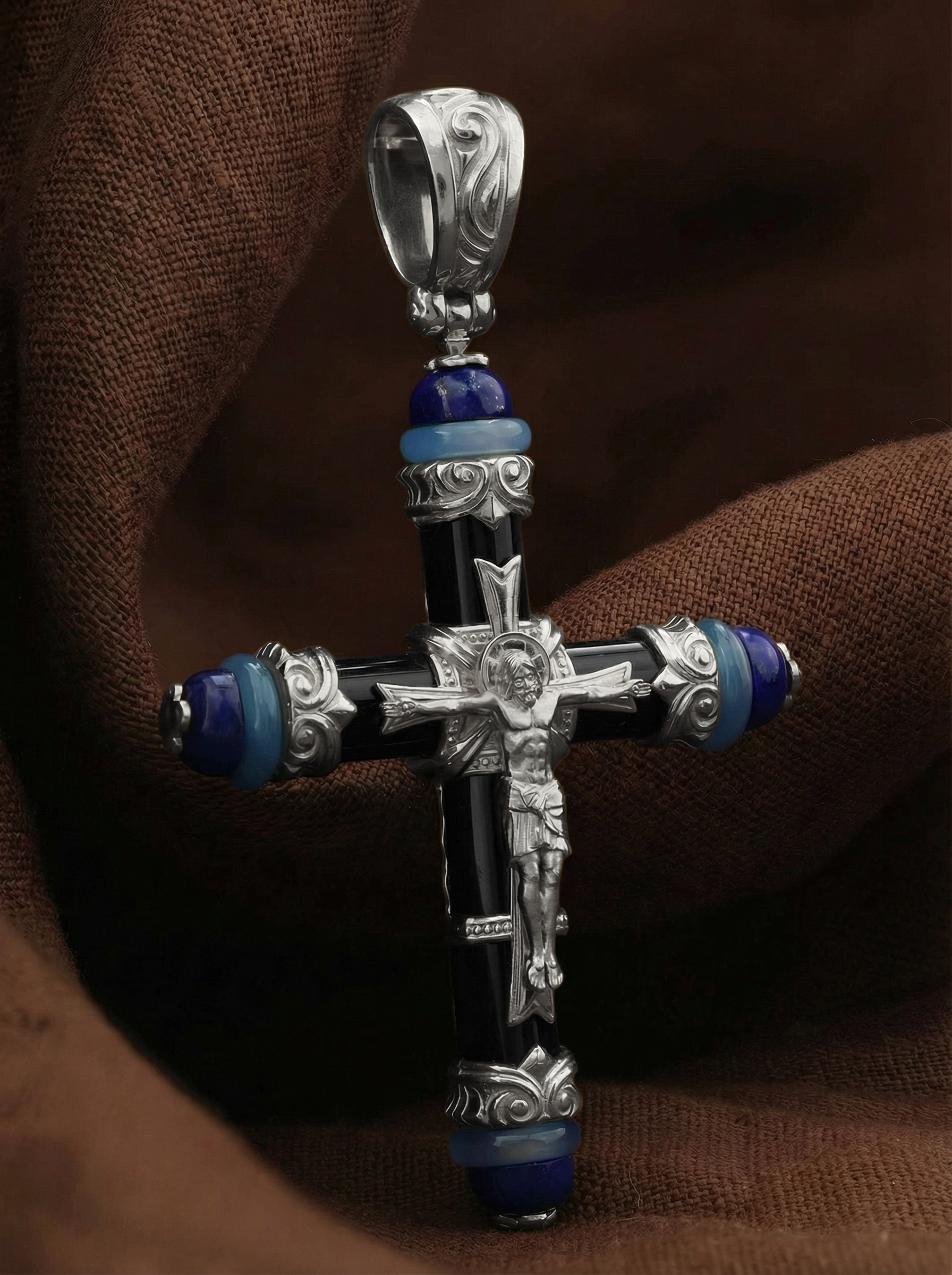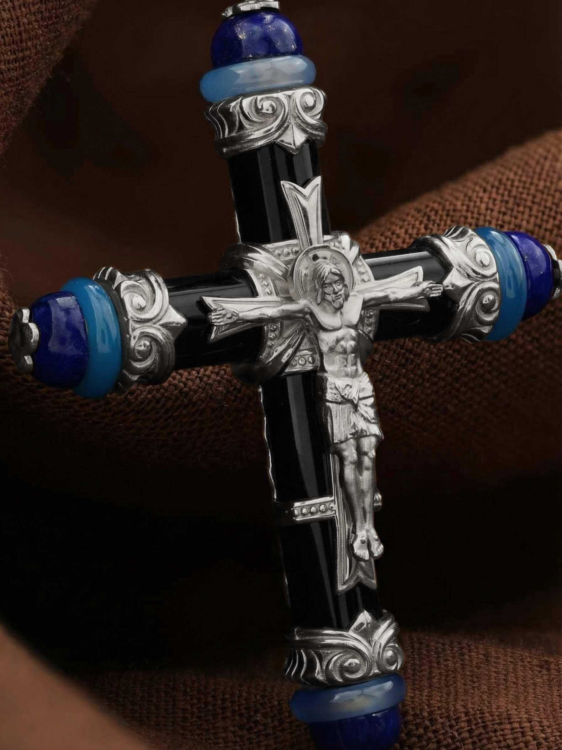 На лицевой стороне креста изображено Распятие Господа и Спасителя нашего Иисуса Христа. Своими крестными страданиями Господь смыл наши грехи, покрыл наш долг перед Богом или, на языке Писания, нас «искупил». В Голгофе сокрыта непостижимая тайна бесконечной правды и любви Бога. Крест стал символом победы добра над злом, жизни над смертью, напоминанием бесконечной Божьей любви, предметом радости. Воплотившийся Сын Божий Своею кровью освятил крест и сделал его проводником Своей благодати, источником освящения верующих. Христос в Своей Божественной любви, над которой смерть не властна и которая, страдая, и не страдает в обычном смысле, простирает к людям со Креста Свои объятия, в которые призывается и привлекается весь мир. Поэтому Тело Его не висит, а торжественно покоится на Кресте.
