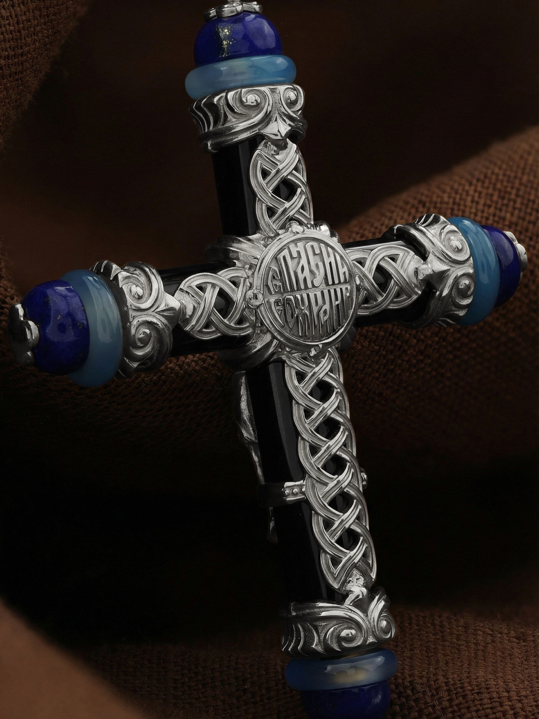 На оборотной стороне креста написана молитва: «Спаси и сохрани». Крест украшен орнаментом.