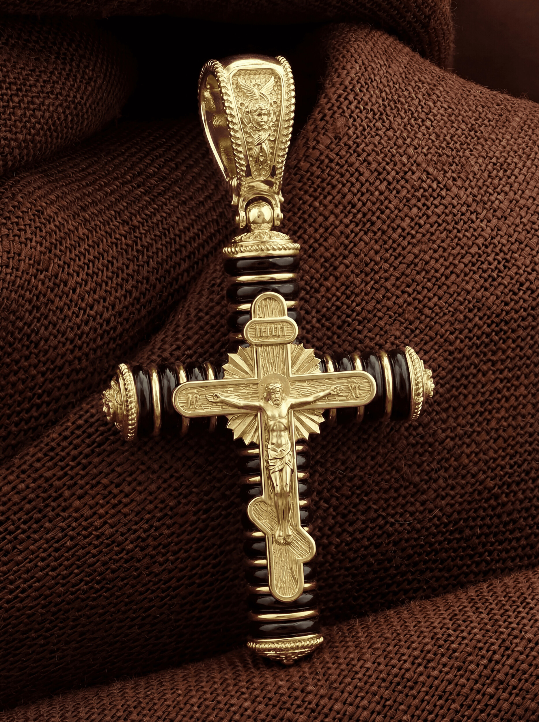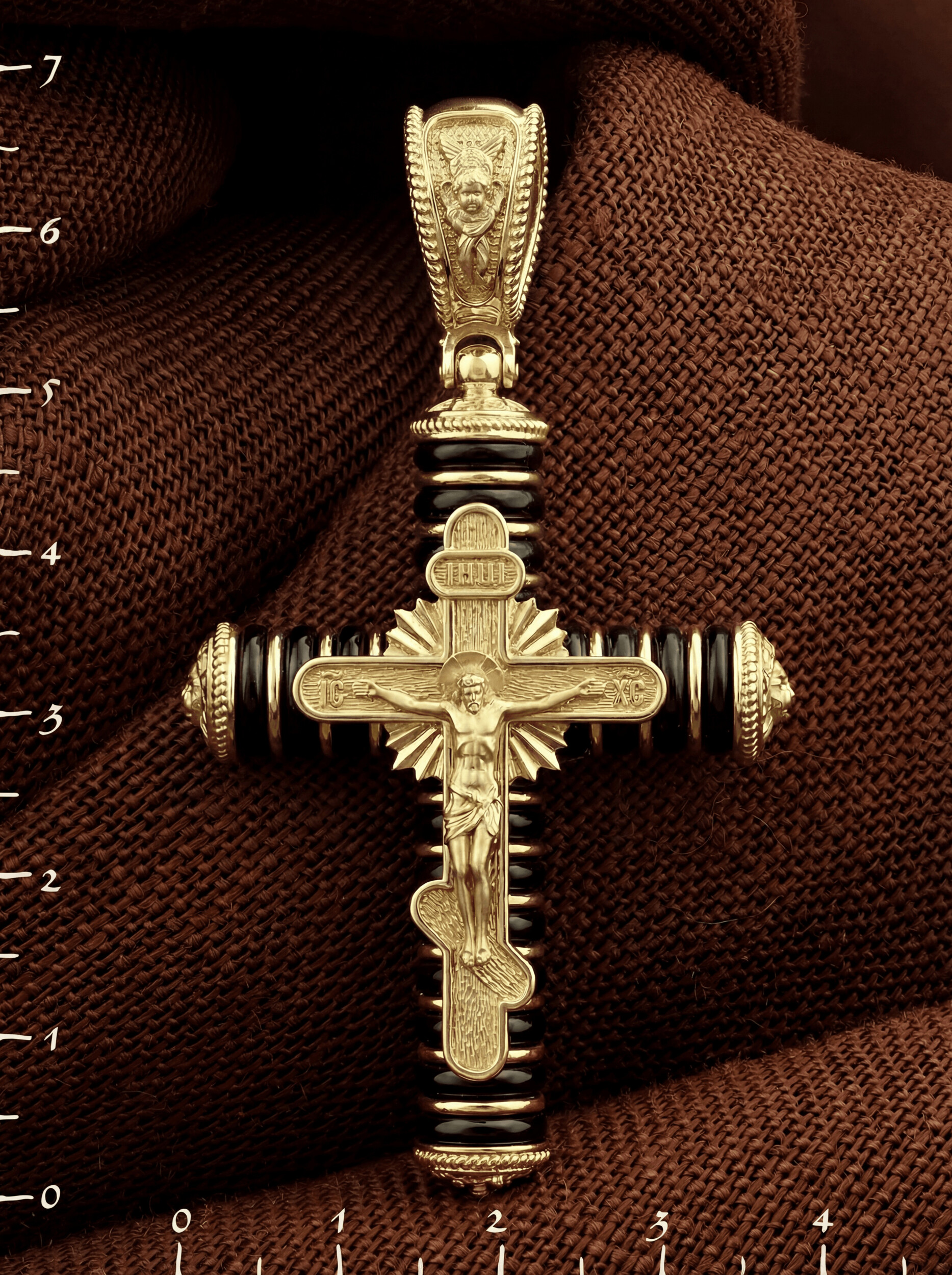 На лицевой стороне креста изображено Распятие Господа и Спасителя нашего Иисуса Христа. Своими крестными страданиями Господь смыл наши грехи, покрыл наш долг перед Богом или, на языке Писания, нас «искупил». В Голгофе сокрыта непостижимая тайна бесконечной правды и любви Бога. Крест стал символом победы добра над злом, жизни над смертью, напоминанием бесконечной Божьей любви, предметом радости. Воплотившийся Сын Божий Своею кровью освятил крест и сделал его проводником Своей благодати, источником освящения верующих. На верхней табличке, выше головы Иисуса, расположена надпись, составленная Понтием Пилатом — «IНЦI». Она означает «Иисус Назорей, Царь Иудейский». Надпись «IC» «ХC», означает Иисус Христос, помещаются на разных сторонах поперечной перекладины креста. Христос в Своей Божественной любви, над которой смерть не властна и которая, страдая, и не страдает в обычном смысле, простирает к людям со Креста Свои объятия, в которые призывается и привлекается весь мир. Поэтому Тело Его не висит, а торжественно покоится на Кресте. На кулонном кольце изображен шестикрылый Серафим. Серафим означает «Пламенный». Горя любовью к Богу, он зажигает огонь этой любви и в сердцах людей.