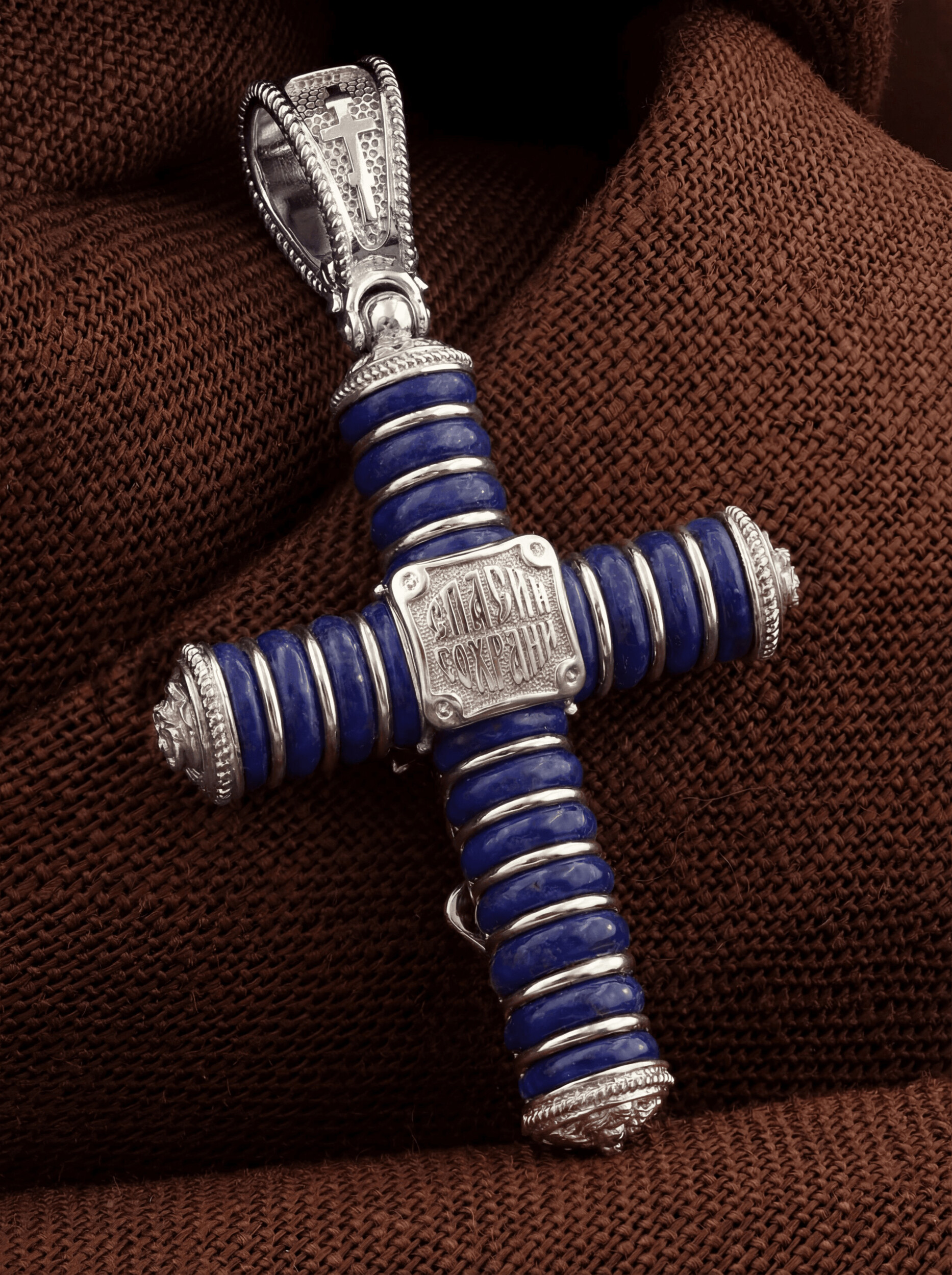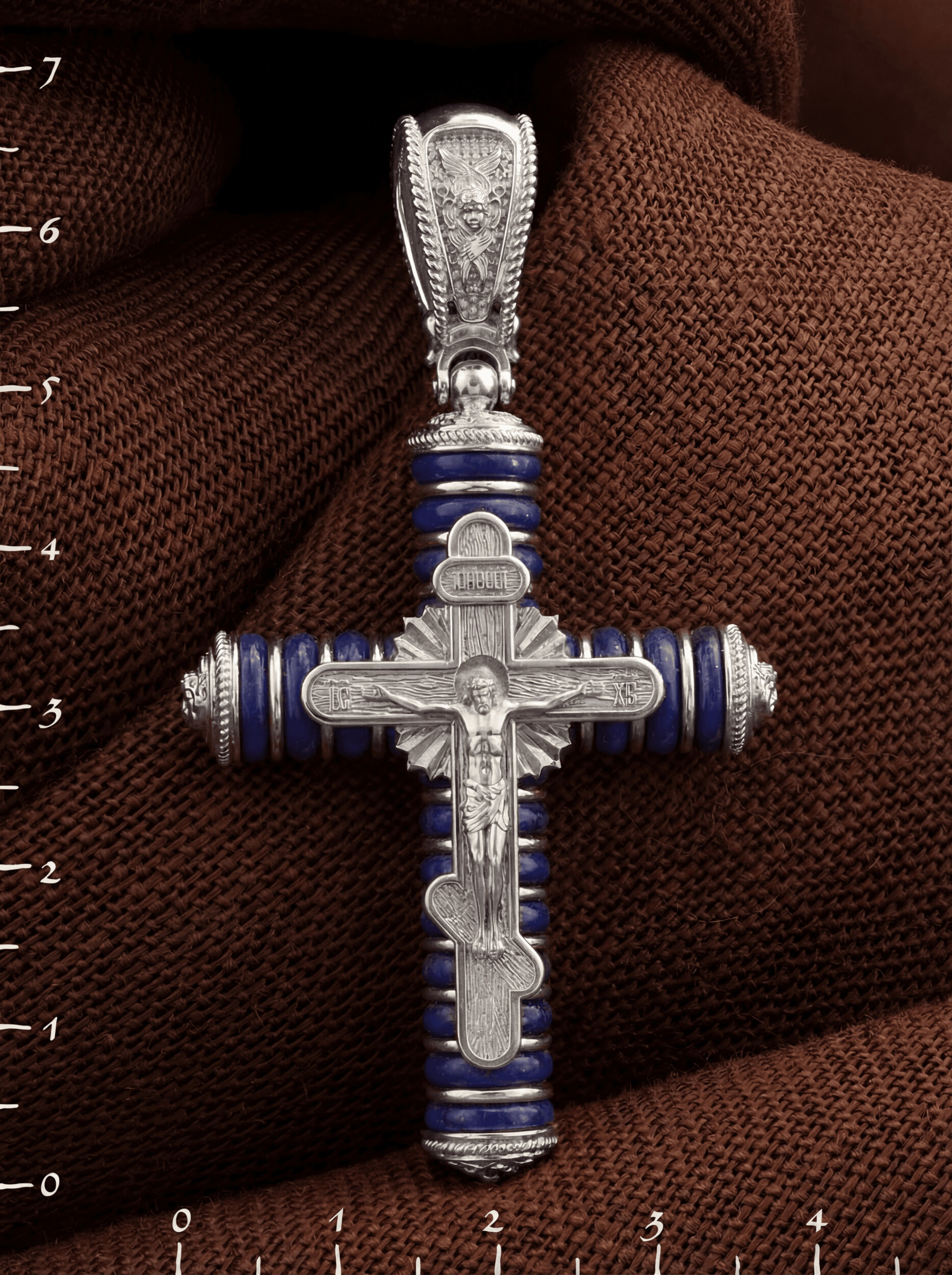 На лицевой стороне креста изображено Распятие Господа и Спасителя нашего Иисуса Христа. Своими крестными страданиями Господь смыл наши грехи, покрыл наш долг перед Богом или, на языке Писания, нас «искупил». В Голгофе сокрыта непостижимая тайна бесконечной правды и любви Бога. Крест стал символом победы добра над злом, жизни над смертью, напоминанием бесконечной Божьей любви, предметом радости. Воплотившийся Сын Божий Своею кровью освятил крест и сделал его проводником Своей благодати, источником освящения верующих. На верхней табличке, выше головы Иисуса, расположена надпись, составленная Понтием Пилатом — «IНЦI». Она означает «Иисус Назорей, Царь Иудейский». Надпись «IC» «ХC», означает Иисус Христос, помещаются на разных сторонах поперечной перекладины креста. Христос в Своей Божественной любви, над которой смерть не властна и которая, страдая, и не страдает в обычном смысле, простирает к людям со Креста Свои объятия, в которые призывается и привлекается весь мир. Поэтому Тело Его не висит, а торжественно покоится на Кресте. На кулонном кольце изображен шестикрылый Серафим. Серафим означает «Пламенный». Горя любовью к Богу, он зажигает огонь этой любви и в сердцах людей.