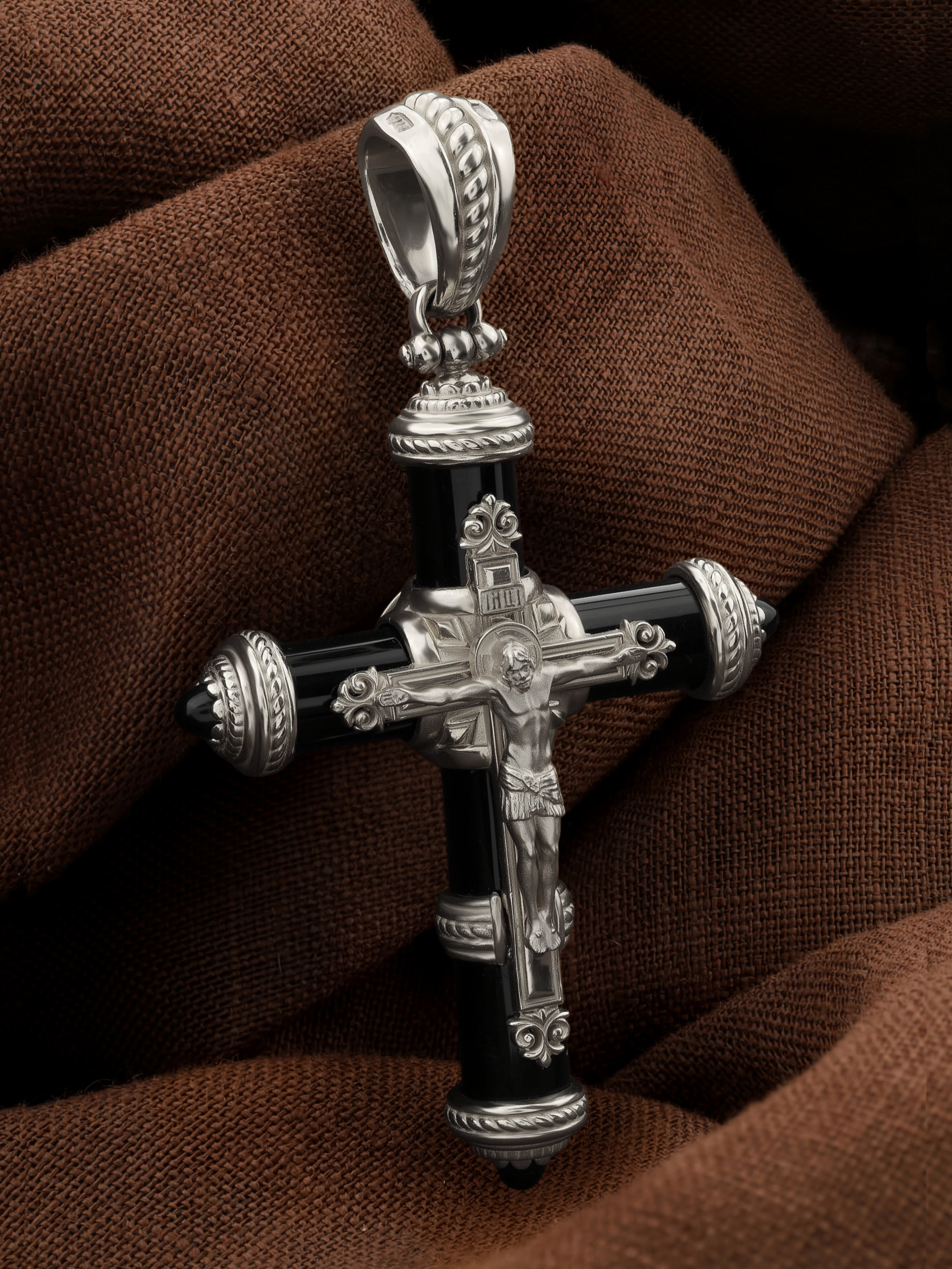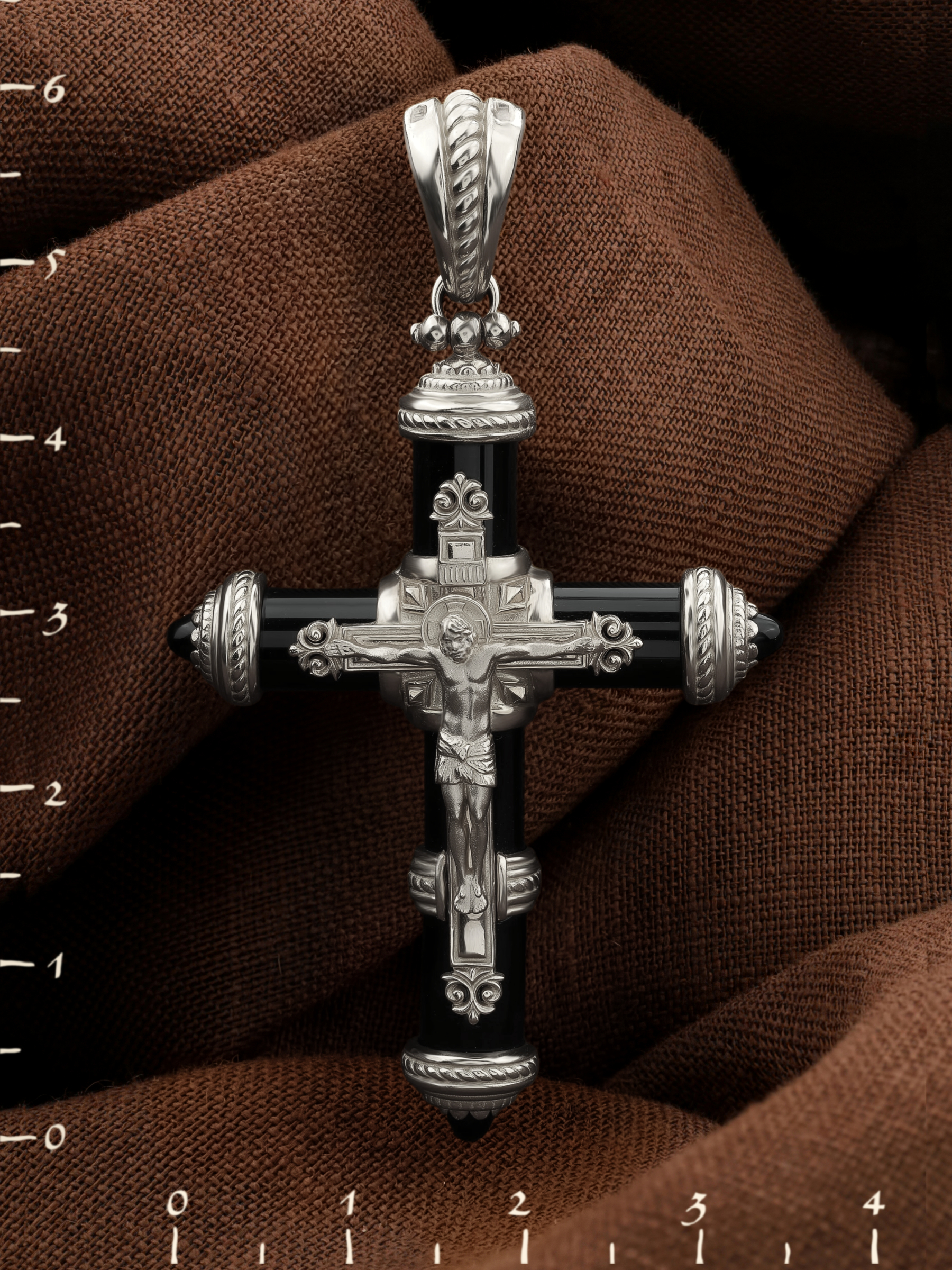На лицевой стороне креста изображено Распятие Господа и Спасителя нашего Иисуса Христа. Своими крестными страданиями Господь смыл наши грехи, покрыл наш долг перед Богом или, на языке Писания, нас «искупил». В Голгофе сокрыта непостижимая тайна бесконечной правды и любви Бога. Крест стал символом победы добра над злом, жизни над смертью, напоминанием бесконечной Божьей любви, предметом радости. Воплотившийся Сын Божий Своею кровью освятил крест и сделал его проводником Своей благодати, источником освящения верующих. На верхней табличке, выше головы Иисуса, расположена надпись, составленная Понтием Пилатом — «IНЦI». Она означает «Иисус Назорей, Царь Иудейский». Надпись «IC» «ХC», означает Иисус Христос, помещаются на разных сторонах поперечной перекладины креста. Христос в Своей Божественной любви, над которой смерть не властна и которая, страдая, и не страдает в обычном смысле, простирает к людям со Креста Свои объятия, в которые призывается и привлекается весь мир. Поэтому Тело Его не висит, а торжественно покоится на Кресте.